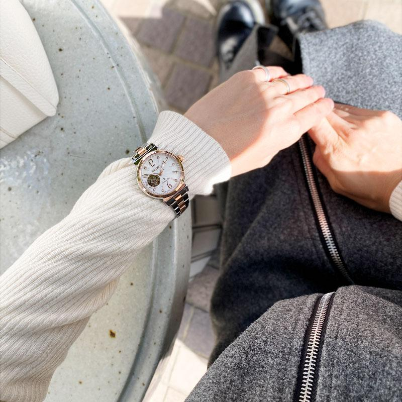 9點鐘位置的鏤空設計,讓人能欣賞到機械錶的運作,另外在其左側則有水晶玻璃的點綴,設計可愛但不過分甜美,展現成熟氣質。