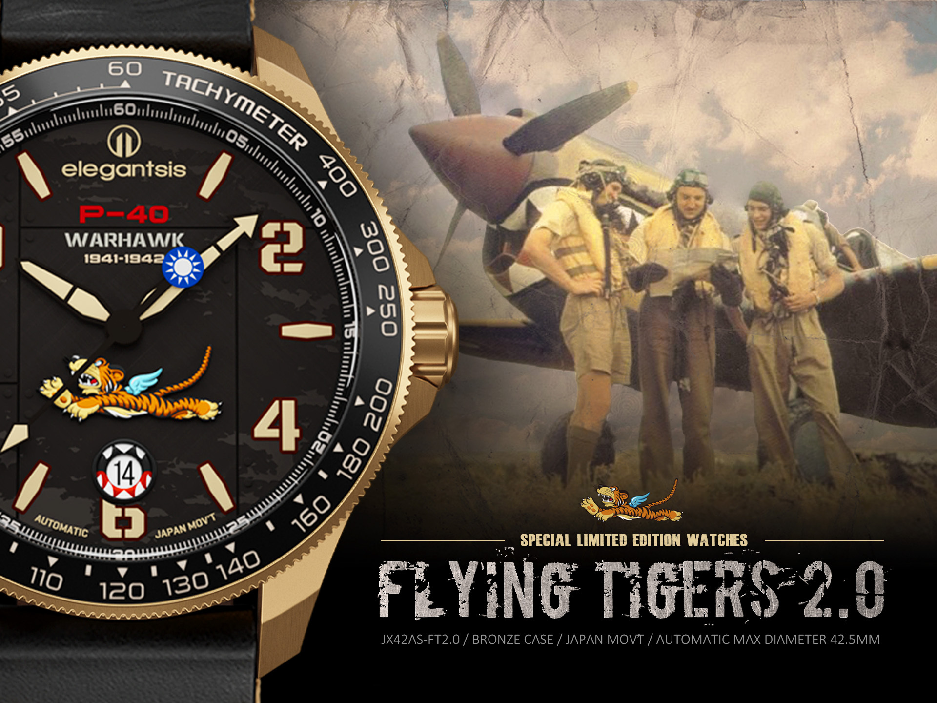 萬年鐘錶 - elegantsis 愛樂時 2.0飛虎隊青銅錶殼限量機械腕錶-黑色 ELJX42AS-FT2.0-9B01LC 錶徑42.5MM