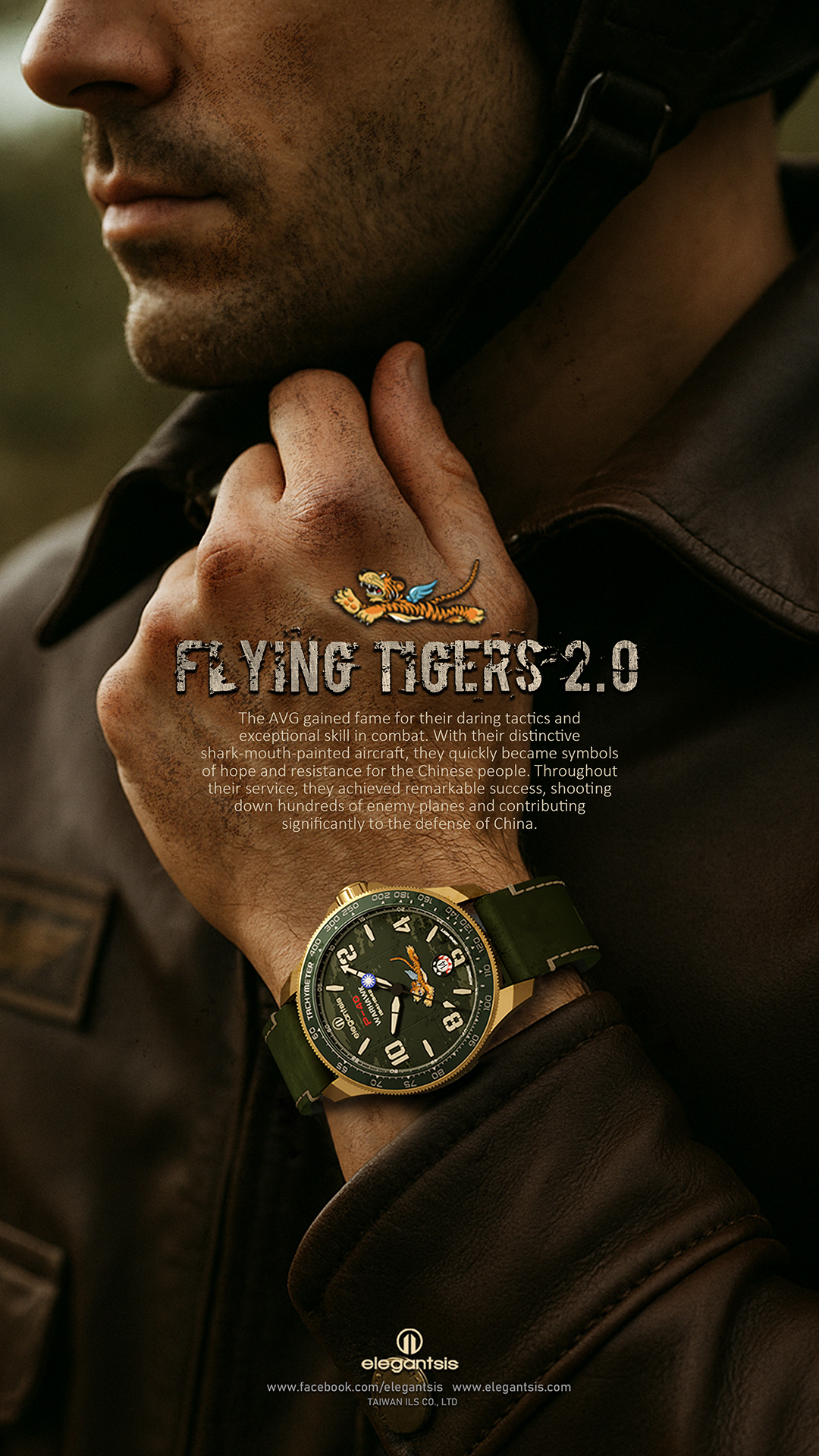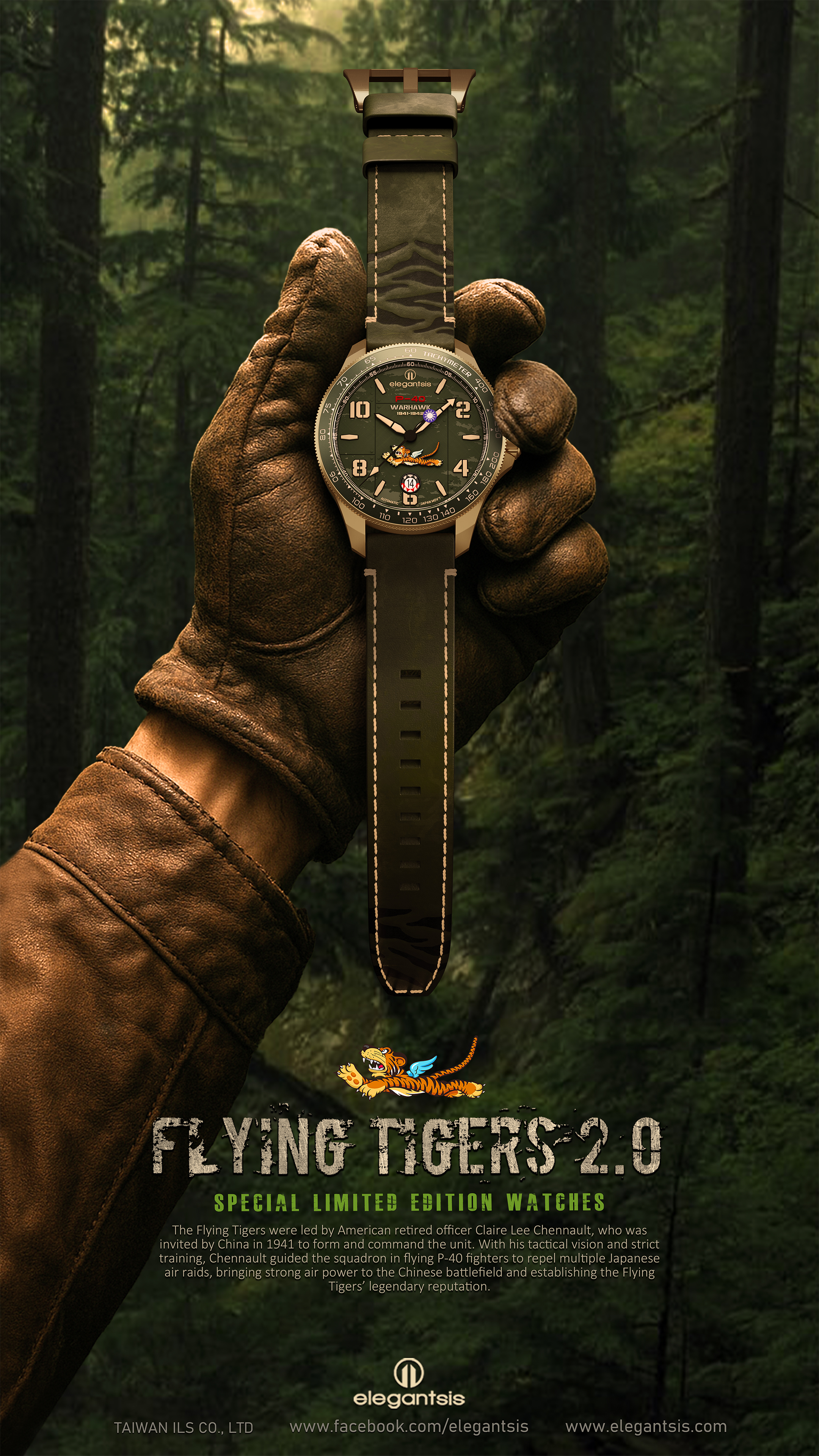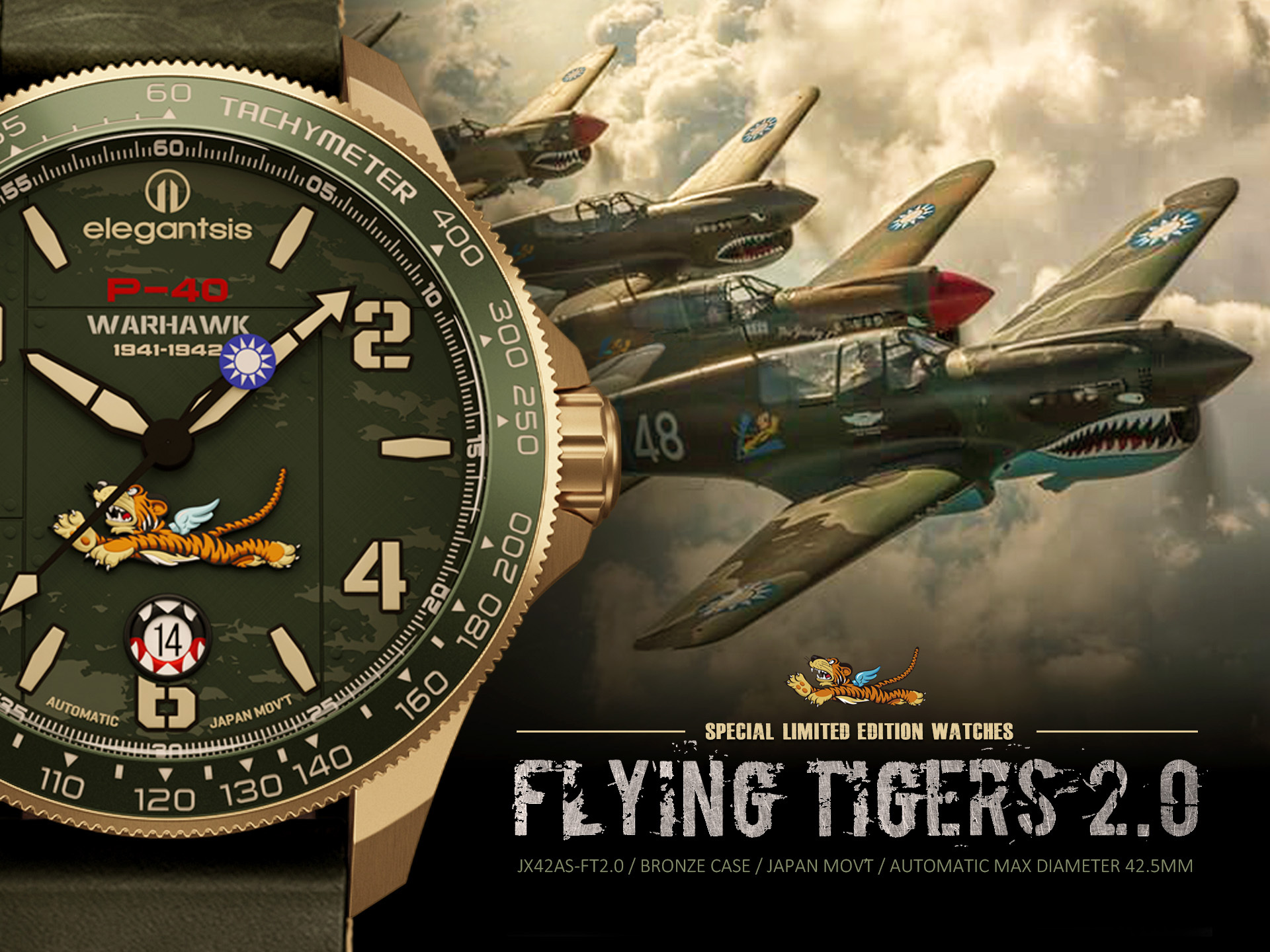 萬年鐘錶 - elegantsis 愛樂時 2.0飛虎隊青銅錶殼限量機械腕錶-軍綠色 ELJX42AS-FT2.0-9G02LC 錶徑42.5MM
