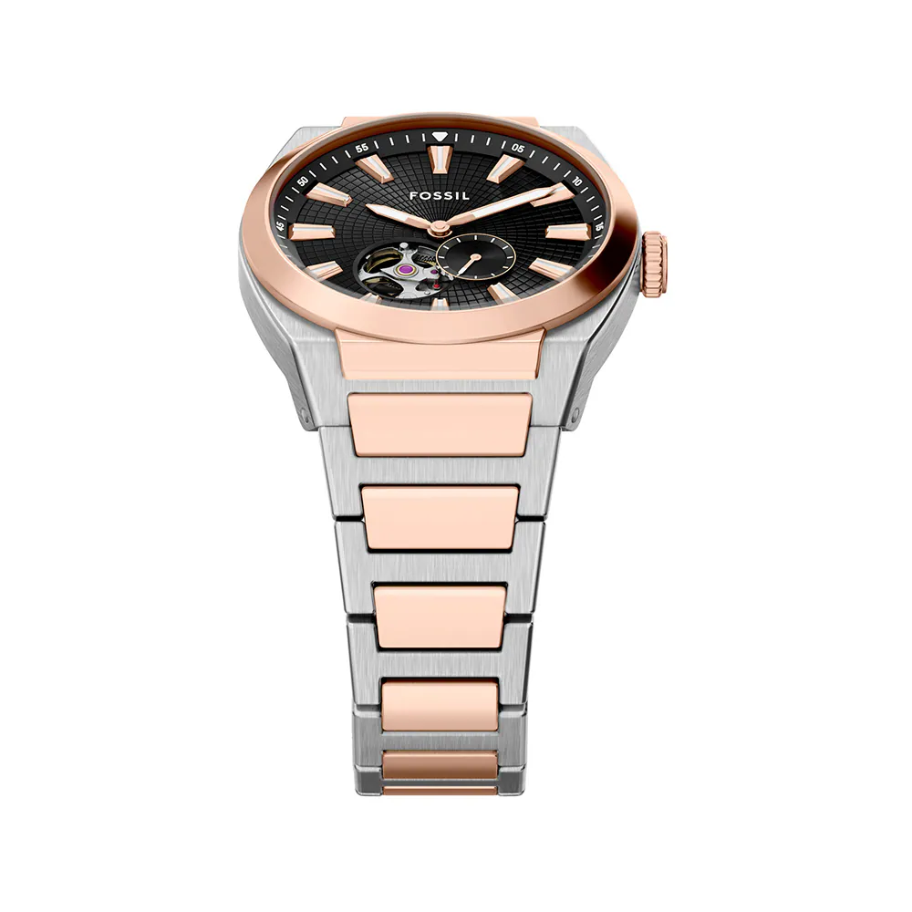 Everett 自動機械錶散發著毫不費力的時尚感。這款運動玫瑰金色和不鏽鋼雙色腕錶在休閒酷感與精緻成熟之間取得平衡。42mm 圓形不鏽鋼錶殼內,黑色放射紋鏤空錶盤增添了現代靈感。搭載自動機芯,可透過錶盤和透明底蓋看到。這款腕錶無需電池即可運行,並透過設計突顯了精密的機械結構。戴上這款經典配件,迎接任何挑戰。