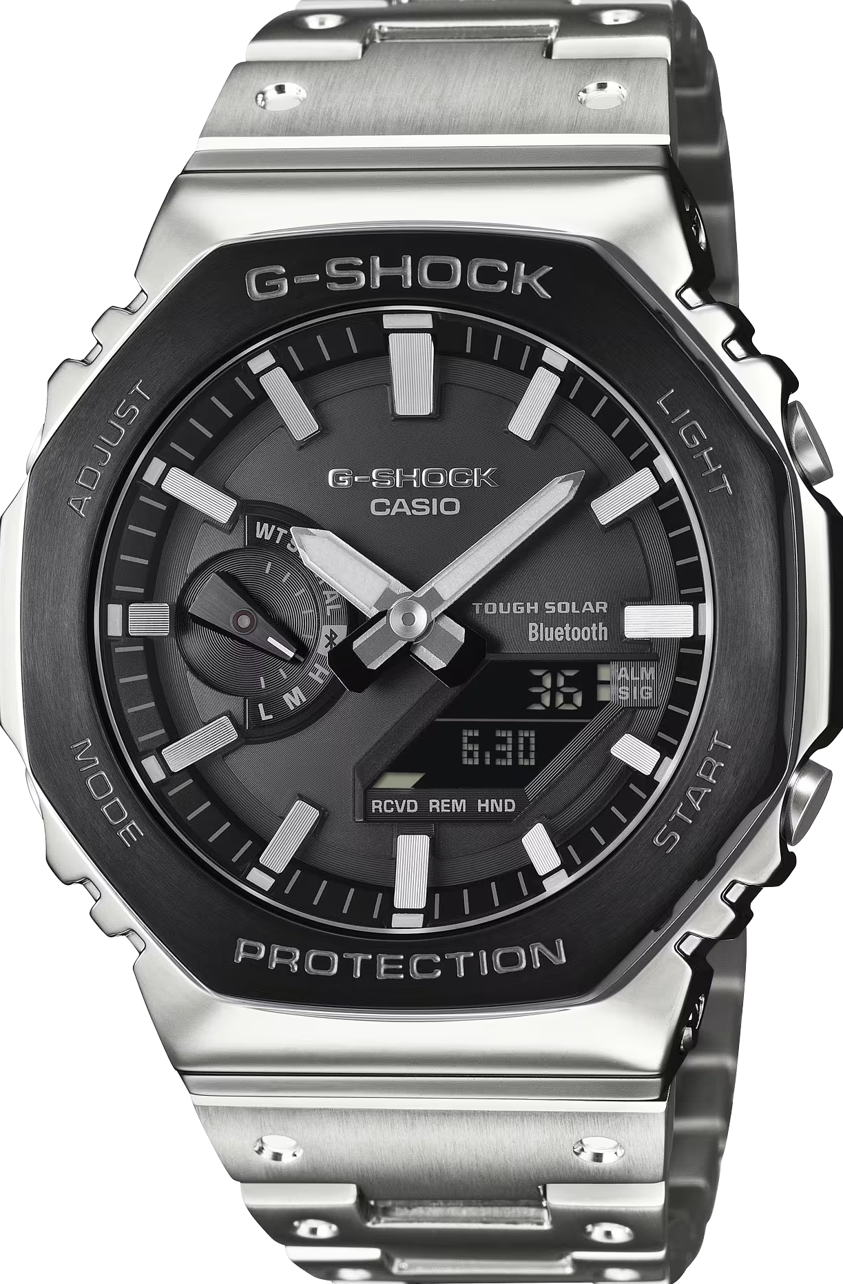 GM-B2100BT 的錶圈上半部採用髮絲紋處理,流露頂級的金屬優雅質感。時標採用銀色蒸鍍技術處理以強化能見度,並與錶盤形成優美對比。