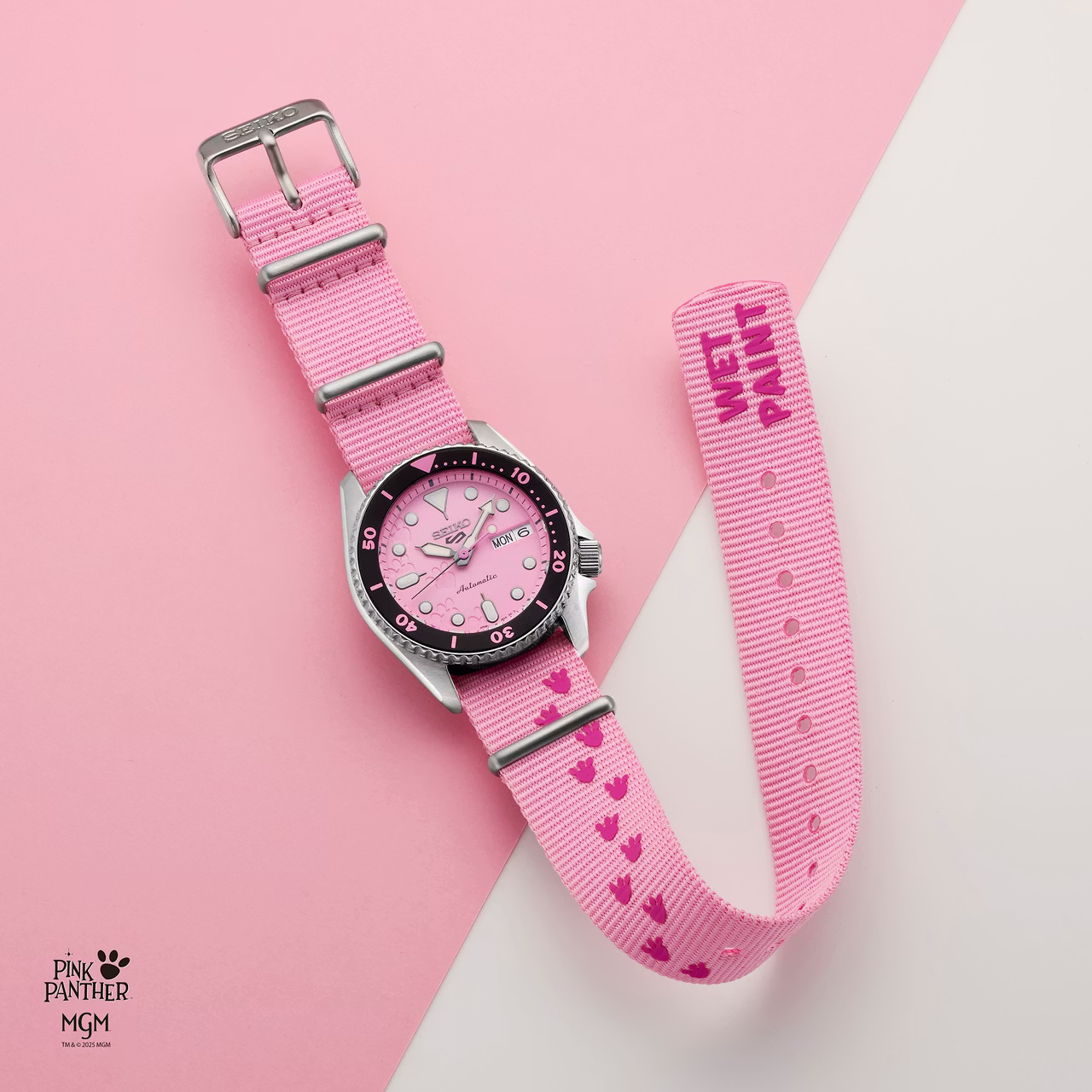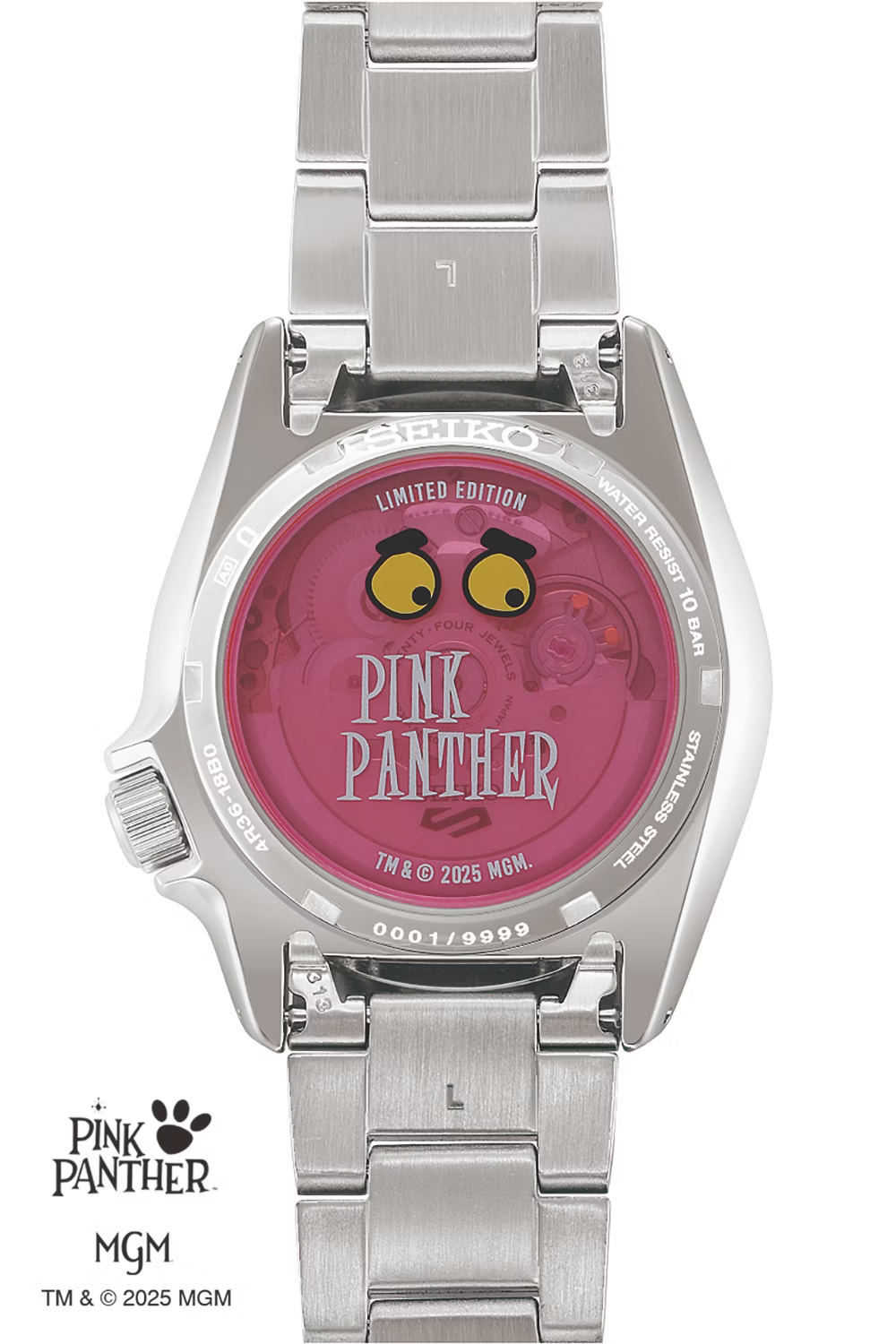腕錶以廣受歡迎的SKX 系列為基礎,面盤汲取動畫《The Pink Phink》中的劇情,將粉紅豹與死對頭「大鼻子先生」之間,為了搗蛋,粉紅豹偷偷將藍色房子漆成粉紅色的情節,巧妙濃縮於方寸面盤之中:面盤上印有引領大鼻子先生發現真相的粉紅腳印,彷彿粉紅豹剛從面盤上溜過。除此之外,錶圈刻度與秒針皆採用標誌性的「粉紅豹色」為主調,展現角色調皮的獨特魅力,為腕錶增添了生動的故事感。