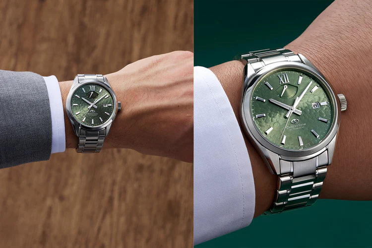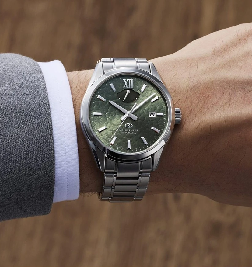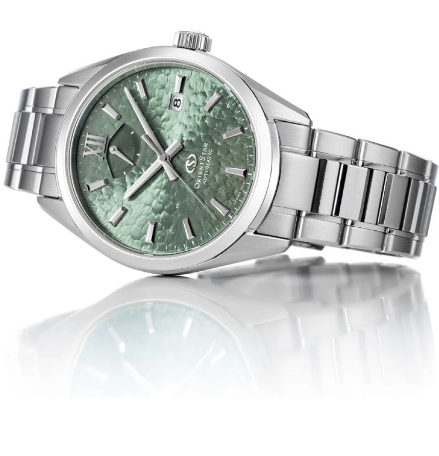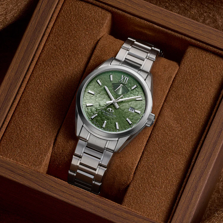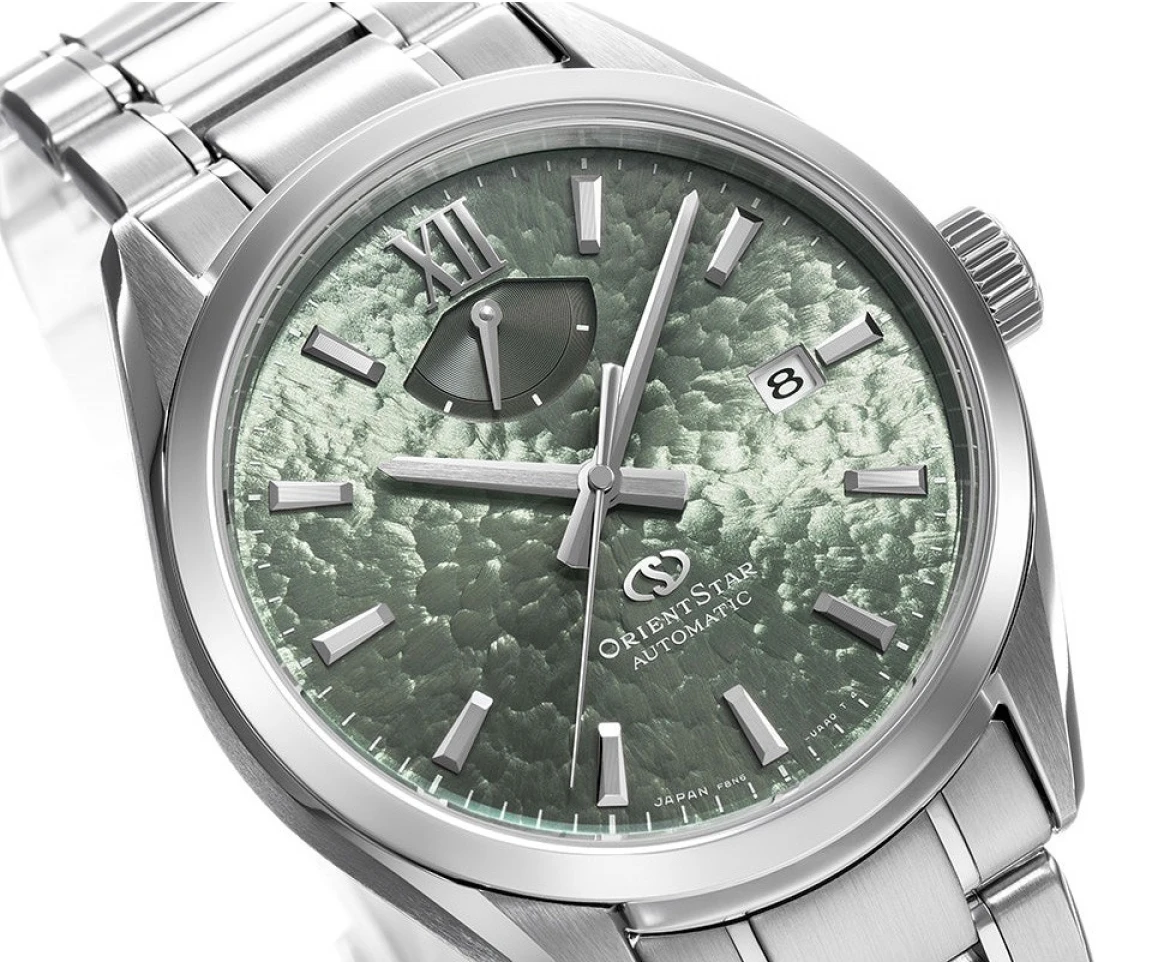 信州時之匠工坊製作的流星雨錶盤。這一款M34 F8 Date的錶盤與Grand Seiko一樣由The Shinshu Watch Studio信洲時之匠工坊製作。設計的靈感來自Perseid meteor shower英仙座流星雨,通過日本匠人手工雕刻模具,以壓鑄方式呈現出流星雨的獨特畫面。在2025年春夏季再度添置新成員,用綠色錶盤展現出令人心醉的宇宙奇景。