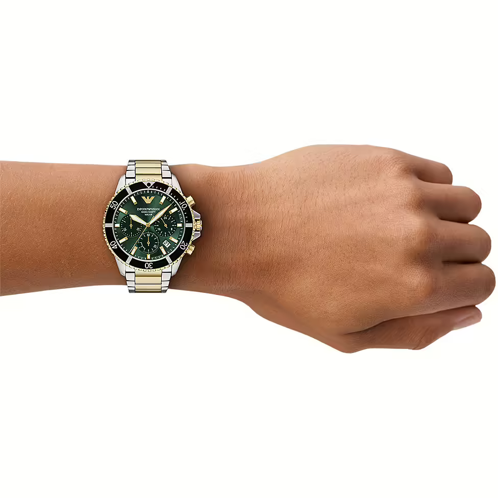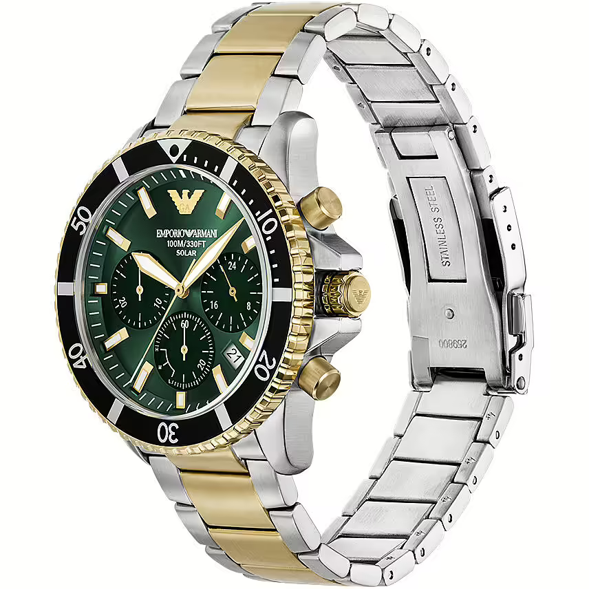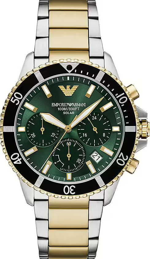 • 亞曼尼 精品腕錶  太陽能紳士經典綠金三眼不鏽鋼男錶 AR11695