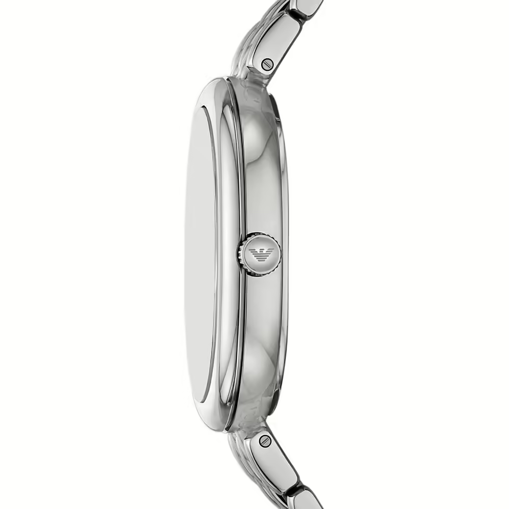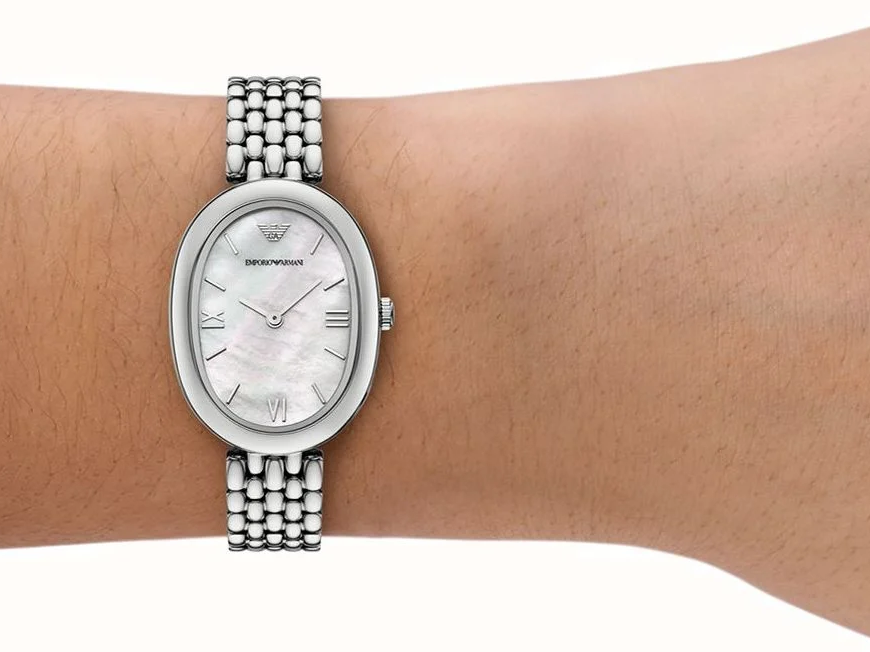 • 萬年鐘錶 - ARMANI   橢圓月光貝殼面盤簡約指針不鏽鋼女錶 AR11706    錶徑34MM
