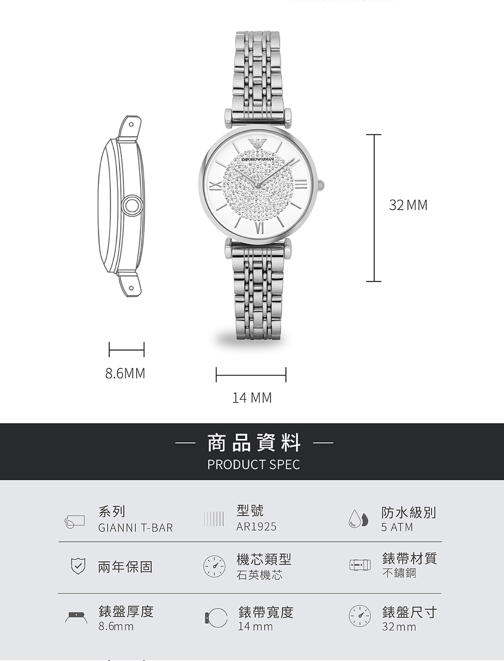 萬年鐘錶 - ARMANI 滿天星晶鑽女錶 AR1925 錶徑32MM