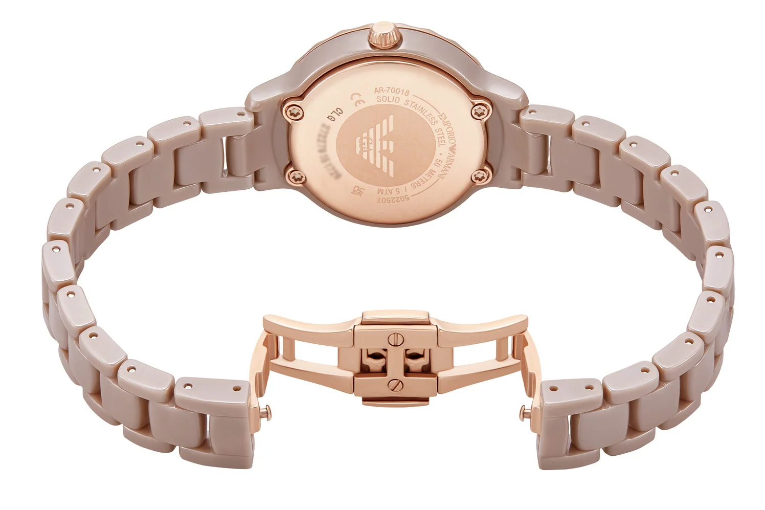 萬年鐘錶 - ARMANI 珍珠母貝面盤沙色陶瓷錶帶女錶 AR70018 錶徑32MM