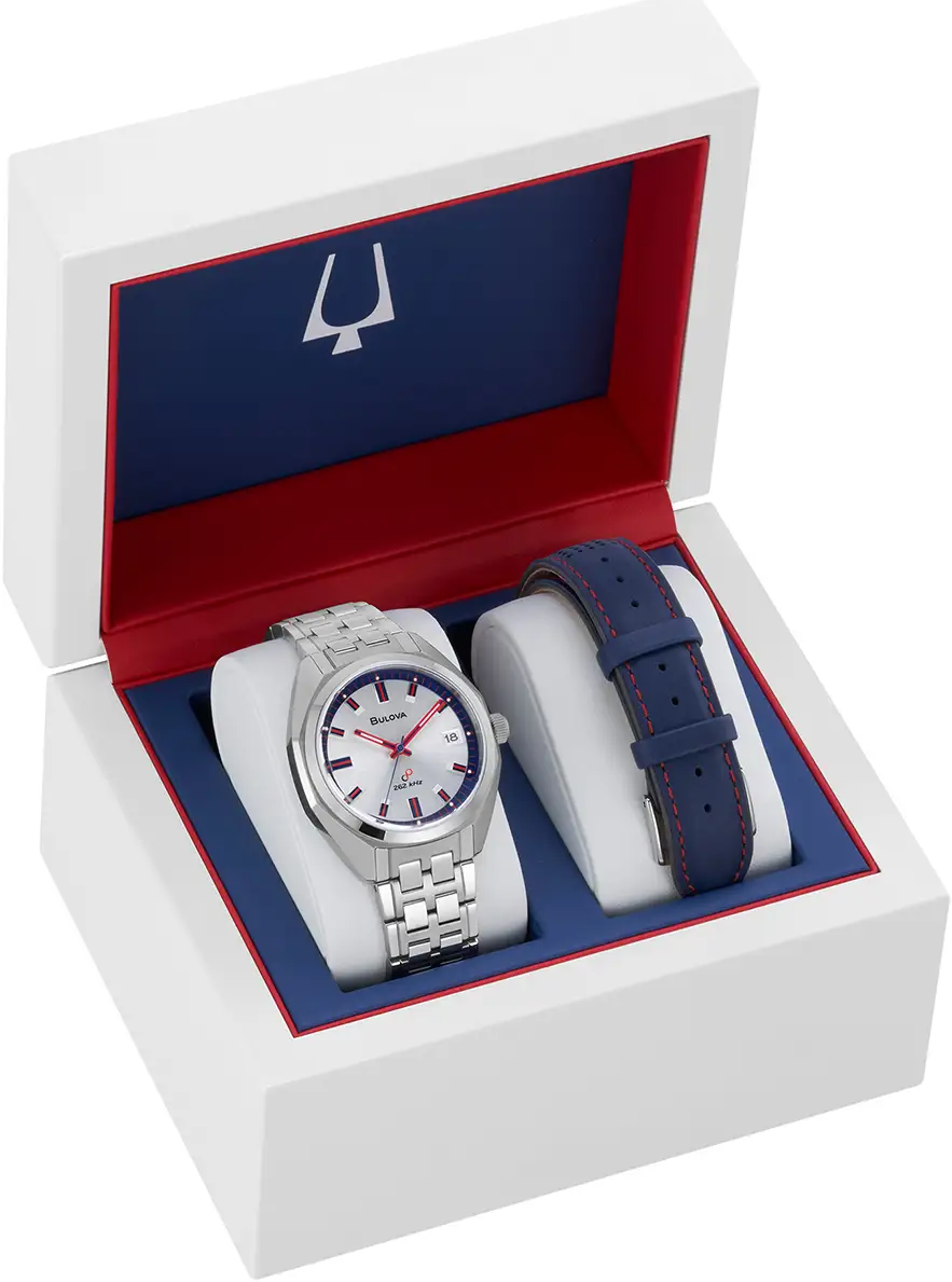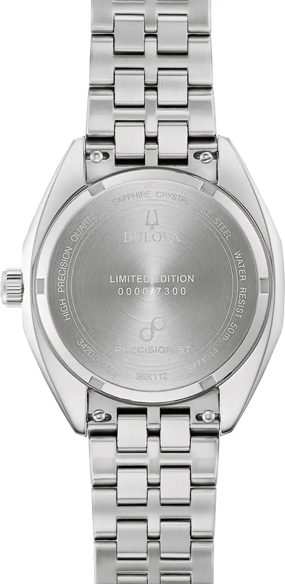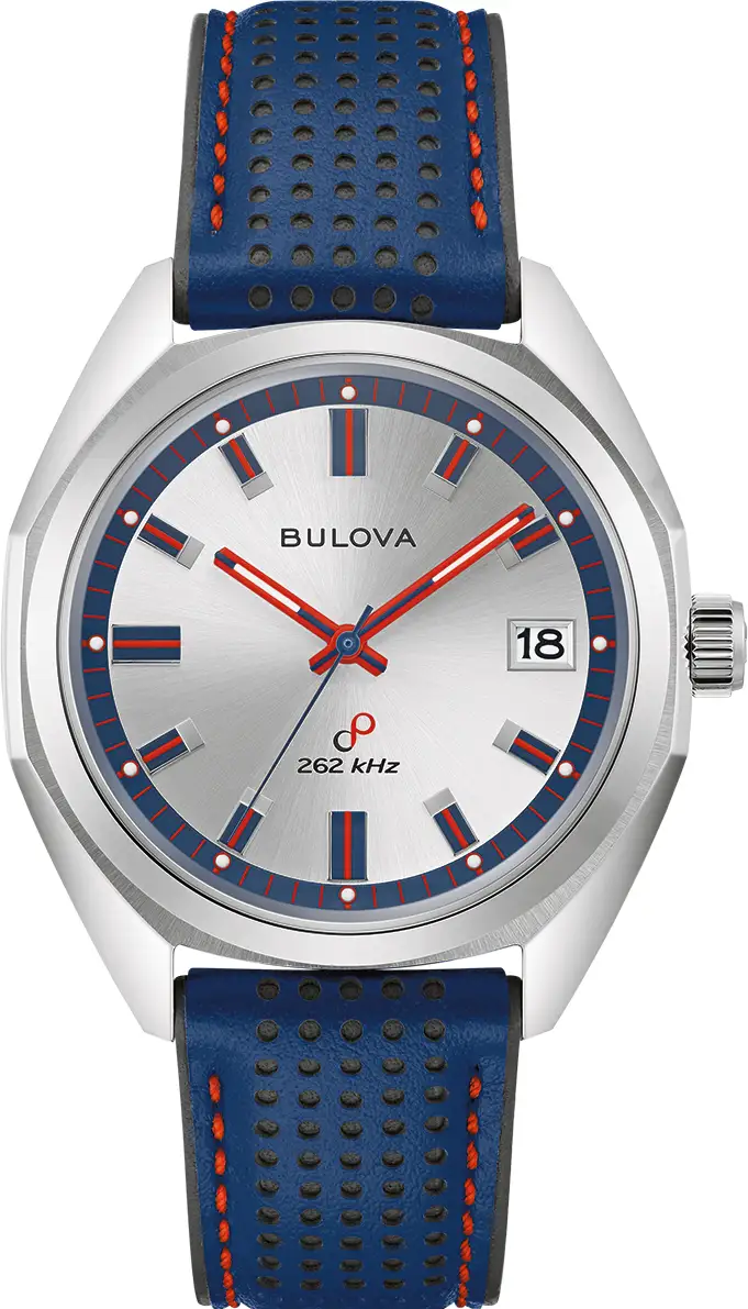 Bulova 1973 Jet Star “F” 限量版,傳承自1970年代經典,不鏽鋼錶殼搭載獨特的角形設計和藍寶石水晶。銀色太陽紋錶盤搭配藍紅色環,Precisionist機芯,準確高頻振動,全球限量7,300枚,附贈藍色皮錶帶。