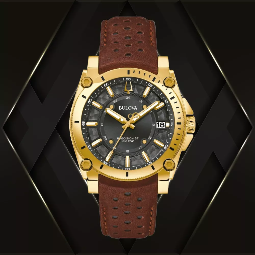 Bulova全新Icon Collection男士腕錶,以卓越精度和奢華設計為特色。這款40毫米金色錶殼由316L不鏽鋼製成,搭配弧形藍寶石水晶鏡面和黑色多層錶盤,金色發光指針和時標,呈現出高級質感。腕錶搭載Bulova Precisionist機芯,每月精度達5秒,並配備流暢的秒針運行和100米防水功能。棕色皮革賽車風格錶帶無縫銜接錶殼,營造出時尚流線型外觀。這款腕錶是彰顯品味的理想選擇。