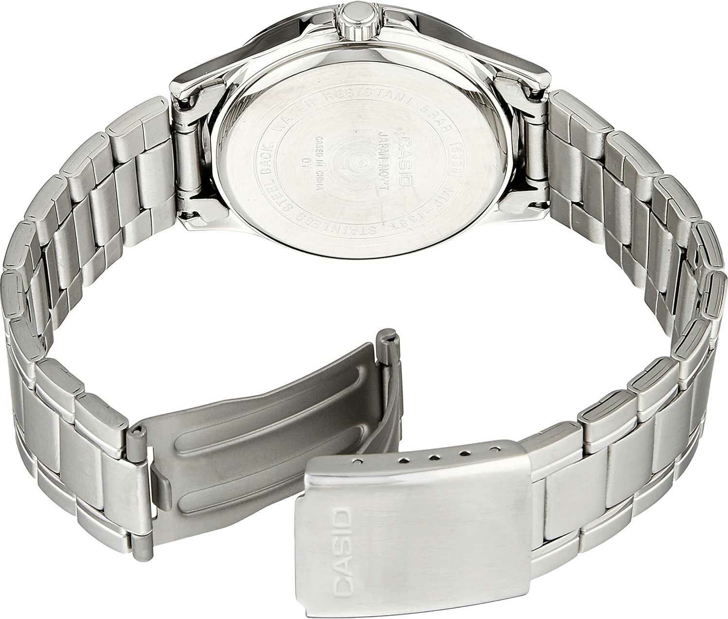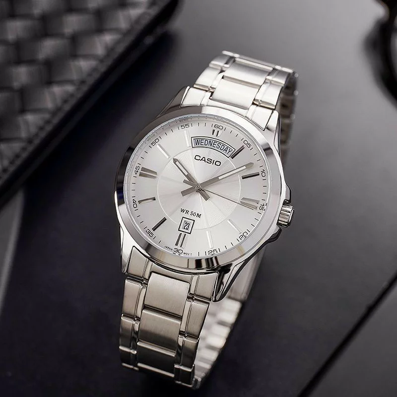 •  簡潔大方白面經典不鏽鋼男錶 MTP-1381D-7A