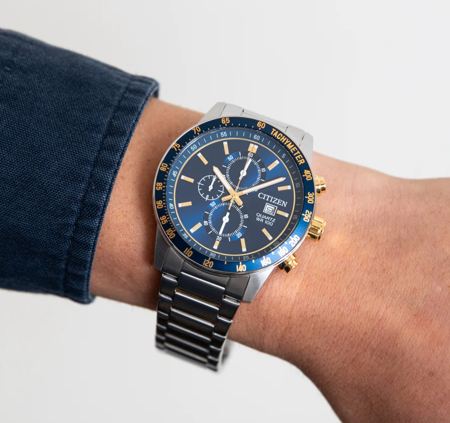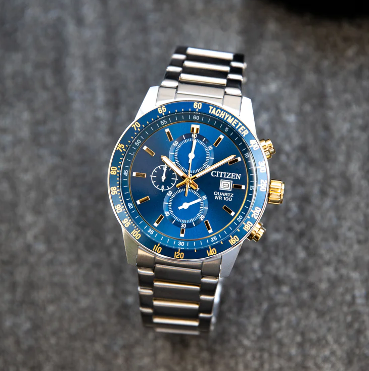 萬年鐘錶 - Citizen 星辰錶 藍色錶面金色邊框三眼計時不鏽鋼男錶 AN3684-59L 錶徑44MM
