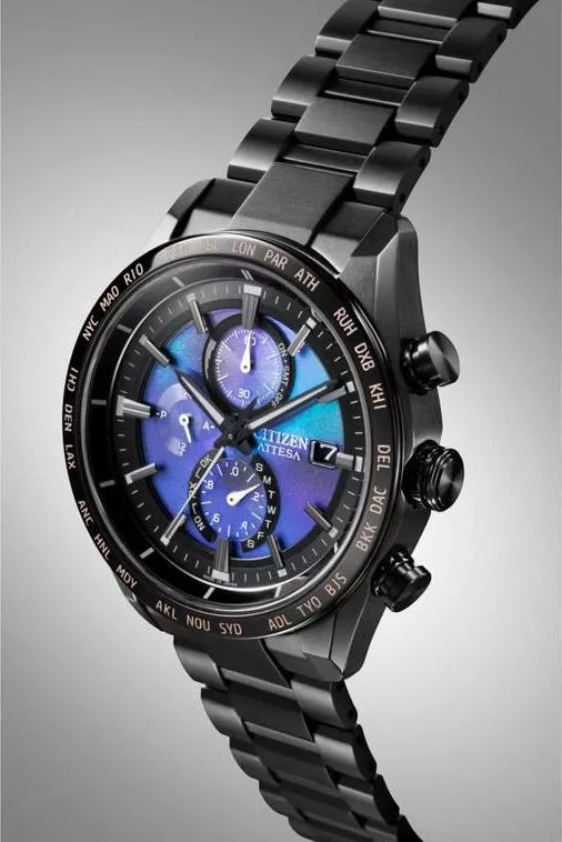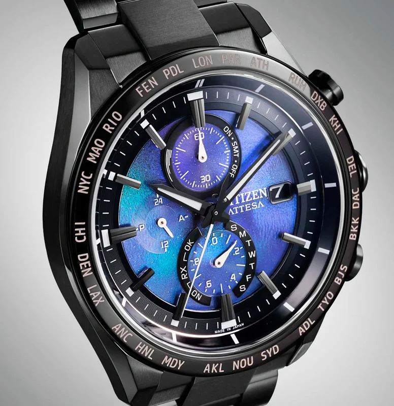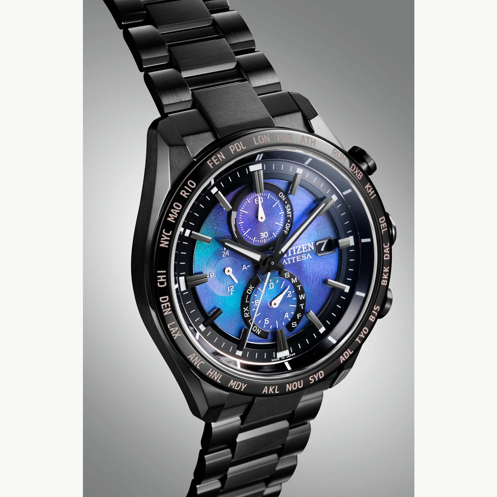 自1987年推出以来,Attesa以專業鈦加工技術和創新計時技術聞名。最新款式有耐刮Super Titanium™外殼,DLC塗層手鏈,確保輕巧耐用。刻度圈的世界時間功能展現卓越技術。宇宙錶盤有立體感三級計時器,紫藍調色,3點鐘日期。其他功能包括26時區世界時間、永久日曆、12/24小時制、動力儲備顯示。輕動力Eco-Drive原子定時可自動調整當地時間,100米防水。