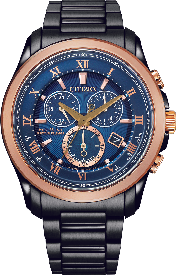 萬年鐘錶 - Citizen 星辰錶 光動能系列 萬年曆 藍面玫瑰金框不鏽鋼男錶 BL5546-81L 錶徑43MM