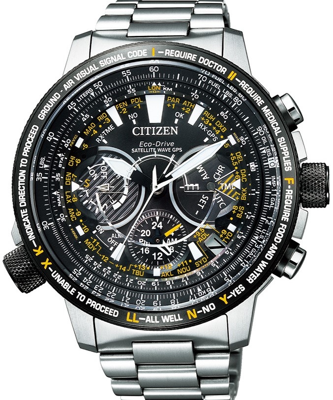 專業飛行腕錶 — 高端的SKY系列 精悍的錶殼加上鮮明的多層錶面結構,配備全面的飛行滑尺矚目登場。 功能 - 採用高端光動能衛星對時GPS機芯F990。 - 兩地時間功能的時分針轉速快一倍(與之前型號相比)。 - 雙線圈高速馬達將指針順時針或逆時針旋轉速度(相當於分針360° 轉動)減少至一 秒之內。 - 最快僅需3秒接收GPS衛星時間信號。 - 透過連接GPS衛星校正時間和日期(適用於全球39個城市)。 - 可同時顯示兩個時區的時間,一鍵切換本地時間和異地時間。 - 1秒為單位,24小時計時碼錶。 - 感光亮度等級指示*4可偵測錶盤吸光的強度並以七個等級顯示。 - 配備飛行滑尺,設計採用陸空視覺信號編碼*5的元素,增強作為專業飛行錶的特性。 - 經過Duratect MRK和Duratect DLC表面硬化處理的超級鈦™*6,更耐磨損。