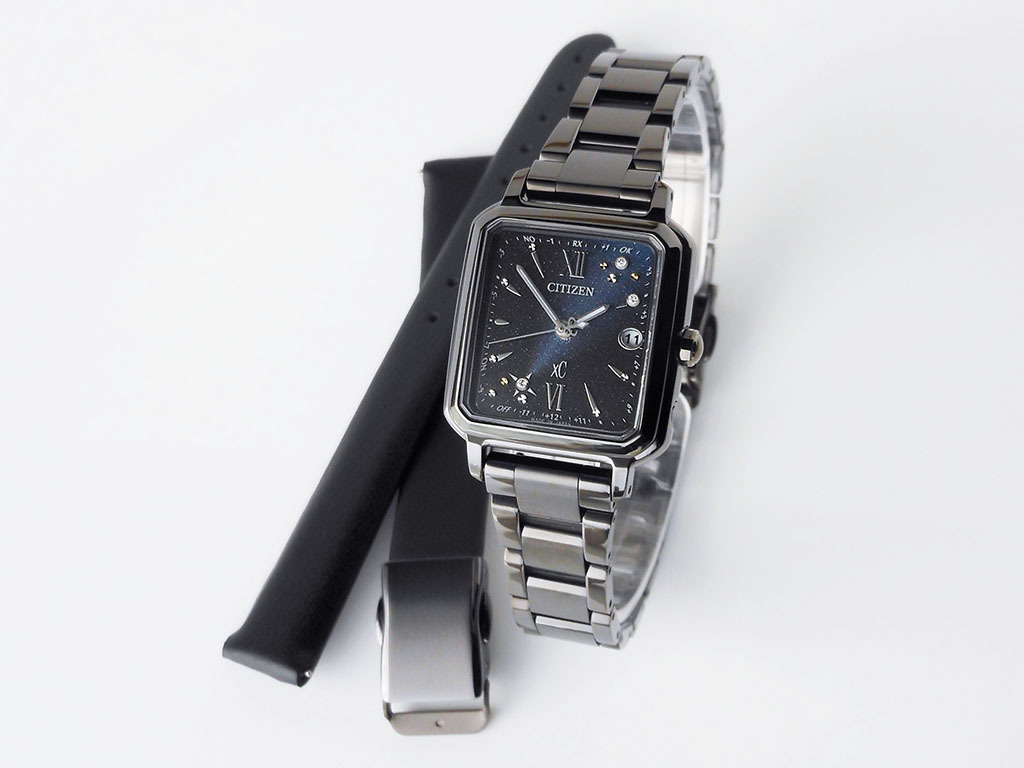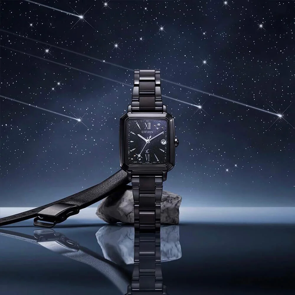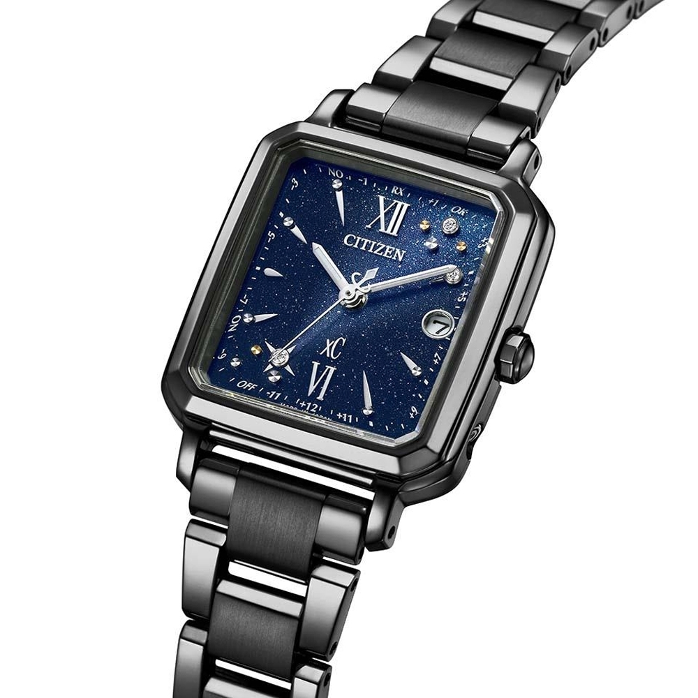 萬年鐘錶 - Citizen 星辰錶 XC hikari collection 限量方型全黑星空藍鈦金屬附皮革錶戴套組光動能電波女錶 ES9504-50E 錶徑25MM