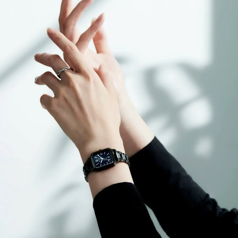 • 光動能電波腕錶  XC 系列   hikari collection 限量方型全黑星空藍鈦金屬附皮革錶戴套組光動能電波女錶 ES9504-50E