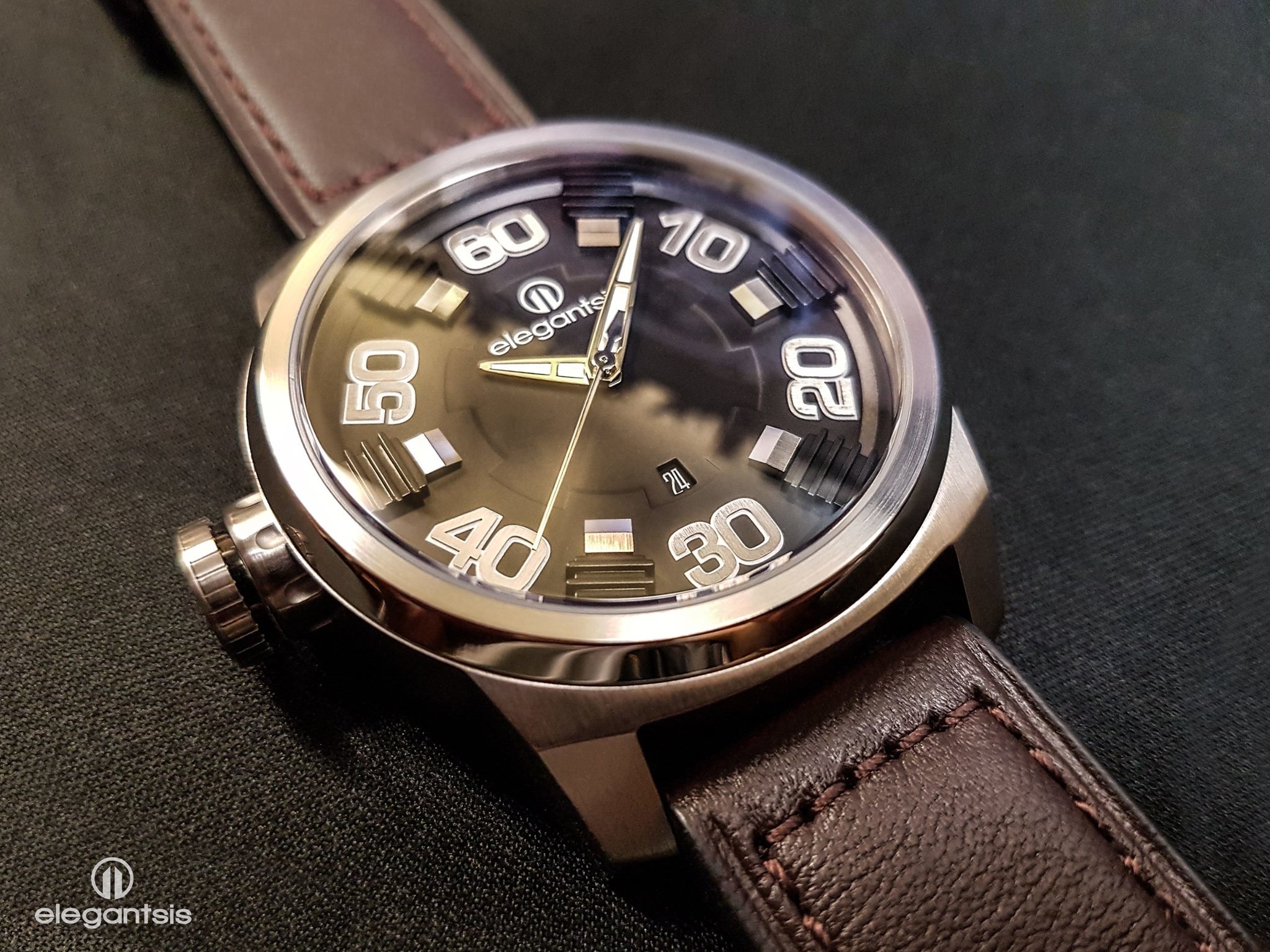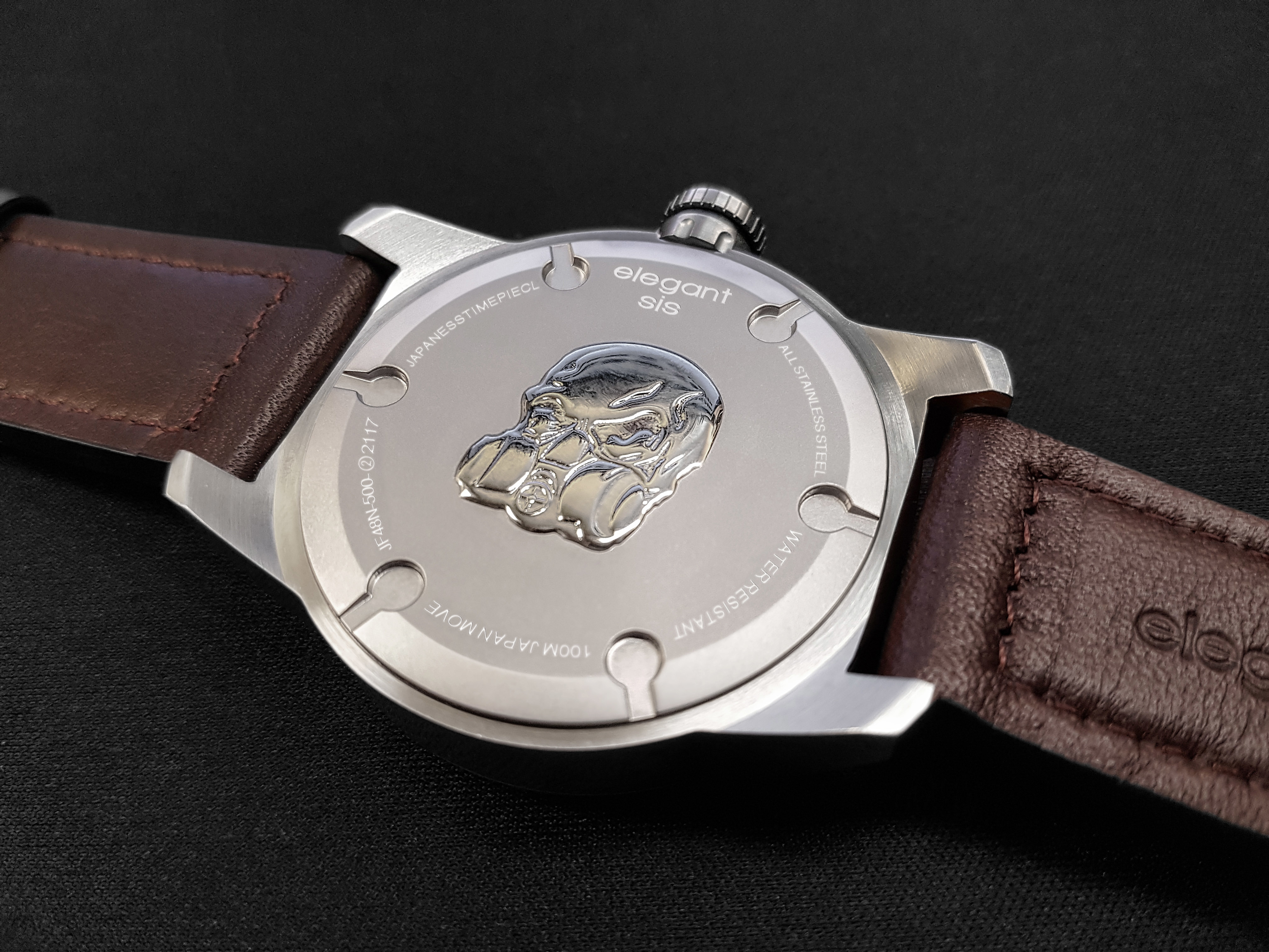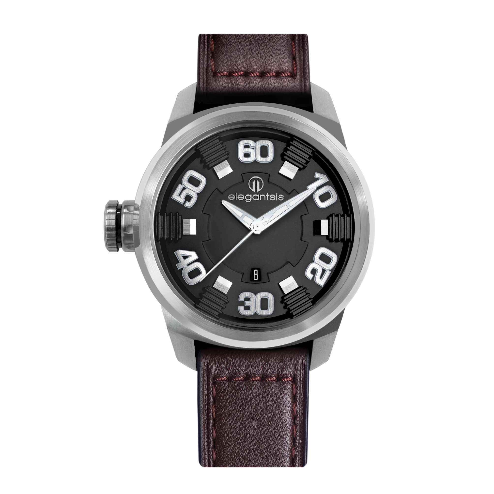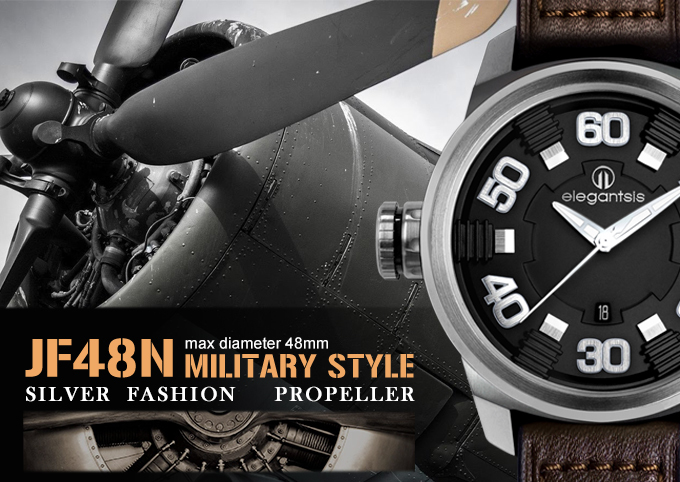 萬年鐘錶 - elegantsis 愛樂時 JF48N 戰鬥機螺旋槳後的引擎排列式面板設計 黑面咖啡色皮革錶帶 ELJF48N-2B01LC錶徑48MM