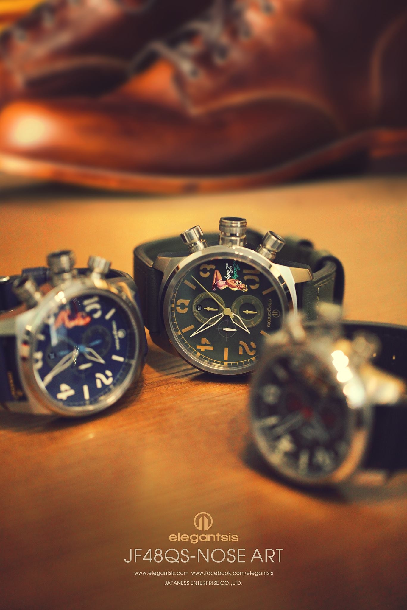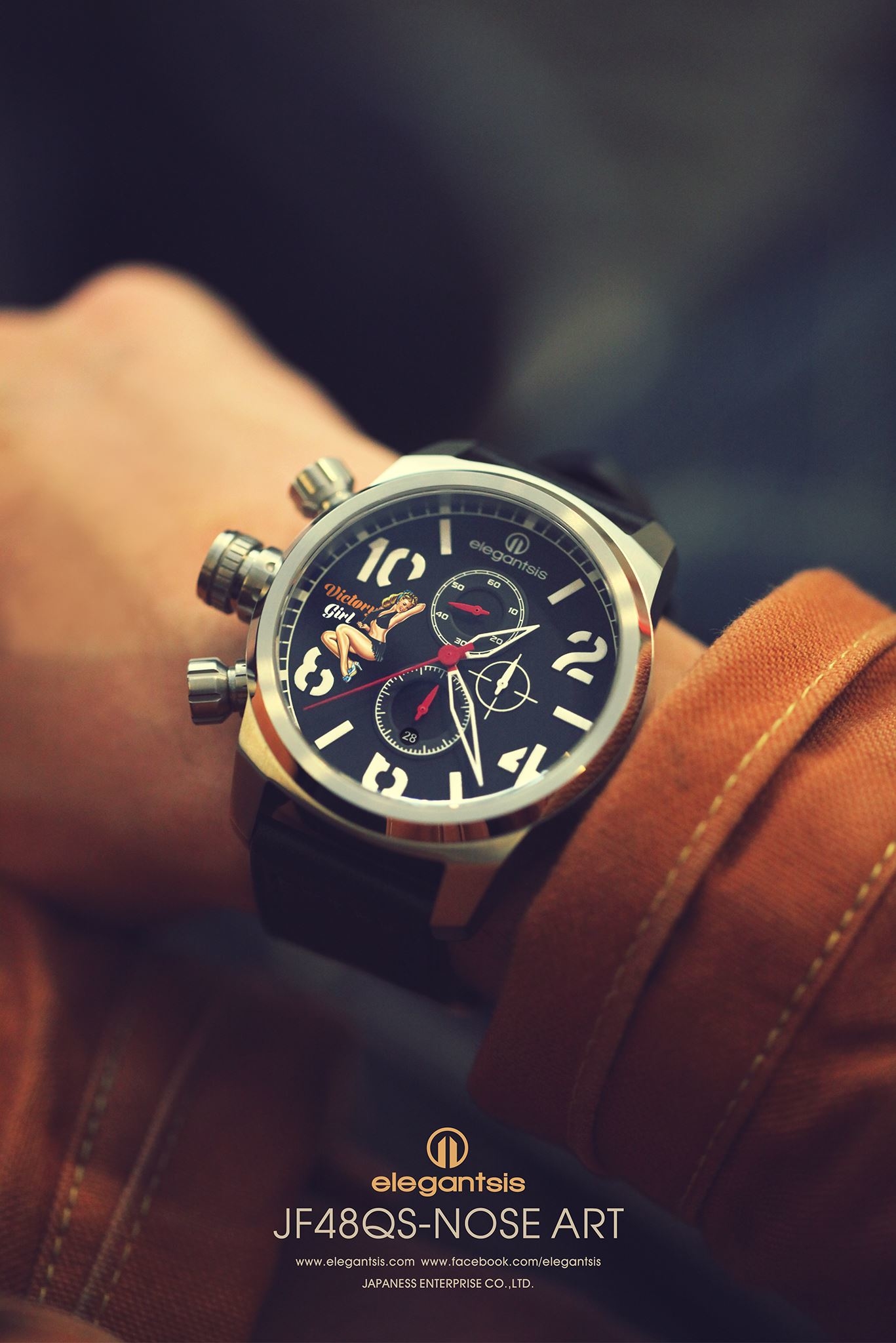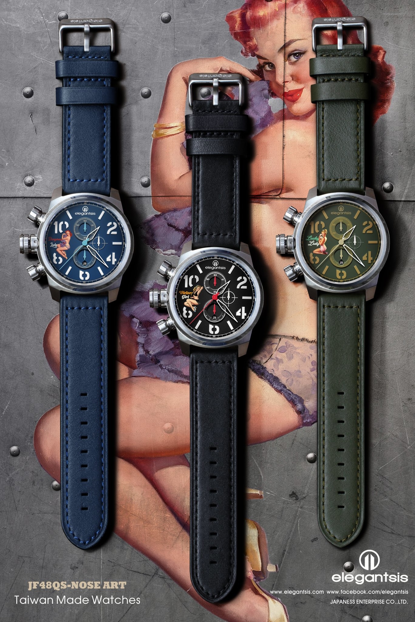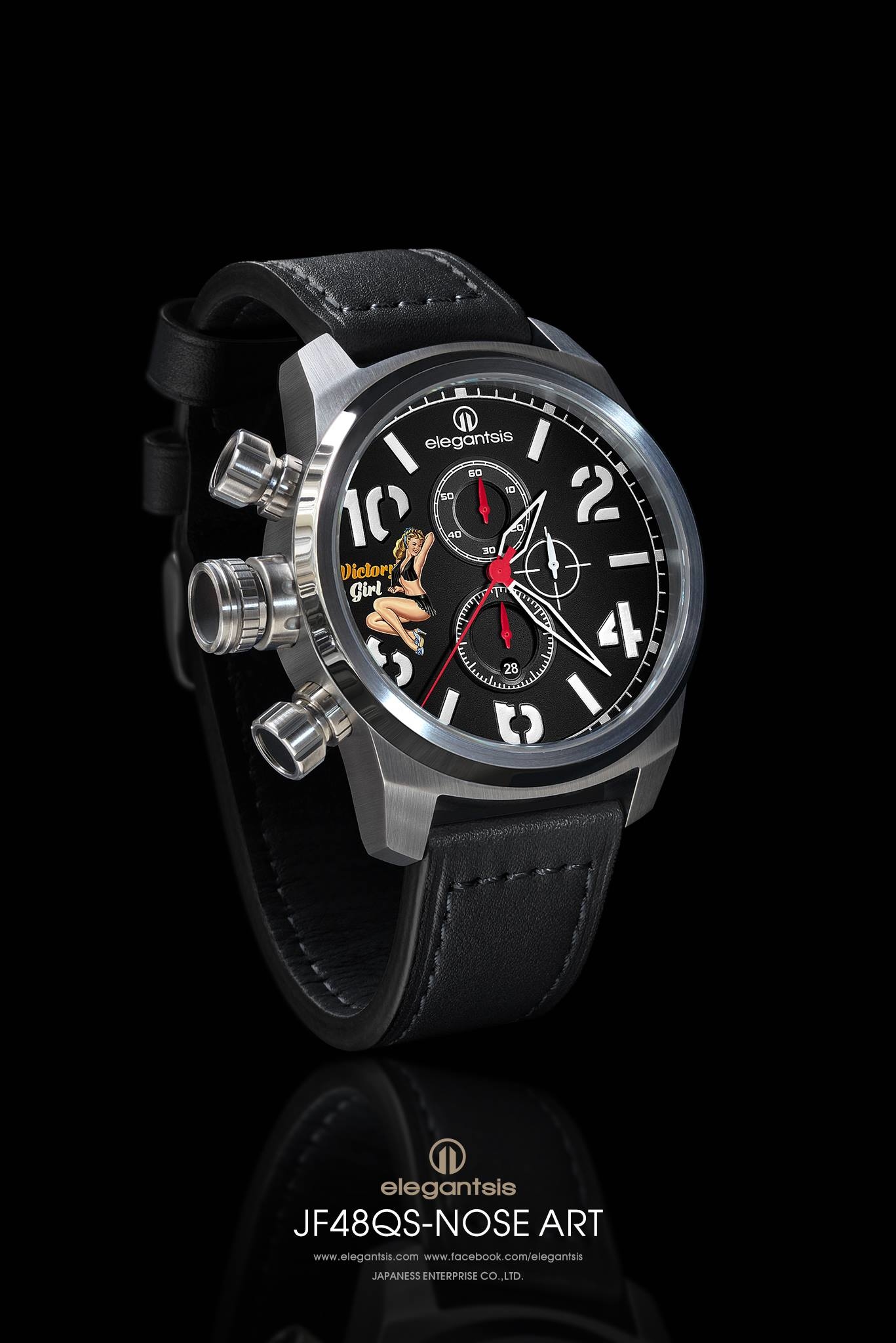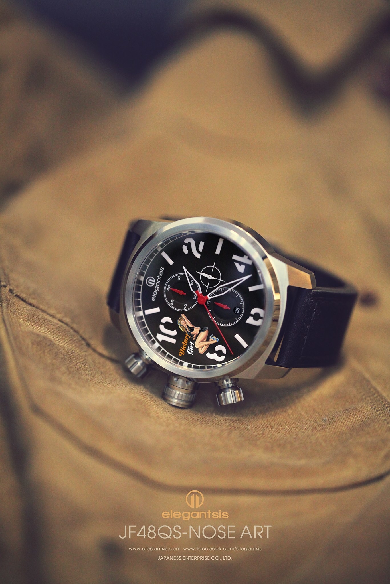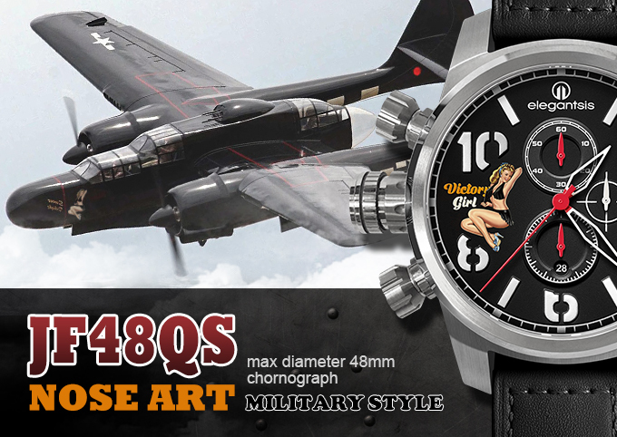 萬年鐘錶 - elegantsis 愛樂時 JF48QS-NOSE ART 軍機機頭位置彩繪的視覺藝術 機頭藝術-女郎 黑面黑色皮革錶帶 ELJF48QS-OB01LC 錶徑48MM