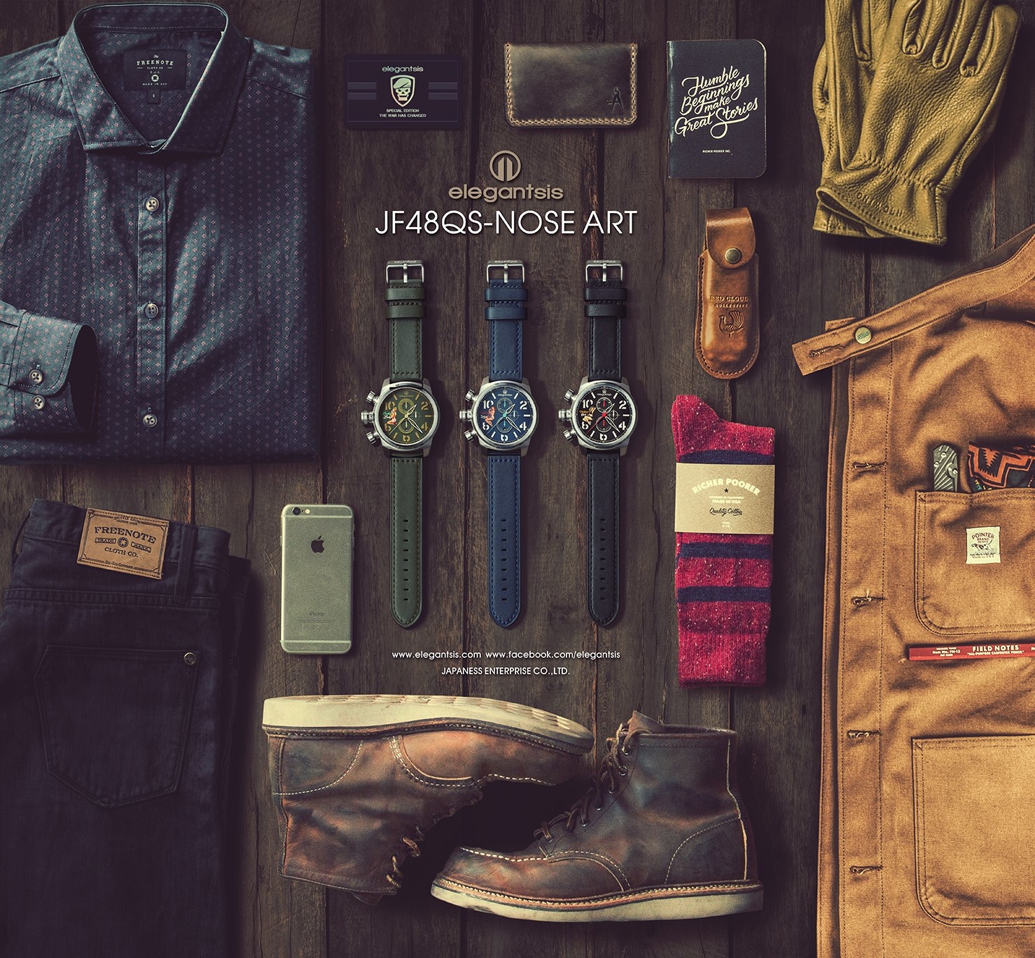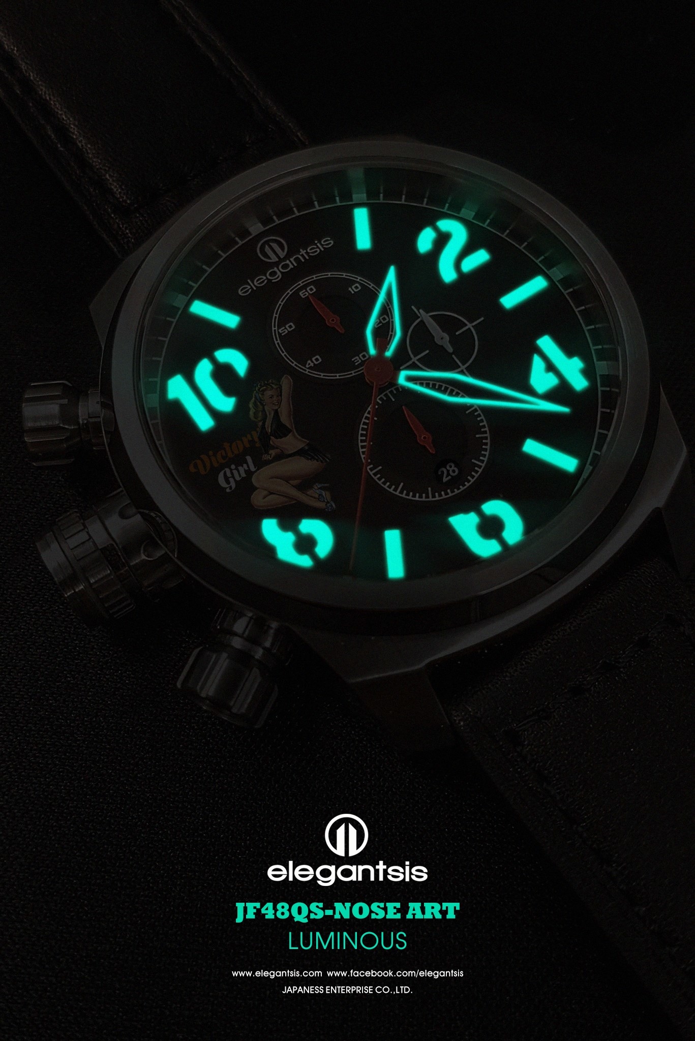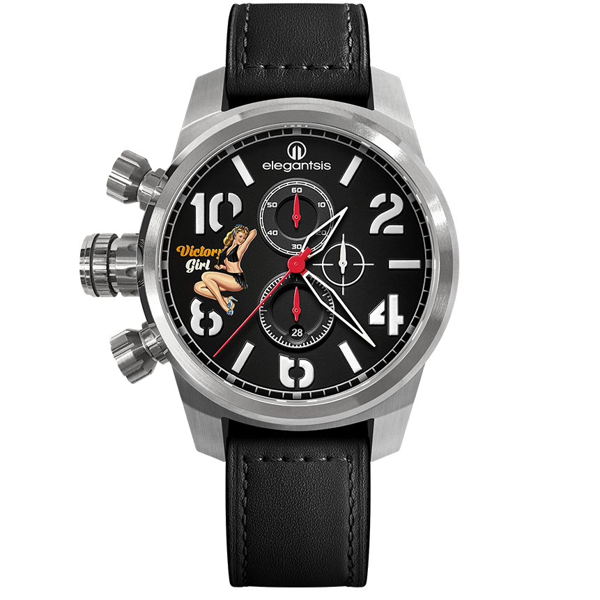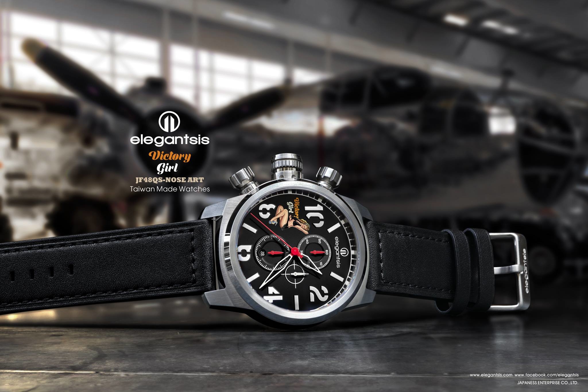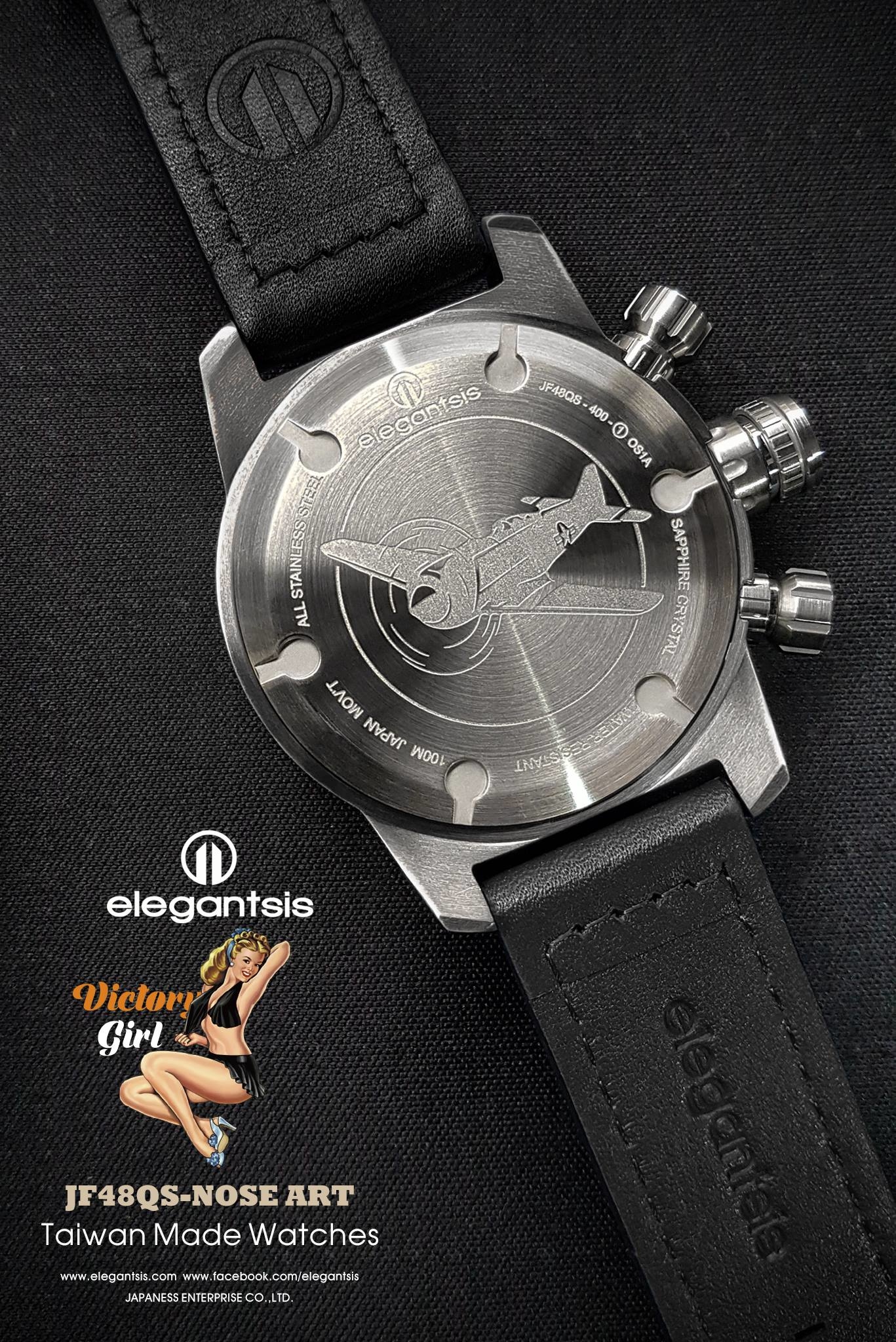 萬年鐘錶 - elegantsis 愛樂時 JF48QS-NOSE ART 軍機機頭位置彩繪的視覺藝術 機頭藝術-女郎 黑面黑色皮革錶帶 ELJF48QS-OB01LC 錶徑48MM