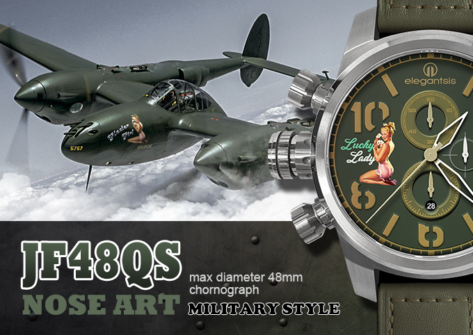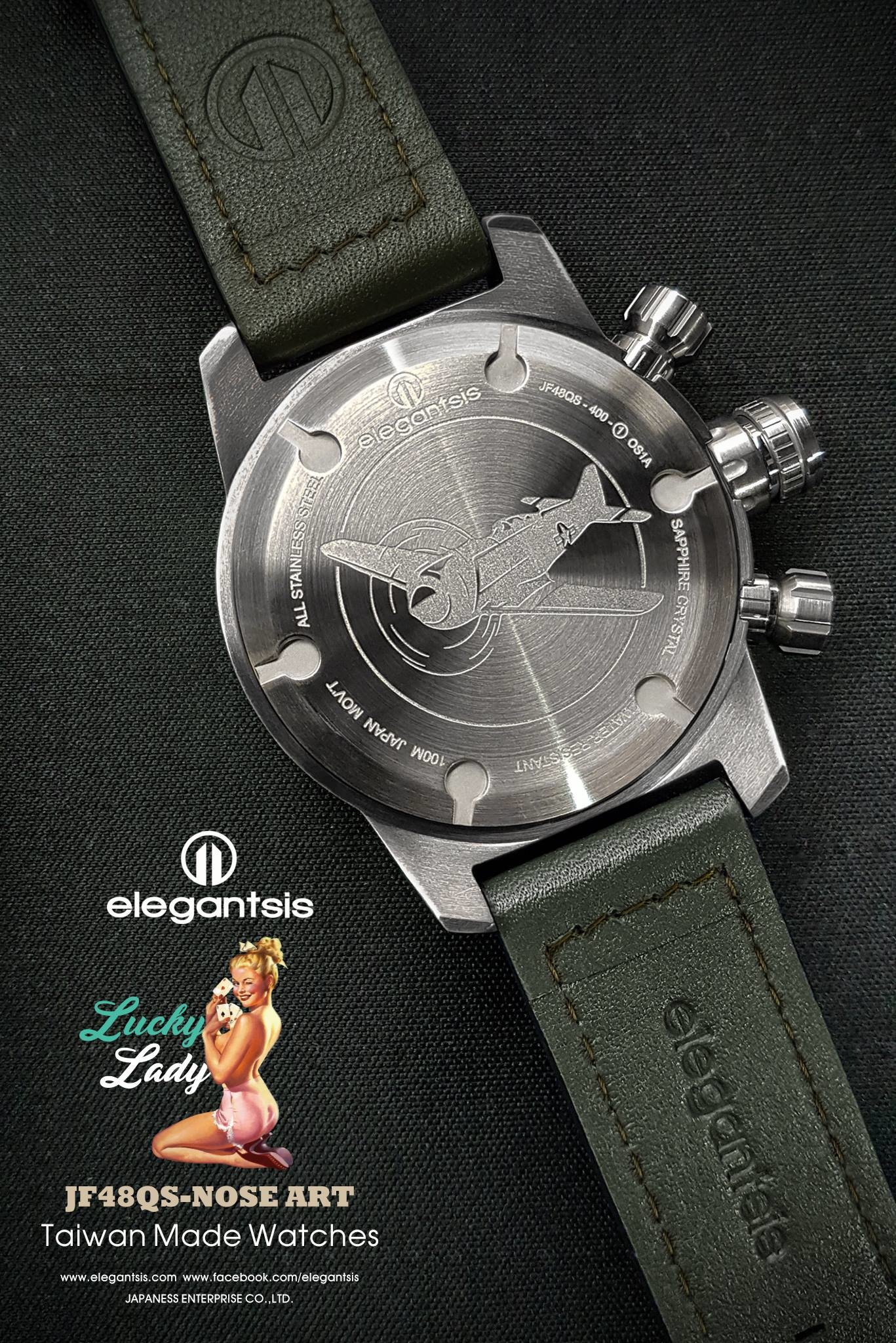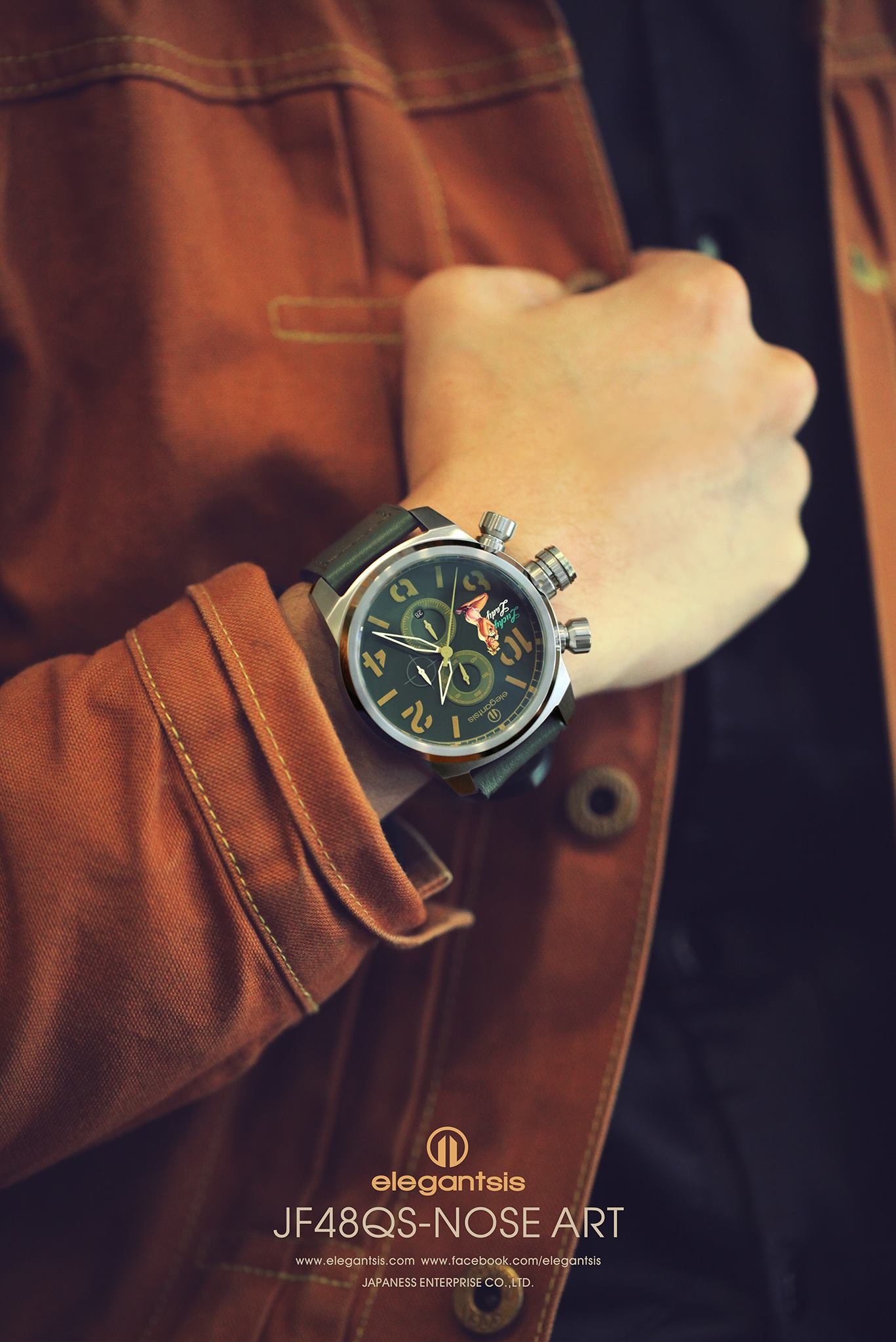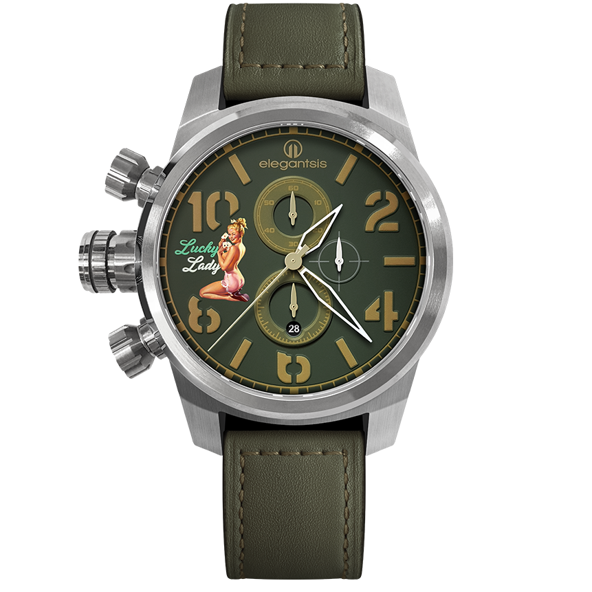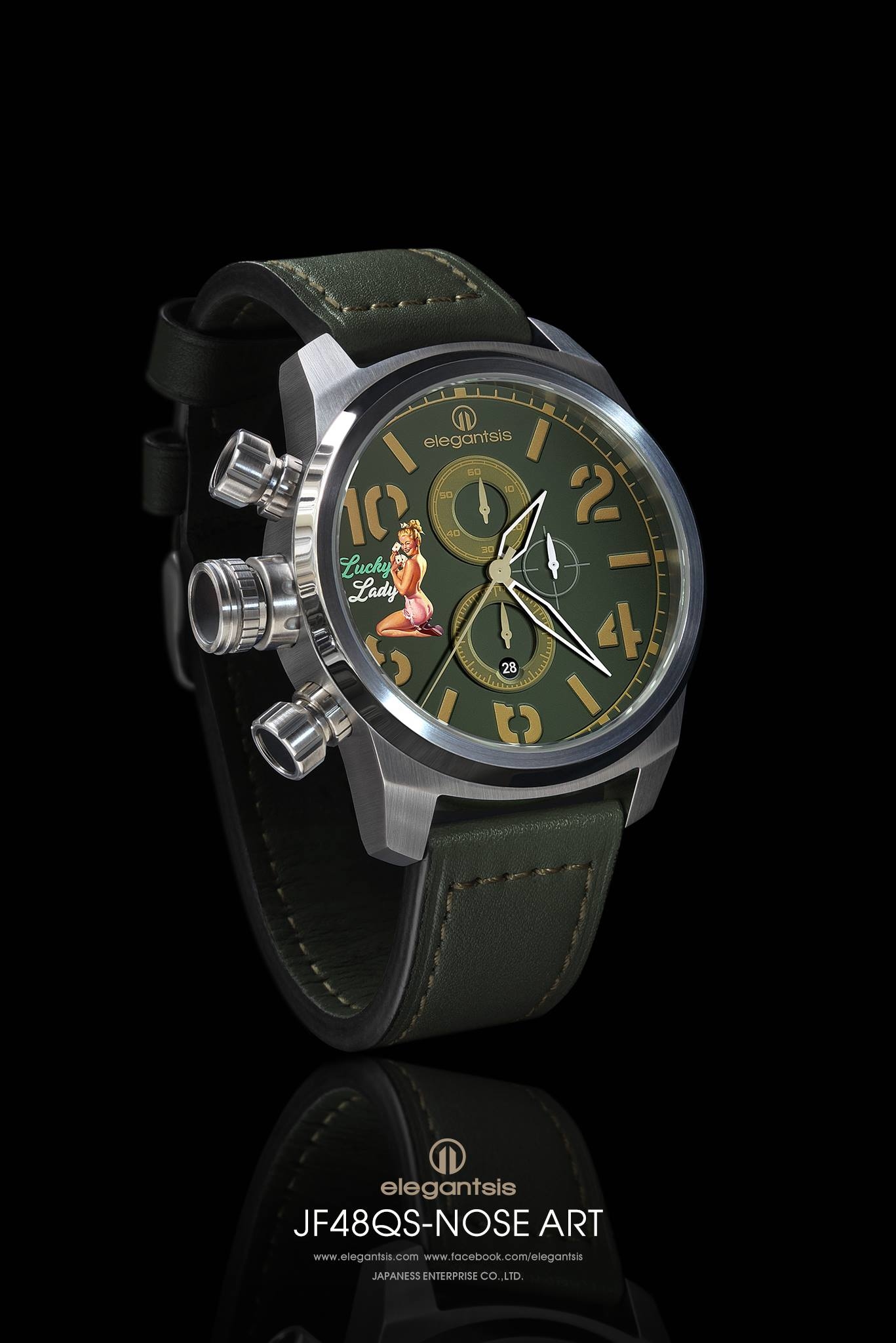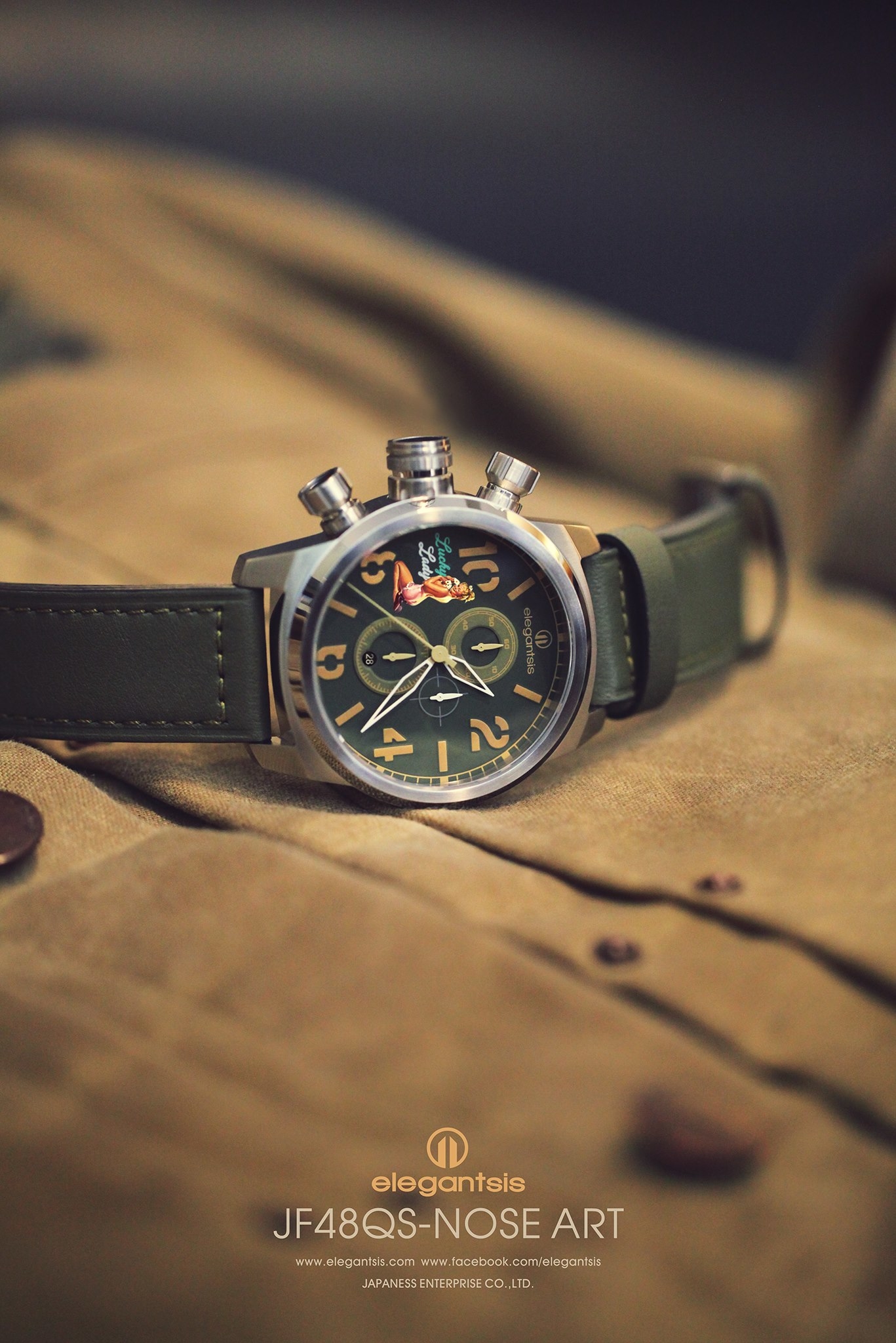 萬年鐘錶 - elegantsis 愛樂時 JF48QS-NOSE ART 軍機機頭位置彩繪的視覺藝術 機頭藝術-女郎 綠面綠色皮革錶帶 ELJF48QS-OG03LC錶徑48MM