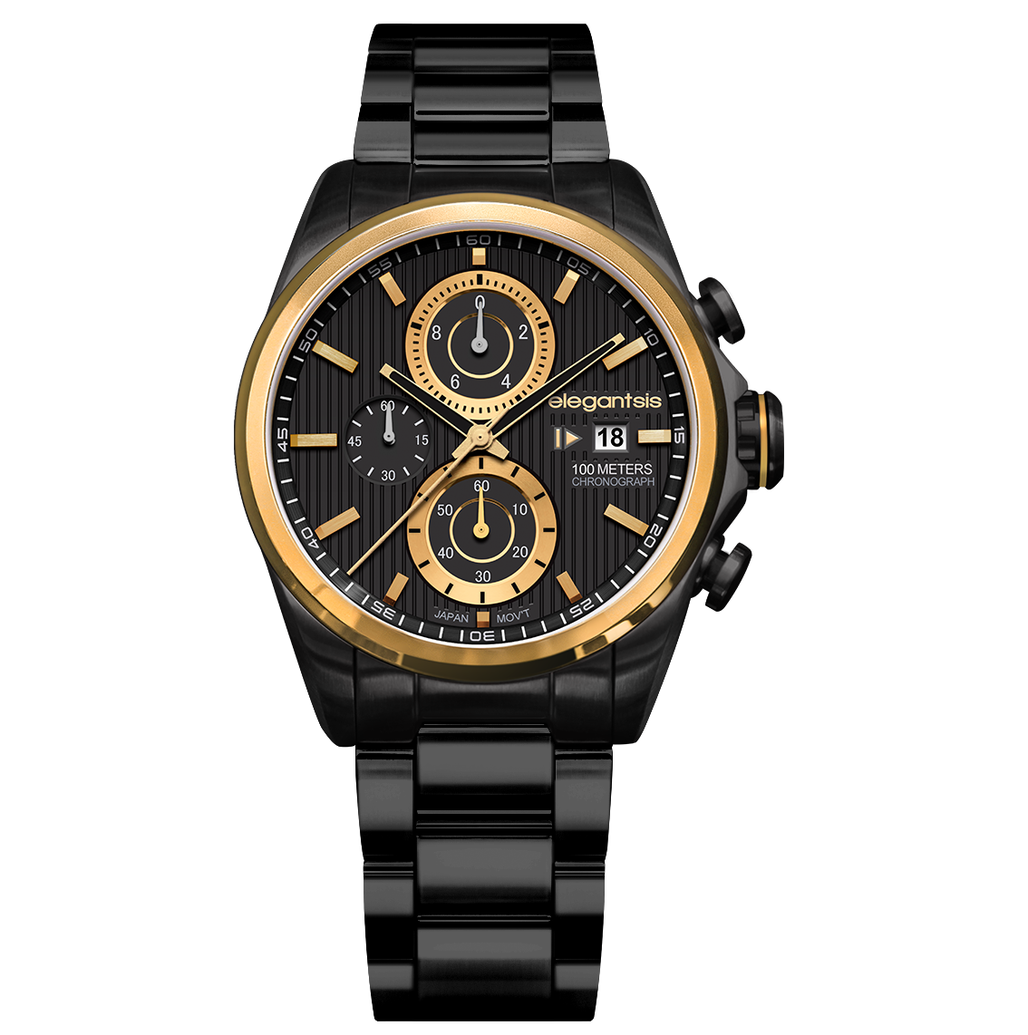 萬年鐘錶 - elegantsis 愛樂時 JT42R MOTORCYCLISTS STYLE 騎士精選腕錶 全黑金框不鏽鋼錶帶 ELJT42R-6B04MA 錶徑46MM