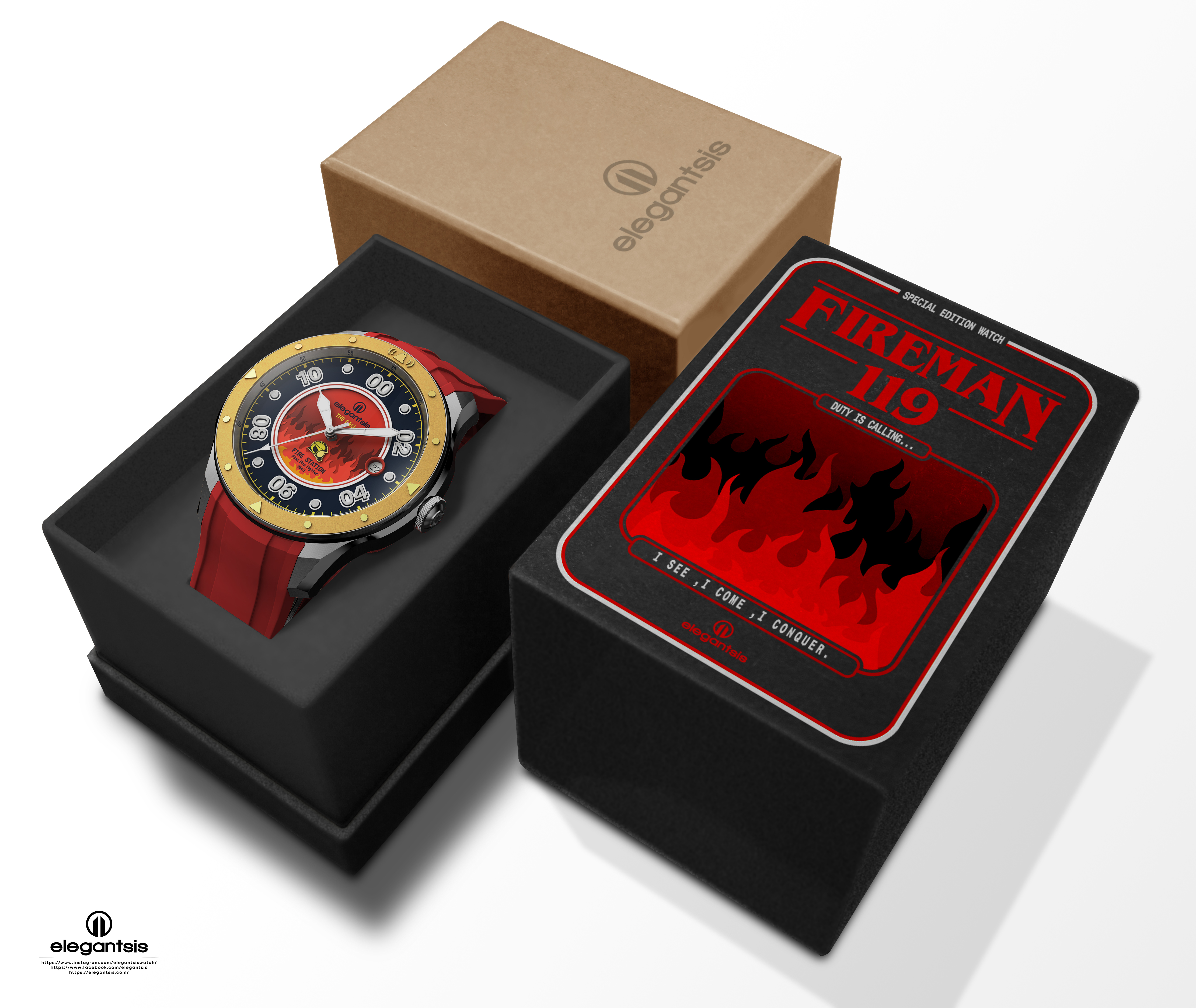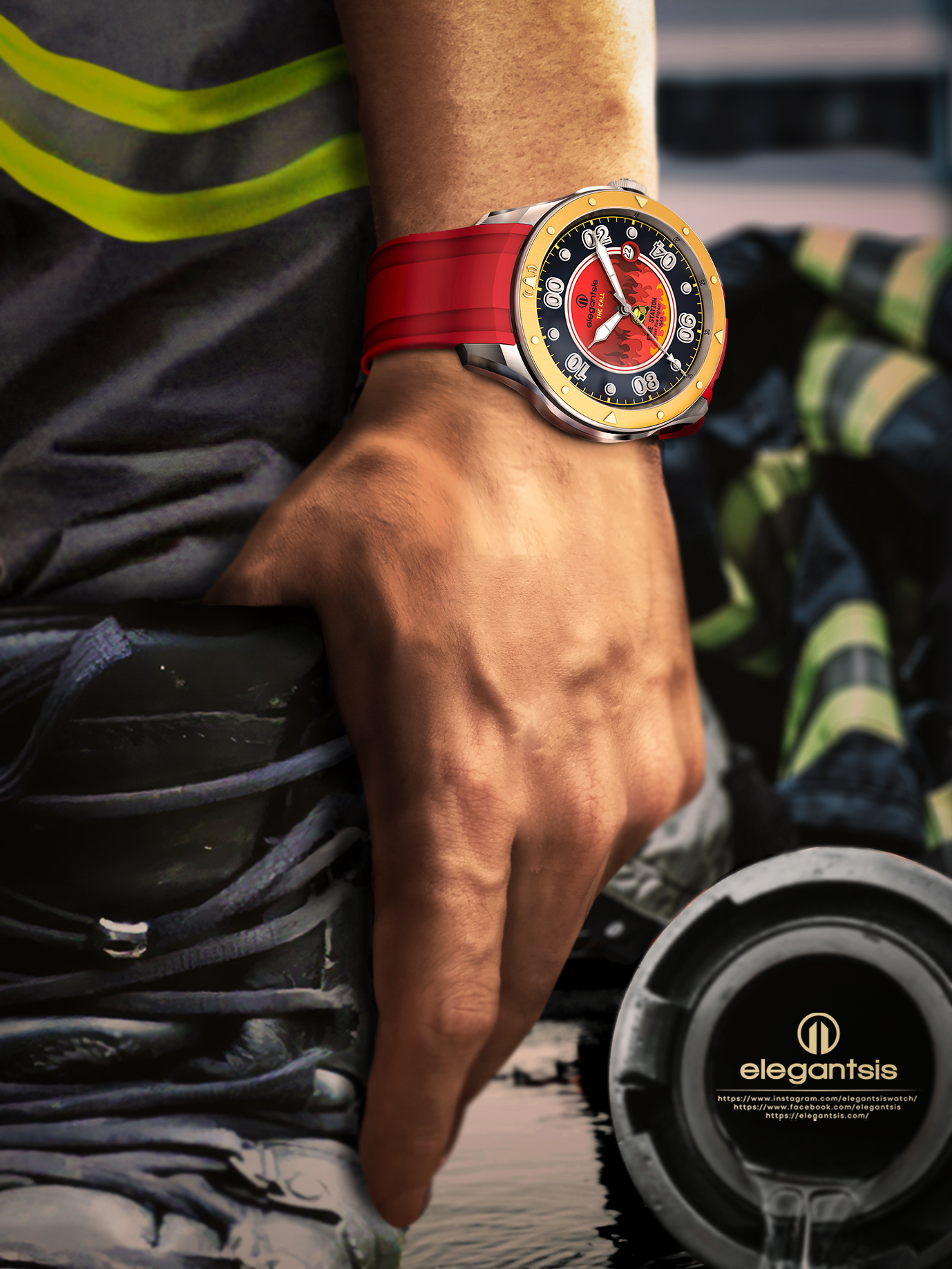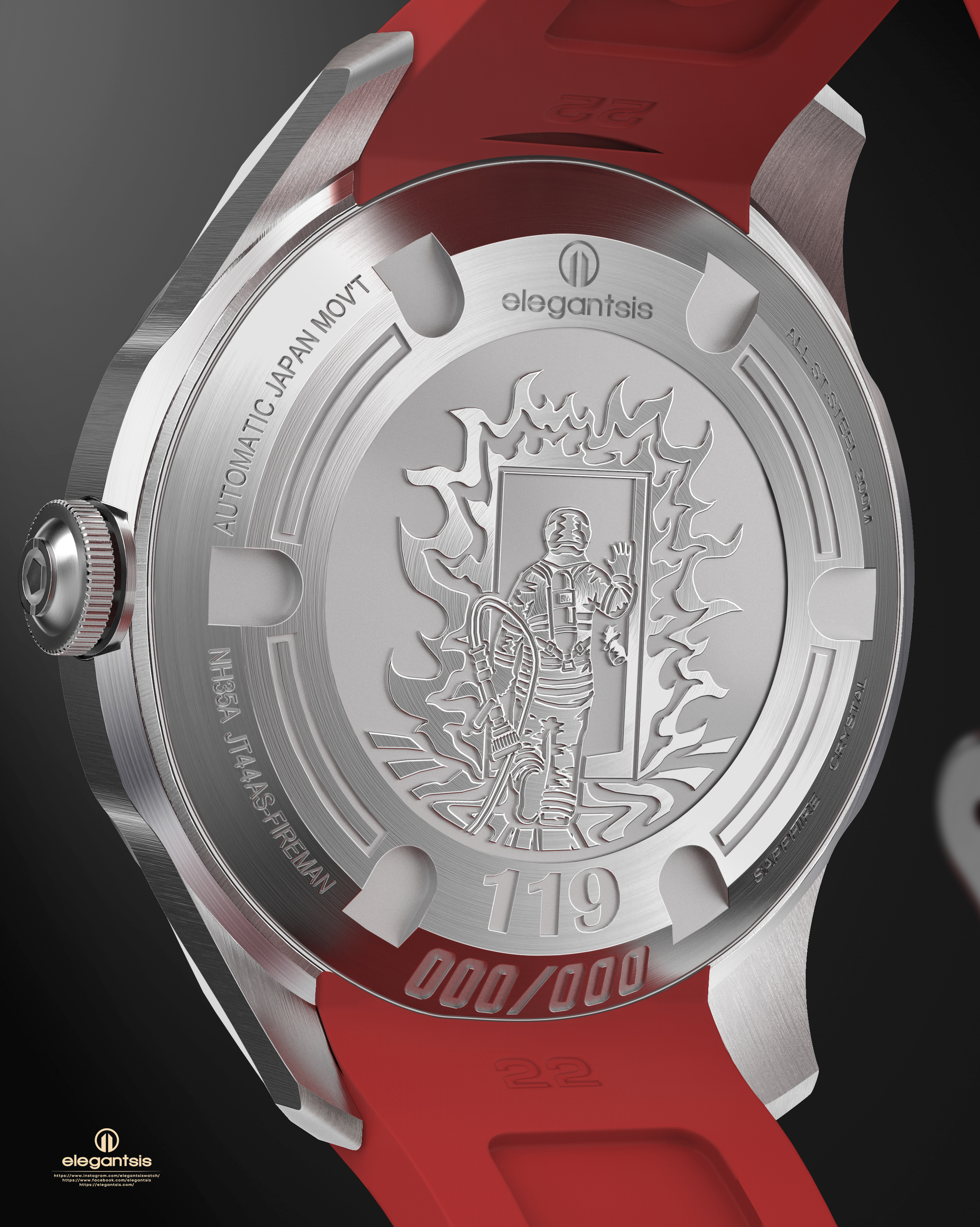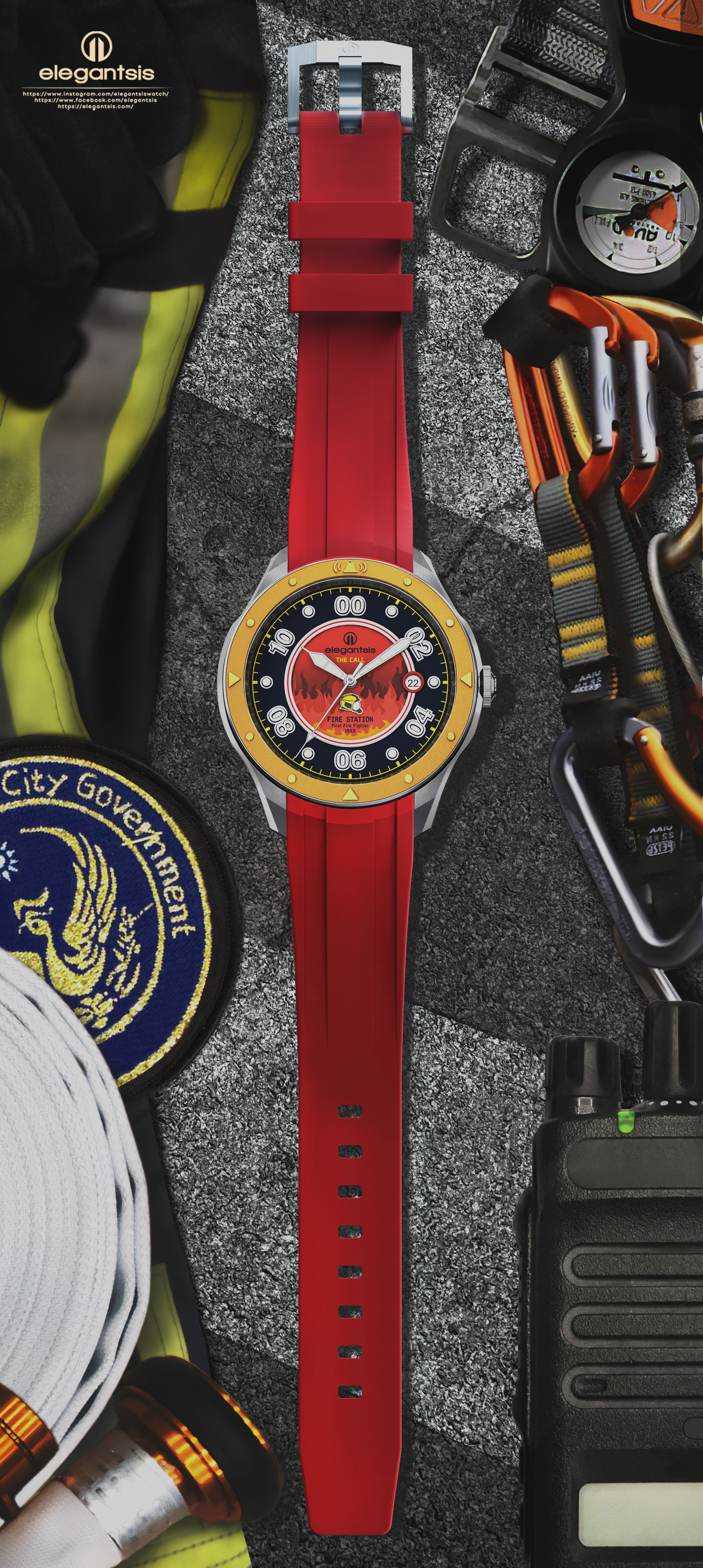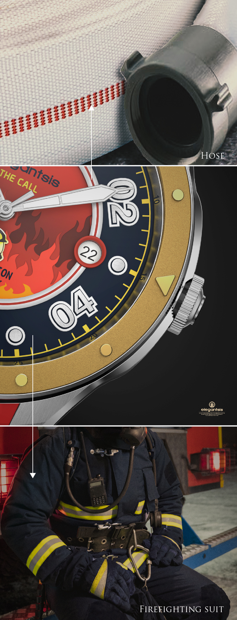 消防人員總在最險惡的環境中勇往直前,搶救每個生還的可能。 他們有著「預防火災」、「搶救災害」、「緊急救護」之消防三大任務,不限時間、不限地點、不限災情,隨叫隨到的全方位服務團隊。 平時的任務十分艱辛,除此之外訓練也不馬虎,特別有肌肉教官編制的負重訓練菜單。每次的任務也會冒著「疏失」、「失誤」、「過失」的風險,每位英雄背負著沉重的壓力。特別推出這款腕錶為感謝全台灣消防隊的辛勞及無所畏懼的態度。