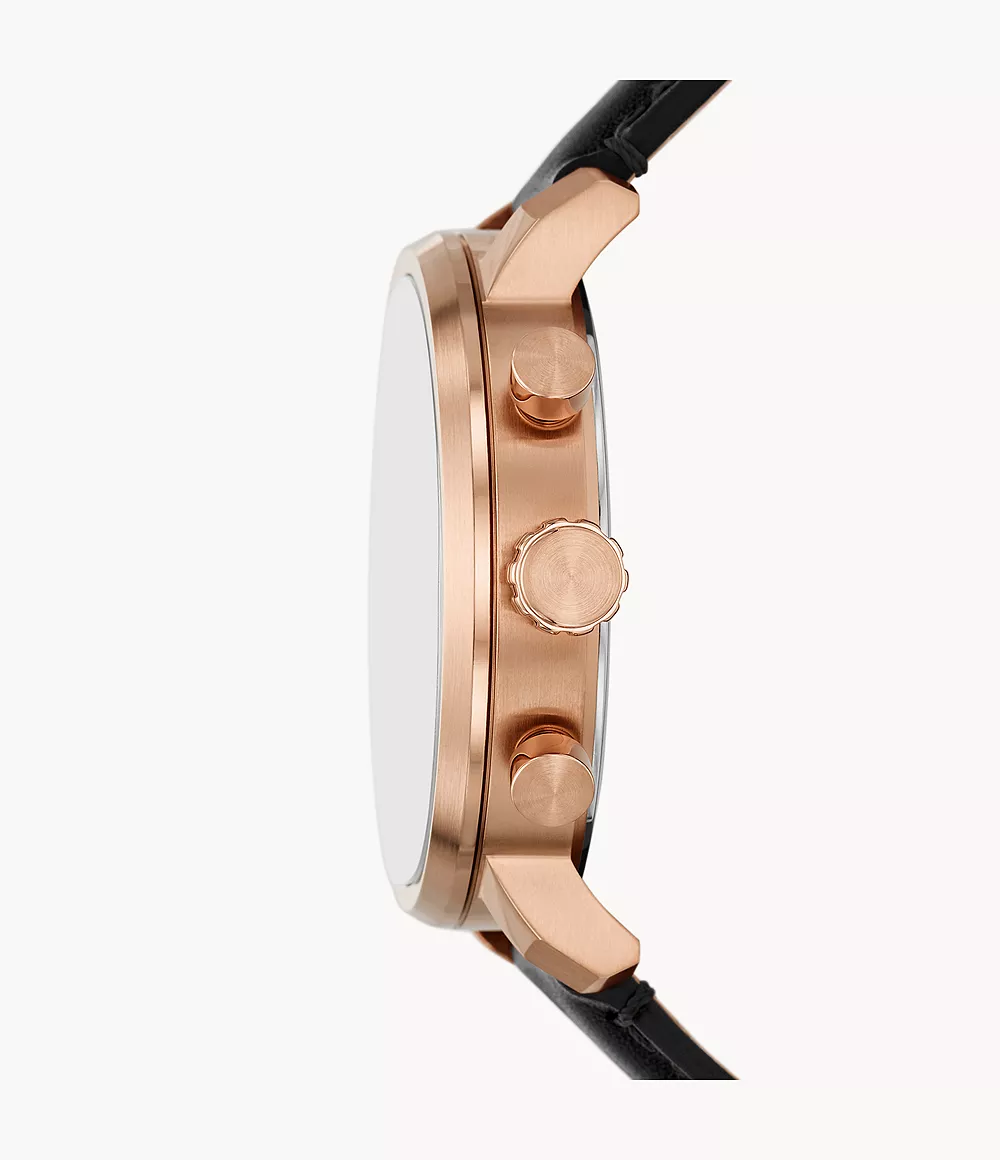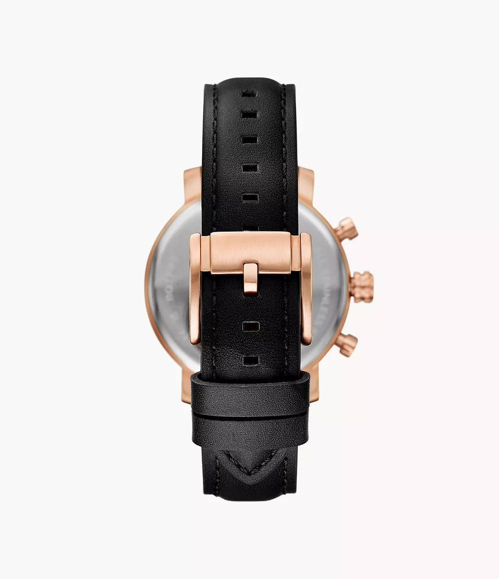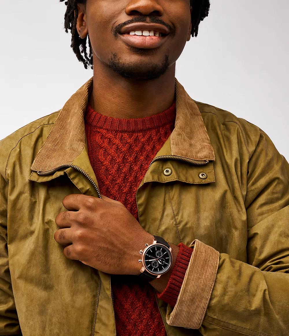 Neutra 雅仕三眼計時手錶 ,靈感來自於中世紀的計時碼表,設計簡潔且極具現代感,搭配綠色耀眼錶盤和深棕色皮革錶帶。44毫米玫瑰金色不銹鋼錶殼內嵌精密石英計時機芯。經典的外觀結合多功能。