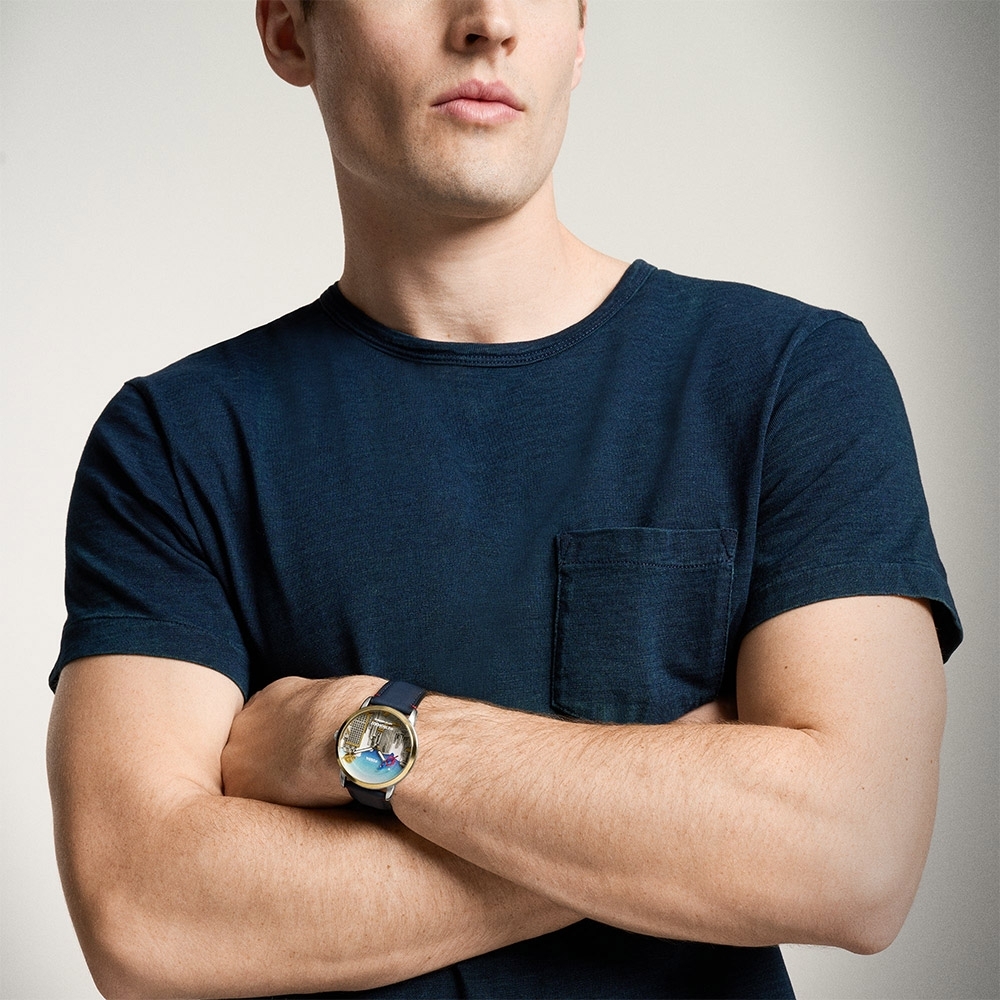 與這款限量版腕錶一同展翅高飛。設計細緻的壓印錶盤展現立體版大都會市景,搭配深藍皮革錶帶,展現非凡氣勢。