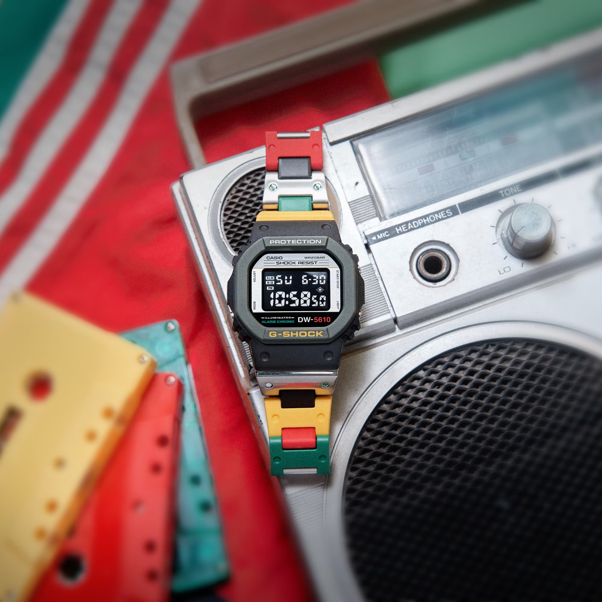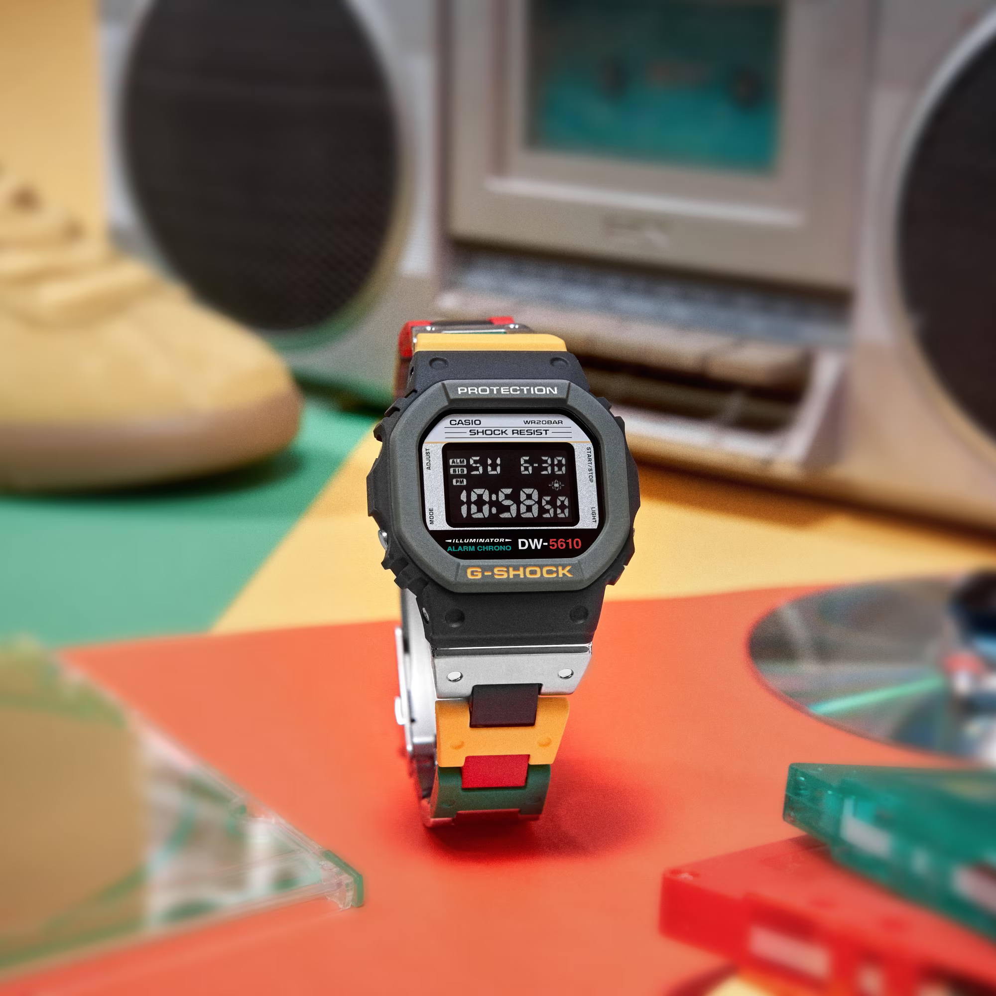 戴上靈感取自錄音帶繽紛標籤的色彩配置G-SHOCK錶款,回到混音帶當道的黃金年代。