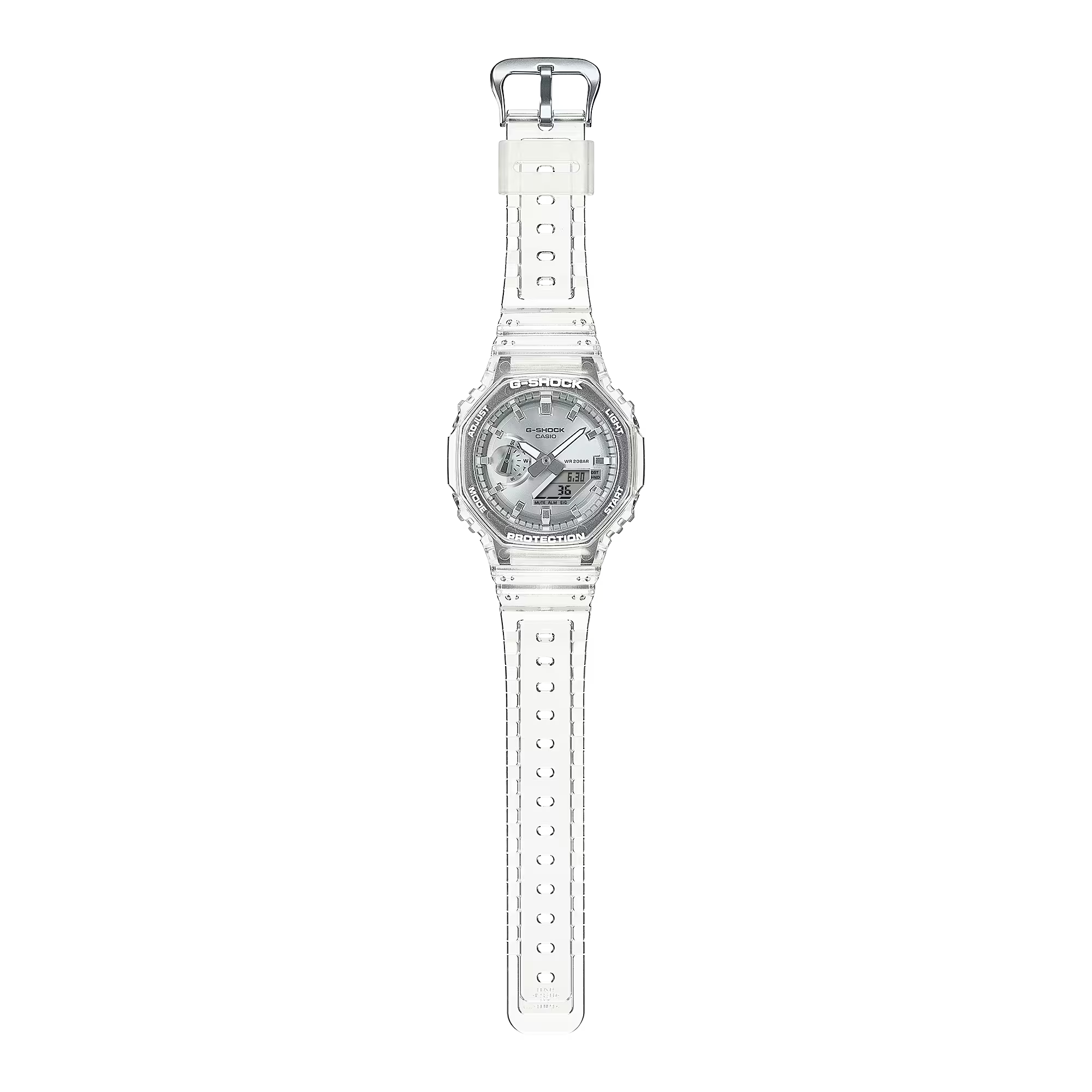 GA-2100 採用八角形錶圈,搭配以金屬蒸鍍工藝打造而成的錶盤,顏色選用流行的銀色並配上半透明錶帶,展現自信酷炫風格。