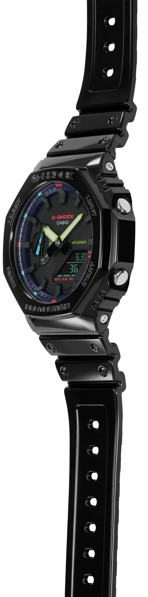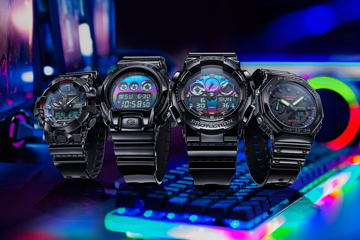 探索虛擬彩虹系列,感受網路遊戲世界美學與G-SHOCK追求終極強韌時碰撞出的多彩光譜。亮黑色錶圈及錶帶,搭配彩虹蒸鍍錶面與多色設計。一系列大膽搶眼的外觀,以酷炫色彩稜鏡效果照亮黑暗,制霸所有時尚場合。