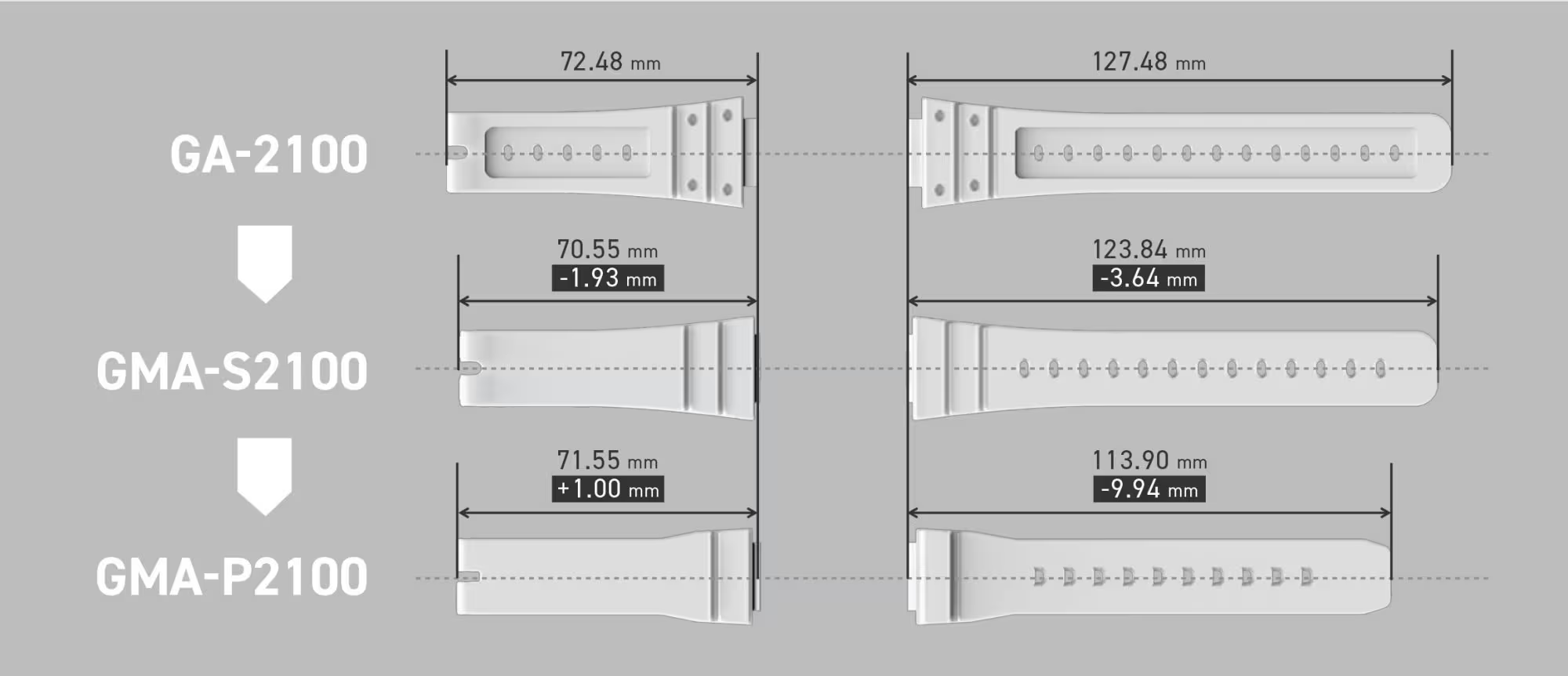 GMA-P2100承襲GMA-S2100精巧的設計,並更加纖薄精緻,錶帶長度也縮短,適合較纖細的手腕,配戴起來非常舒適。