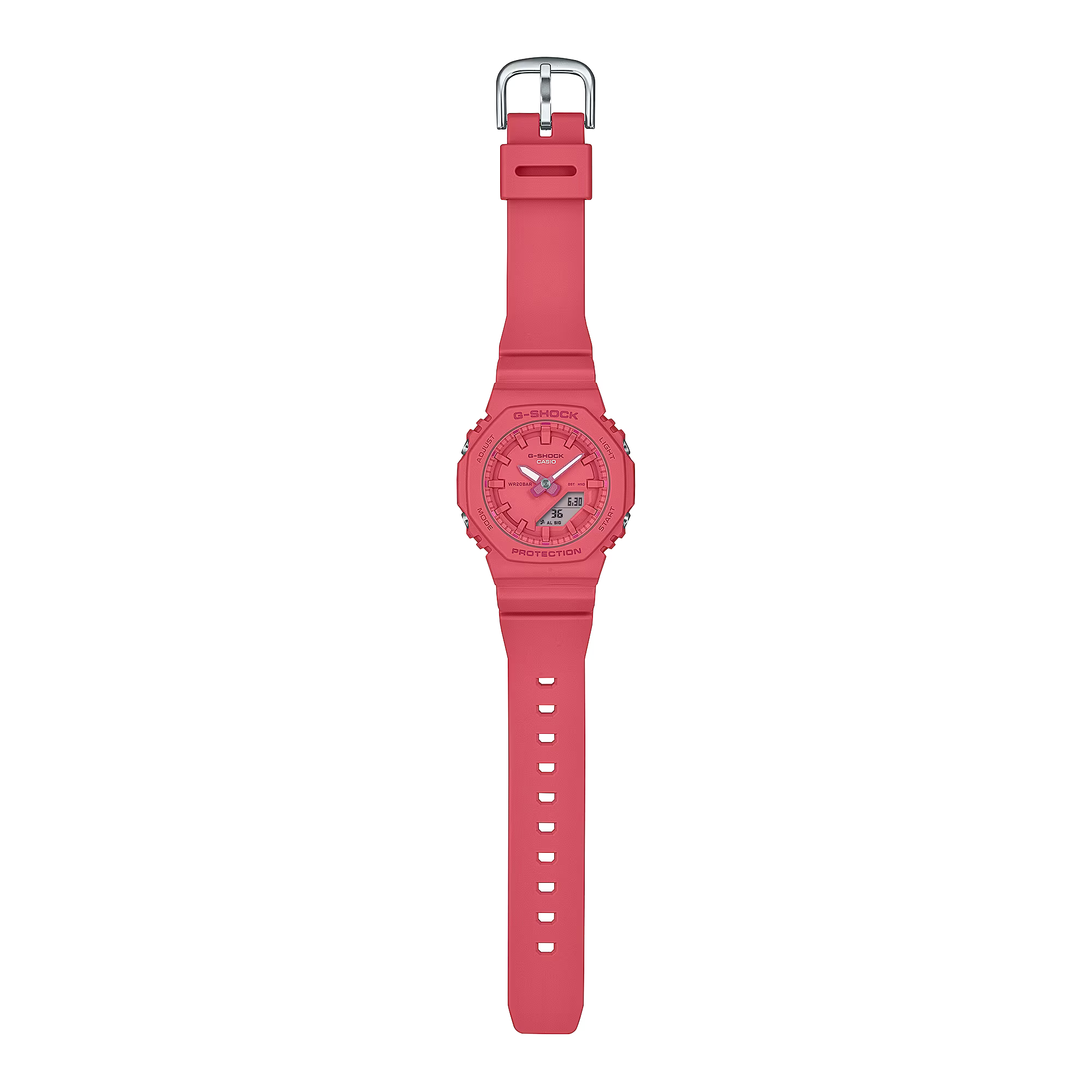充滿活力的單色表面:動感的綠松藍色(新顏色)、亮粉色和經典白色,時尚活潑,省去原版GMA-S2100的9點鐘方向嵌入式錶盤,以營造流線型的極簡外觀。