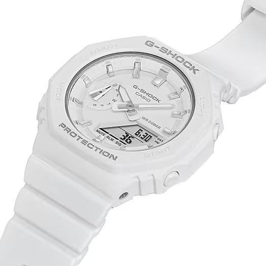 G-SHOCK在無止境追求強悍的過程中持續進化,此為廣受歡迎的 GA-2100 型號的縮小版。簡約纖薄的設計同時兼顧強悍的結構。基本款 GA-2100 型號是纖薄版本的 G-SHOCK,繼承了第一代 DW-5000C 型號的八角形外觀。扁平錶面與簡約整點時刻營造出極簡外觀特色。白色霧面設計能搭配各種時尚風格,金屬感整點時刻增添質感。