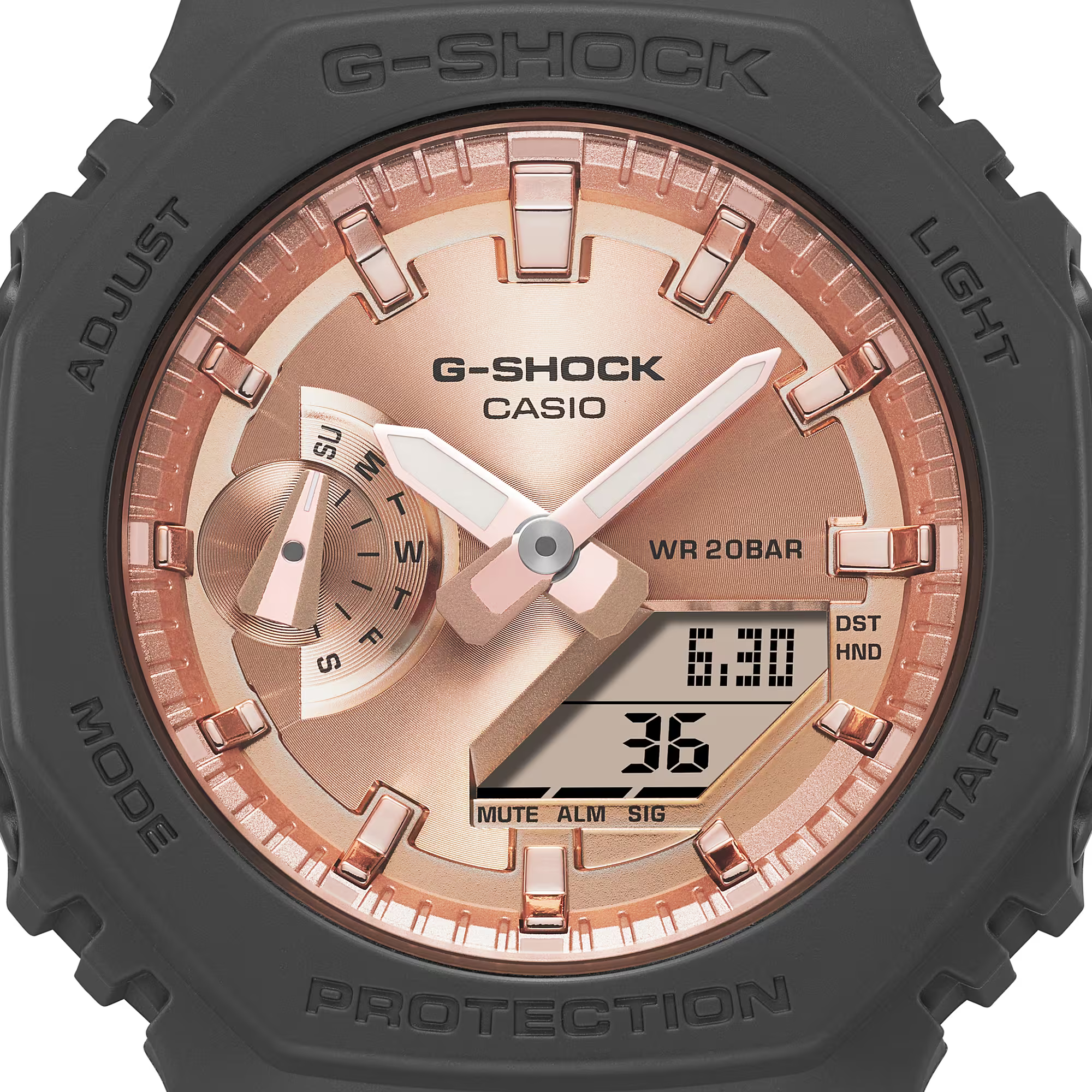 此GMA-S2100錶款具有粉紅金蒸鍍平面錶盤與簡約長條時標,流露極簡雅致的氣質,但仍閃耀出亮眼光芒的外觀。