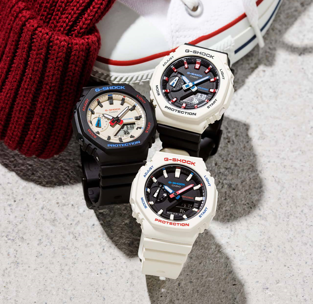 戴著經典八角形 G-SHOCK 歡慶冬季仙境,現在更擁有獨樹一格的三色設計。錶圈、時標和指針上的紅色和藍色裝飾突顯出中性的黑色和白色色彩配置,為從城市到冬季度假村的一切做好準備。將經典 G-SHOCK 外觀呈現在更小巧輕薄的外型中,無論在任何場合都能符合您的風格。
