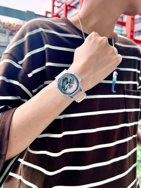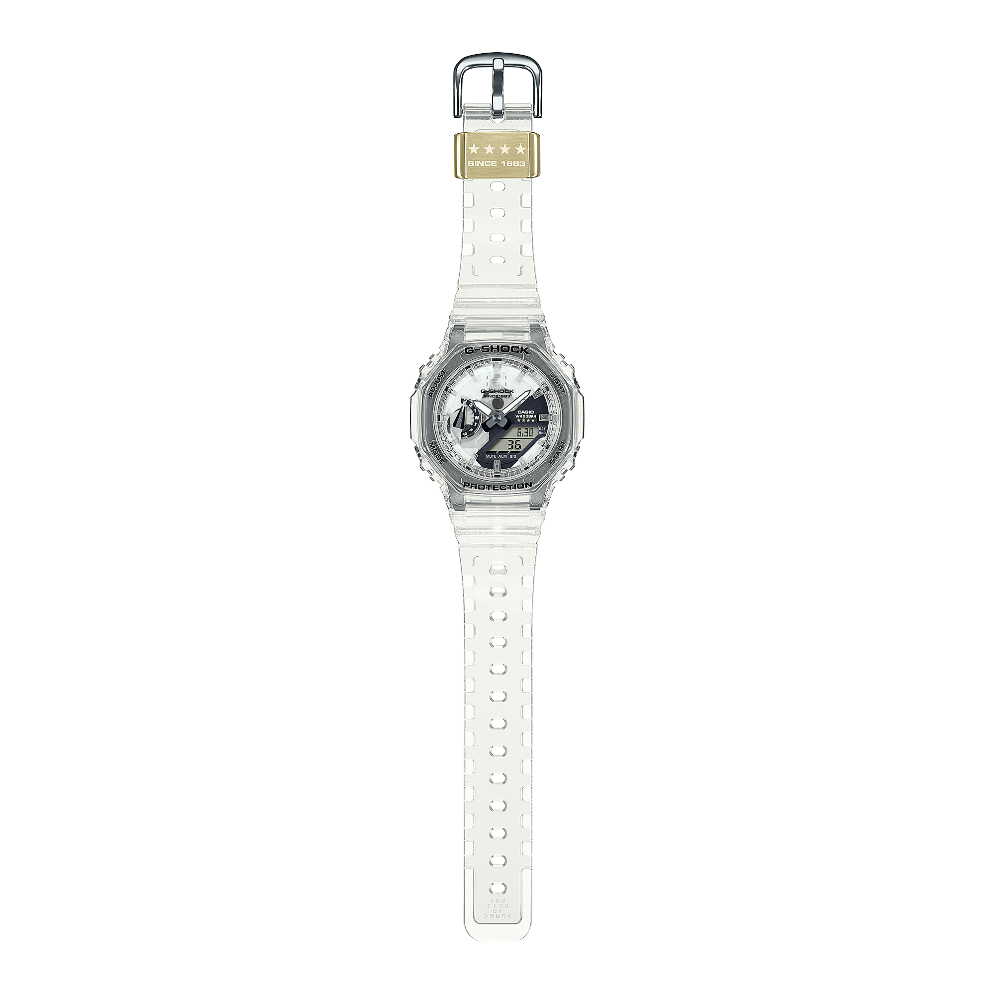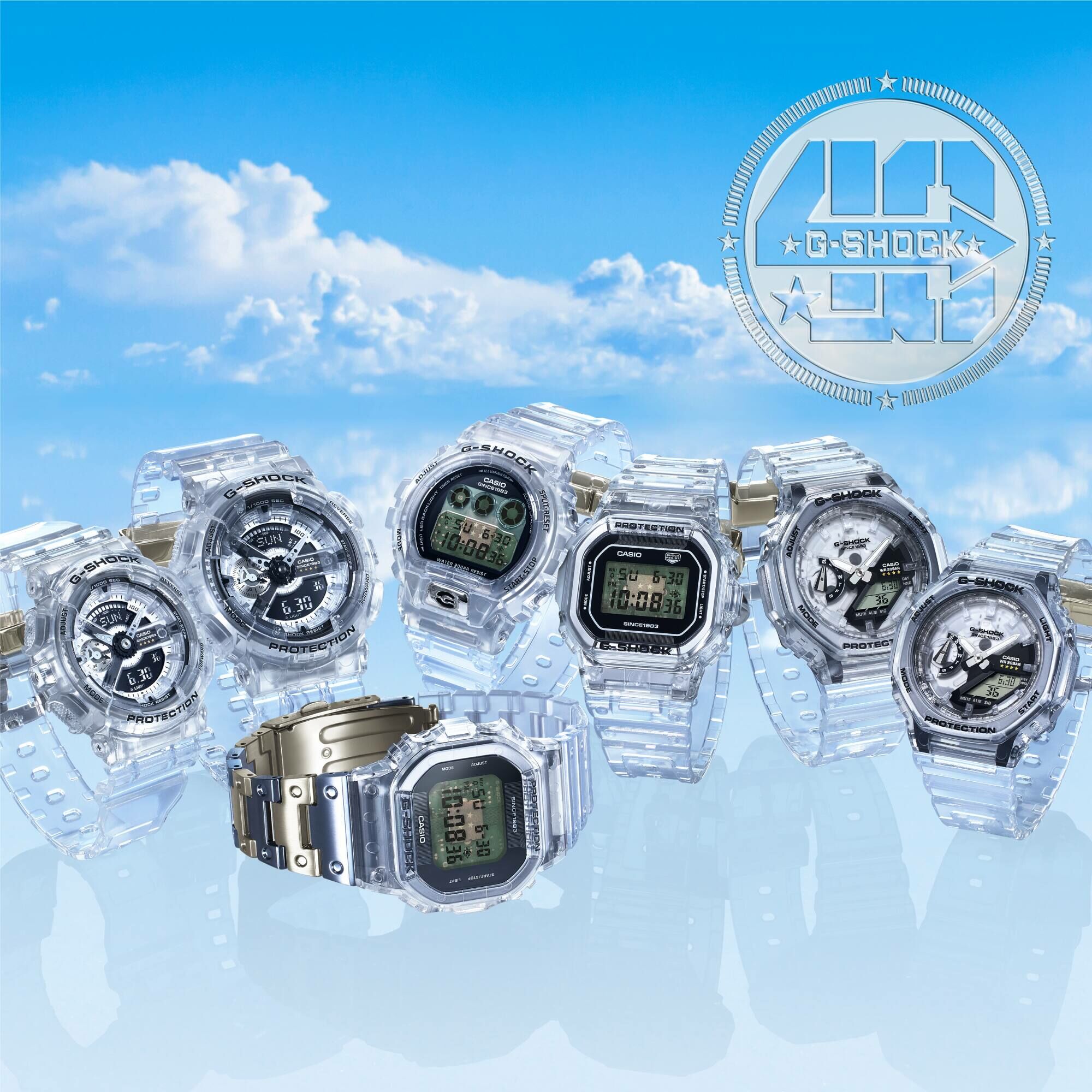 採用透明零件解構熱門的G-SHOCK設計,打造前所未有的清晰外觀。錶帶、錶殼、錶盤、LCD顯示和按鈕均使用透明材質,讓您能夠看到幕後的機芯底層,上面印有字母G和G-SHOCK Logo。背蓋有Eric Haze設計的40周年Logo,而錶帶環上刻有四顆星星,向這個特別的周年紀念日致敬。這些細節和首次使用透明玻璃纖維化合物製成的透明錶殼,提供一個獨一無二的設計,作為一款卓越的限量版G-SHOCK絕對當之無愧。這個全新系列收錄以多款經典G-SHOCK手錶為基礎的型號:首款G-SHOCK,DW-5000;經典的數位DW-5600;具有獨特正面按鈕設計的DW-6900