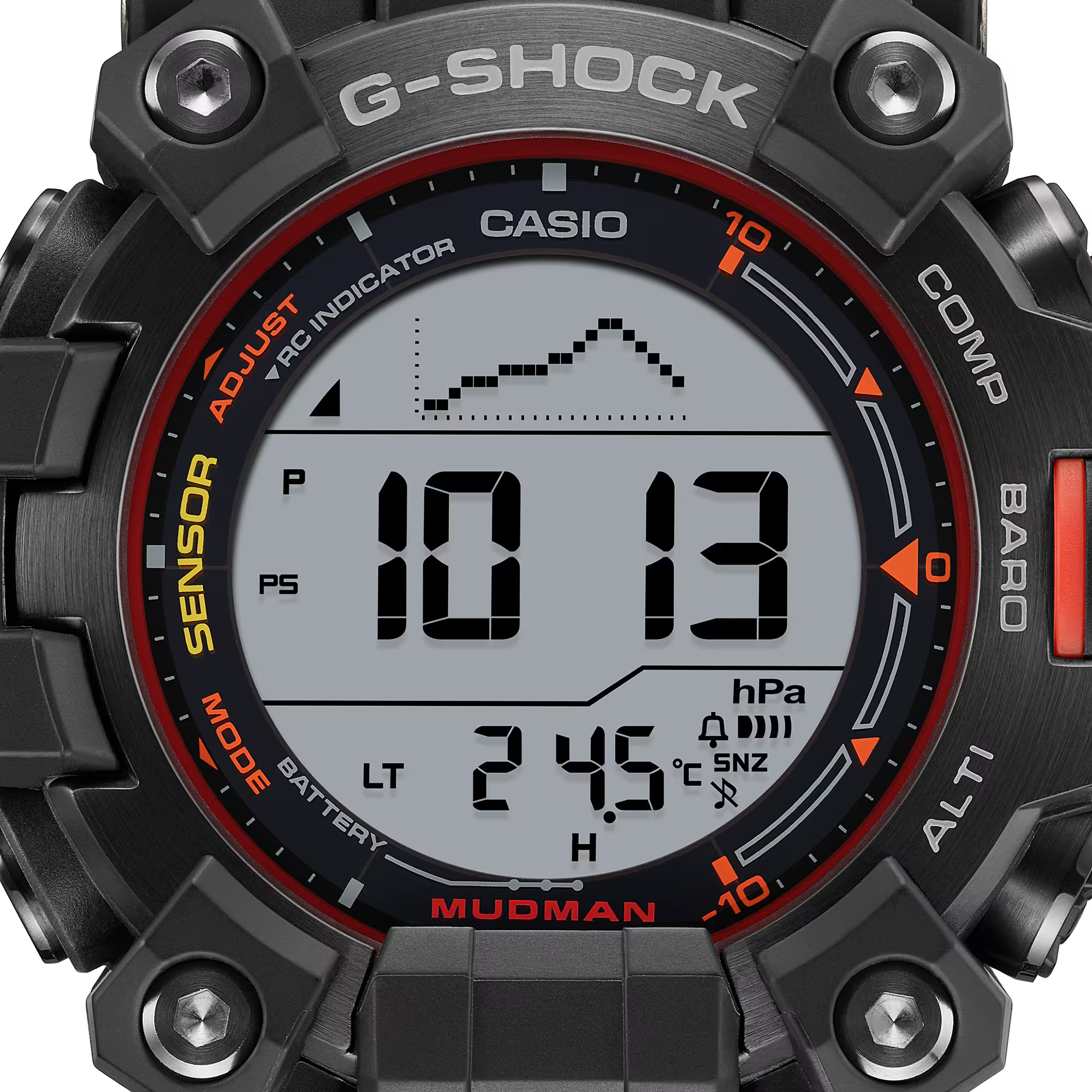 MUDMAN GW-9500MEC 不僅具備防塵、防泥和耐衝擊構造,它也提供六局電波控制、太陽能供電的功能。數位羅盤顯示採用雙層 LCD 改善可讀性,提供更強大的實用性。錶圈的不鏽鋼零件和黑色離子鍍膜,為手錶強悍無畏的外觀畫龍點睛。