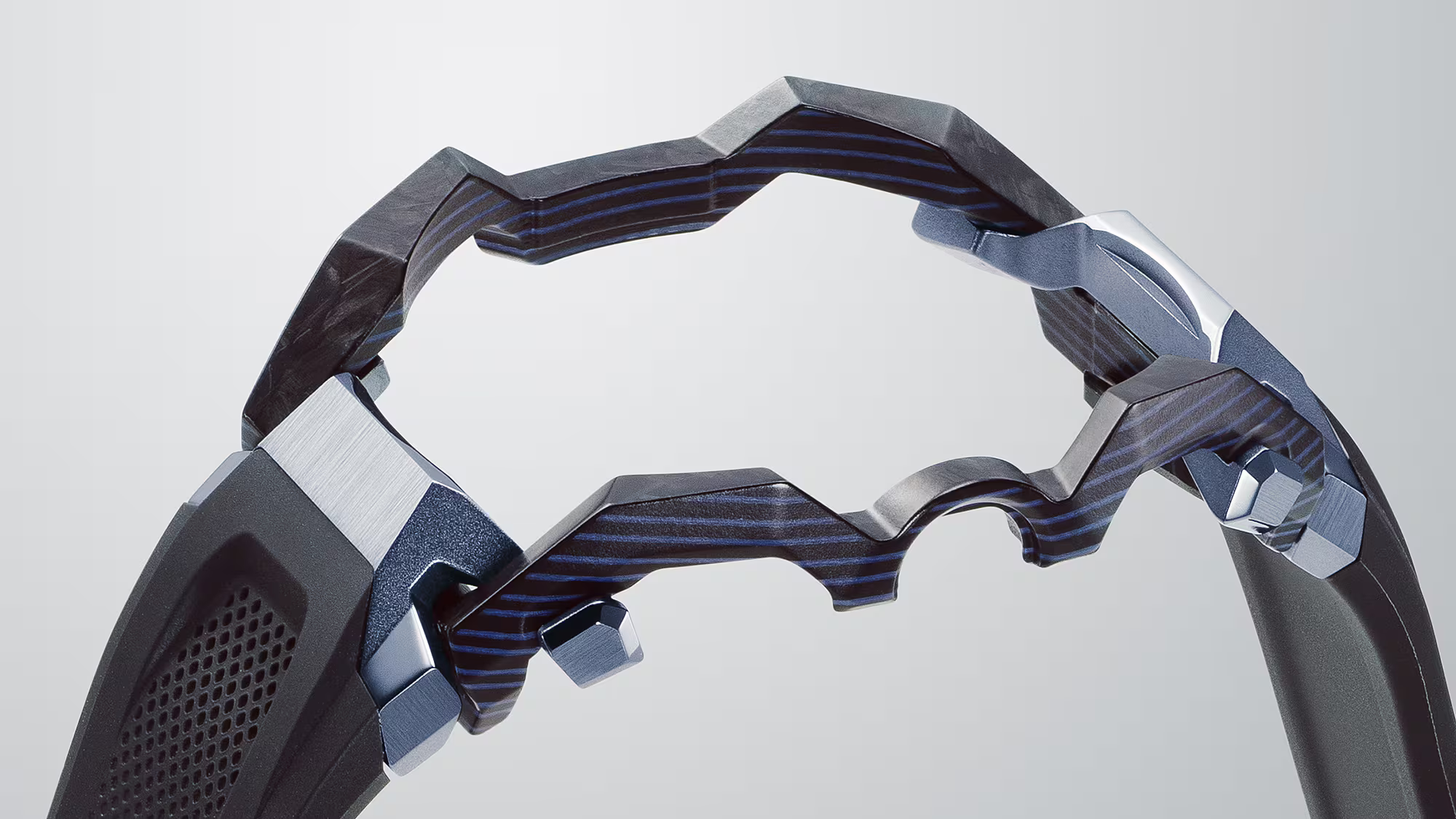 框架的細緻立體型態以層層堆疊的碳與玻璃纖維基材切割成形,打造出層次分明的美麗外觀。錶圈的不鏽鋼零件採用獨立的髮絲紋和鏡面表面處理,展現簡約而精緻的外觀。