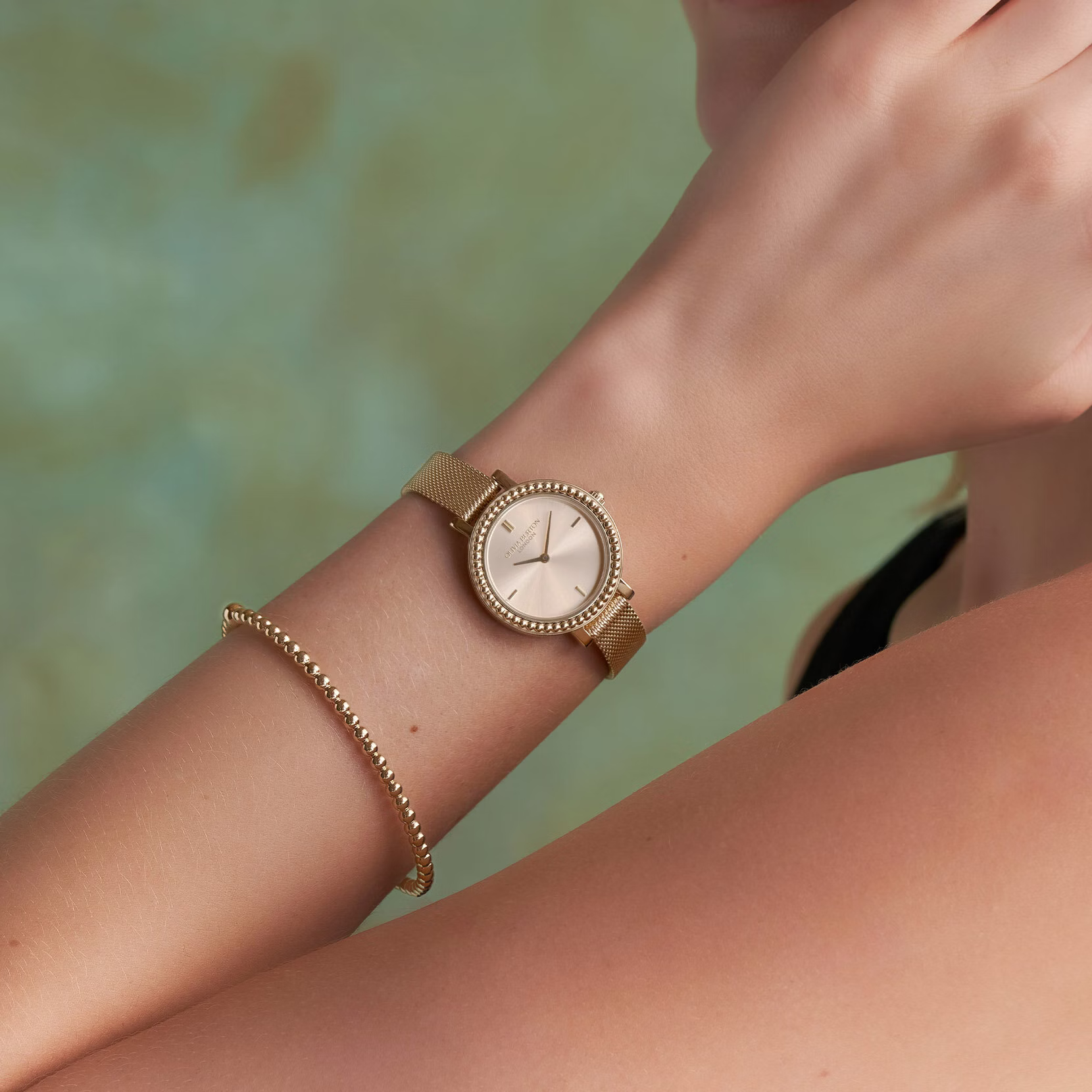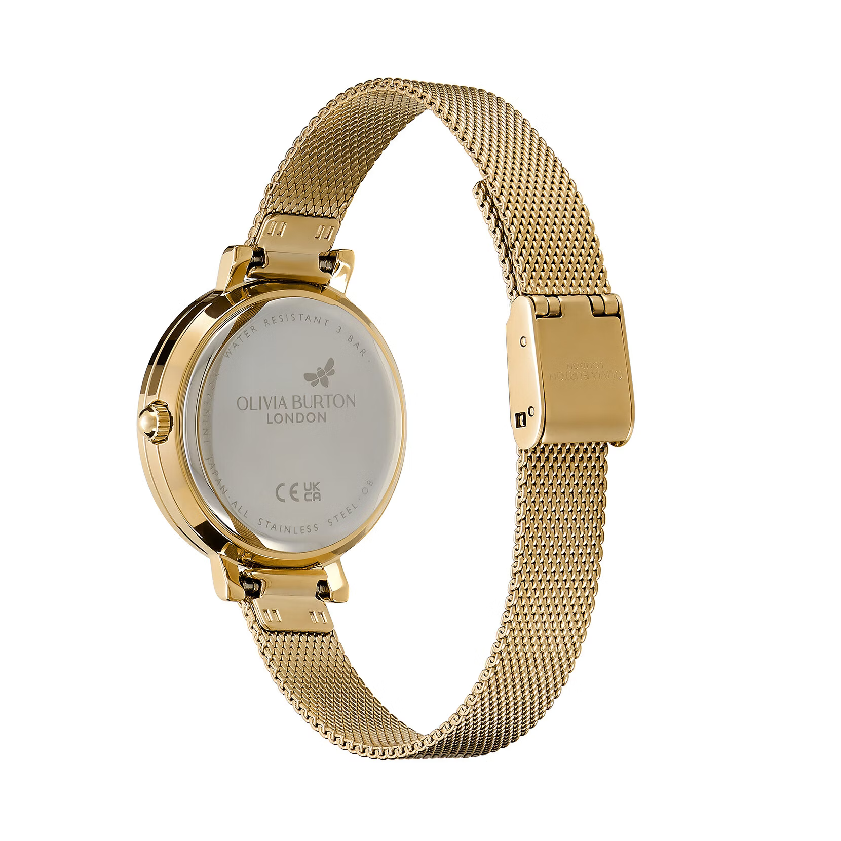 Olivia Burton Lucky Bee 閃曜登場 ! 28 mm 錶徑搭配經典蜜蜂浮雕圖騰與充滿華麗感的米蘭編織錶帶 ! 散發讓人愛不釋手的英倫質感魅力。