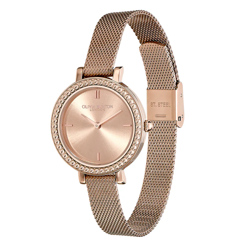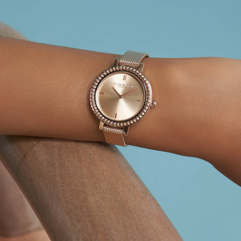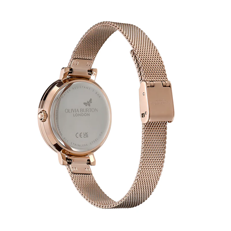 Olivia Burton Lucky Bee 閃曜登場 ! 28 mm 錶徑搭配經典蜜蜂浮雕圖騰與充滿華麗感的米蘭編織錶帶 ! 散發讓人愛不釋手的英倫質感魅力。