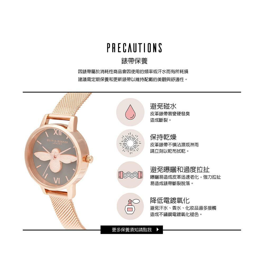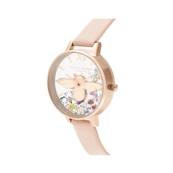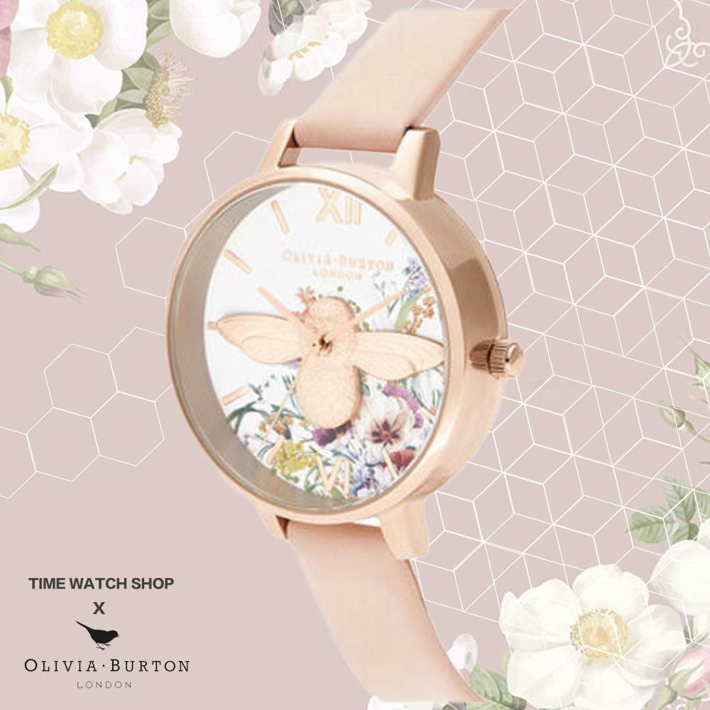 Olivia Burton 淡玫瑰金殼魔法花園3D大蜜蜂白面蜜桃粉皮帶腕錶