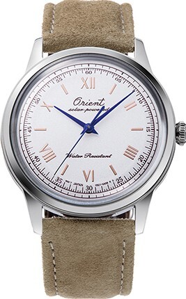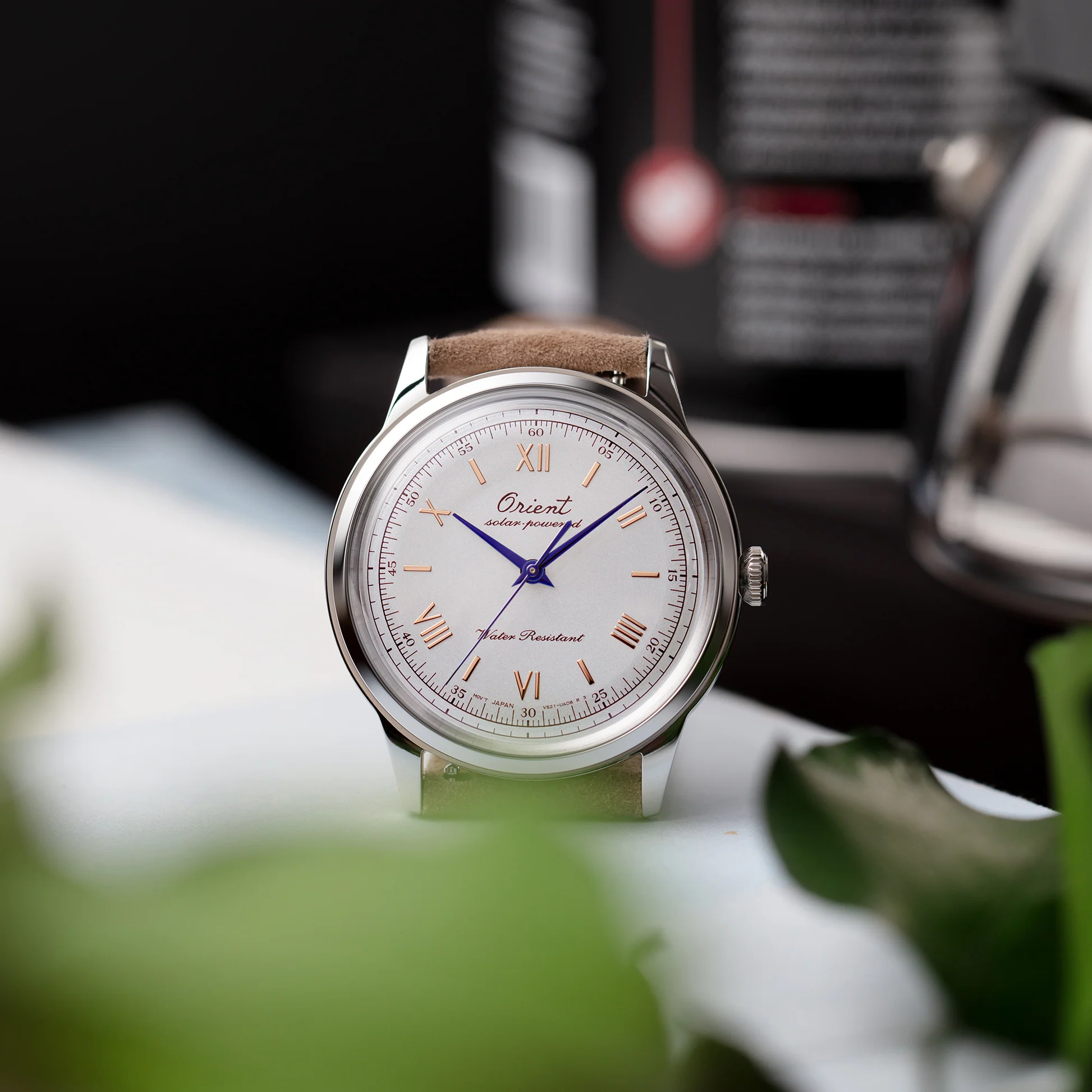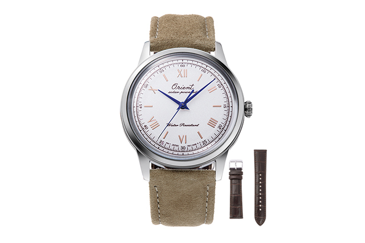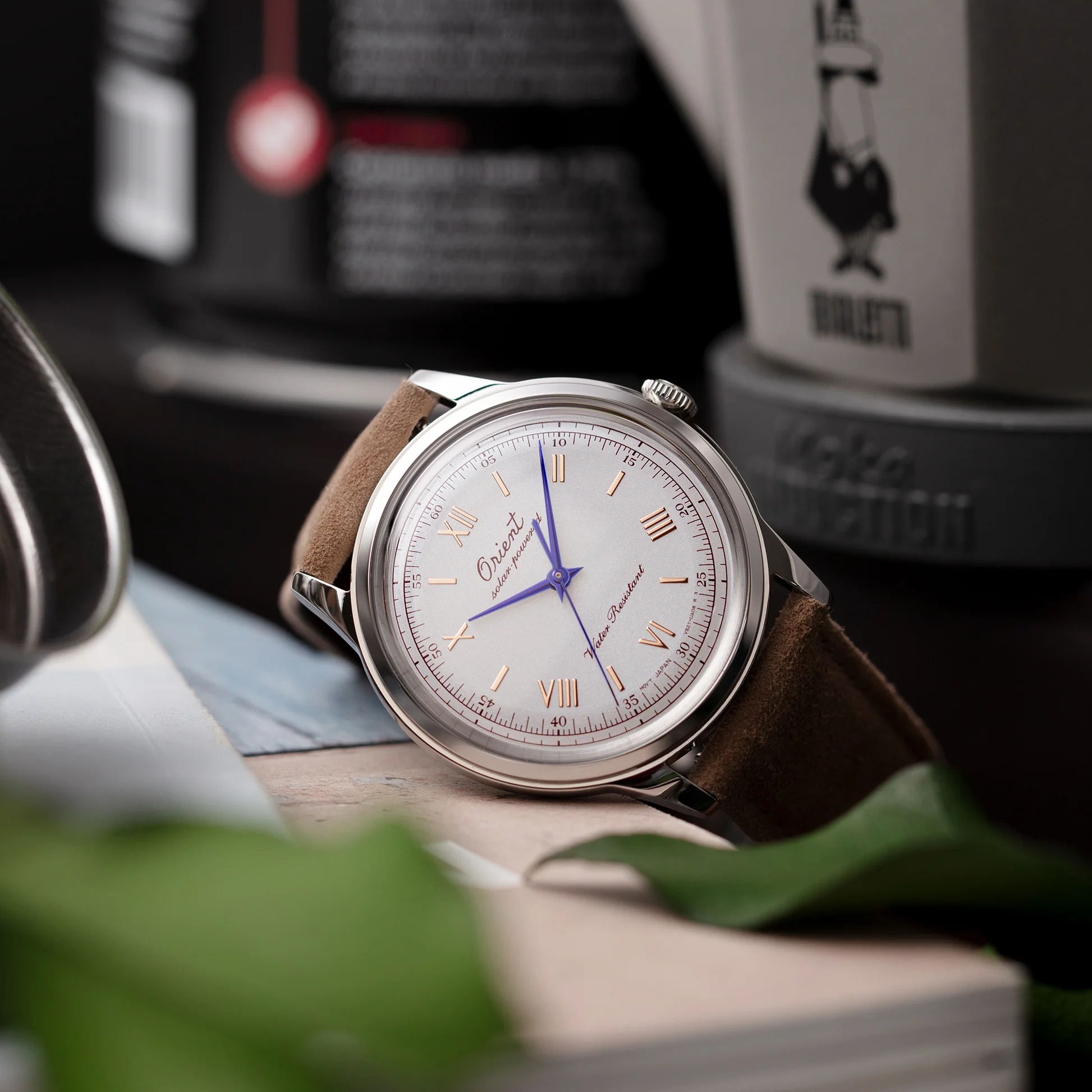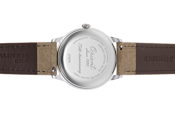 這款 38 MM經典腕錶,以其優雅的弧形錶盤、復古拱形錶鏡與纖細錶耳構成的精緻錶殼設計,完美展現經典機械錶的美學精髓。延續傳統風格的同時,錶款首度搭載太陽能機芯,能將陽光或室內光源轉化為電能,融合復古外觀與現代科技,體現東方錶對創新與傳承的堅持。為慶祝品牌邁入第 75 週年,Orient 推出此款限量紀念版,細節充滿對歷史的致敬。腕錶採用 1950 年代草書風格的經典「東方錶」標誌,搭配白色錶盤與藍色指針,營造出濃厚懷舊氛圍。復古質感的米色磨砂皮革錶帶,更為整體造型增添溫潤雅緻。錶背則鐫刻有「Orient Since 1950 75th Anniversary」字樣與限量編號,彰顯收藏價值。