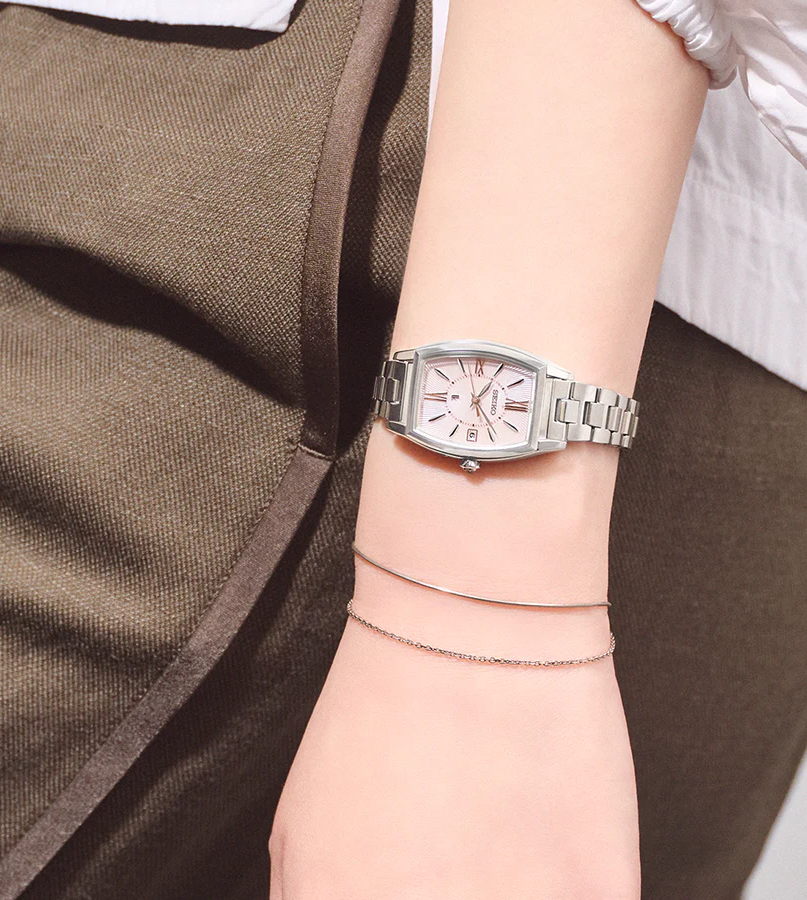這款酒桶型錶款採用了芍薬綻放時柔和的色彩,營造出清新的氛圍。