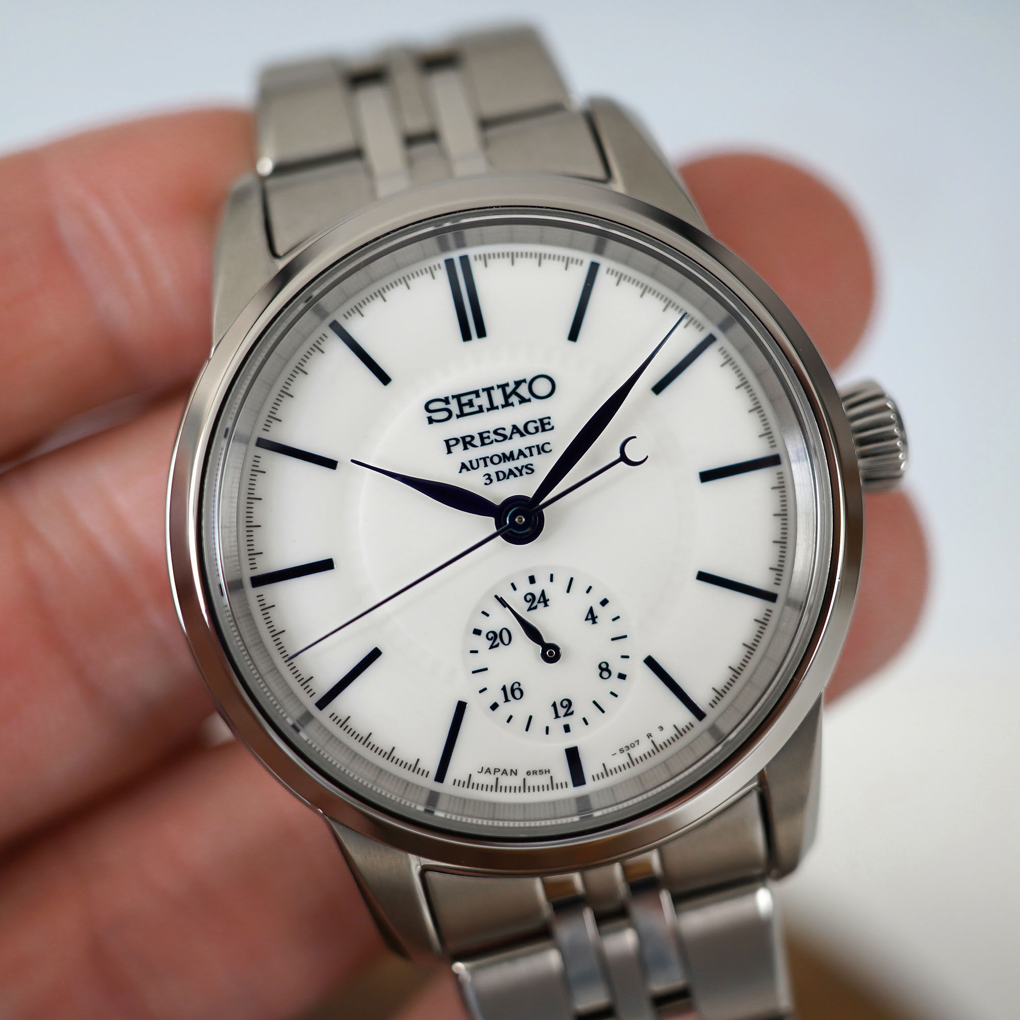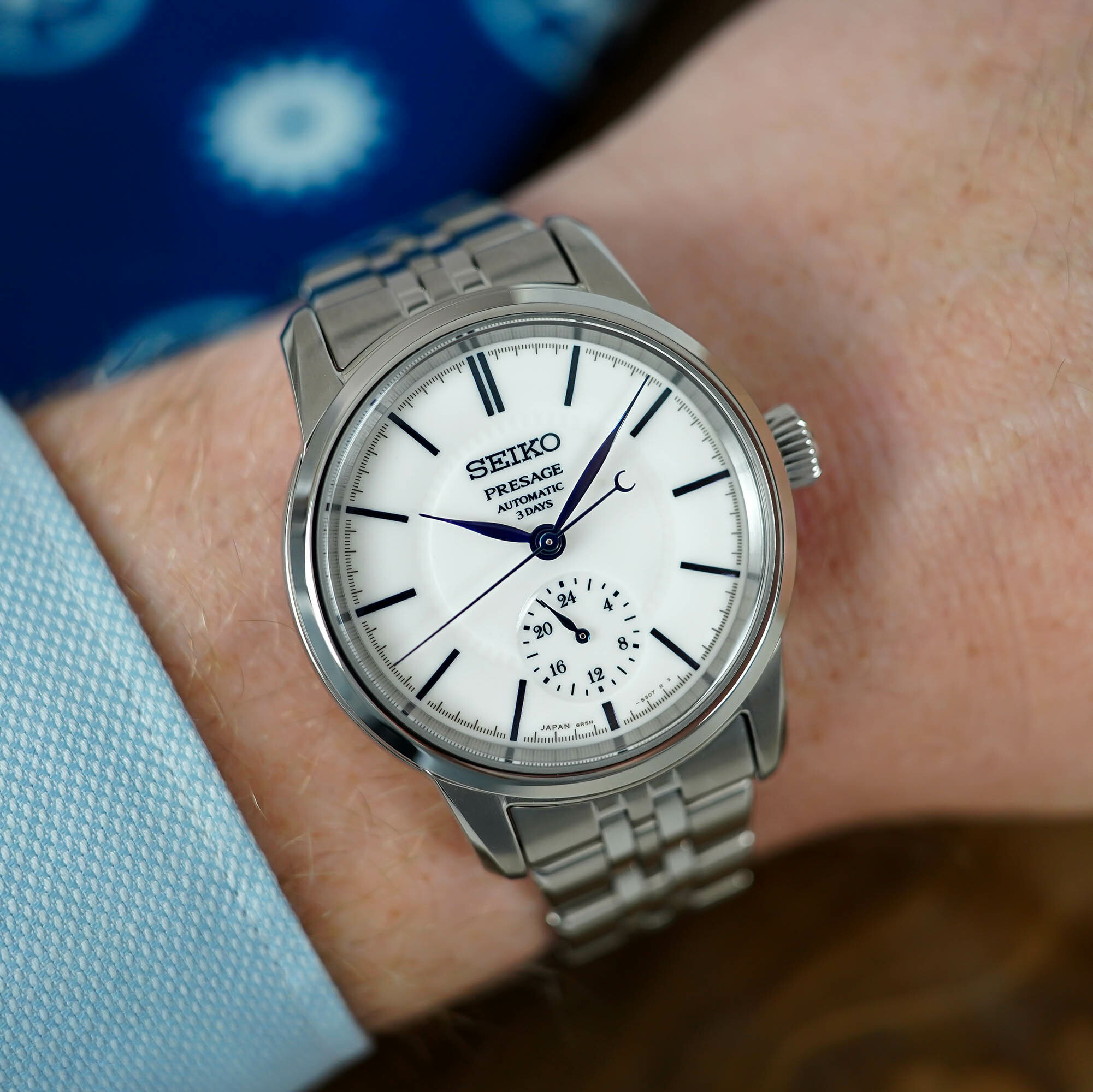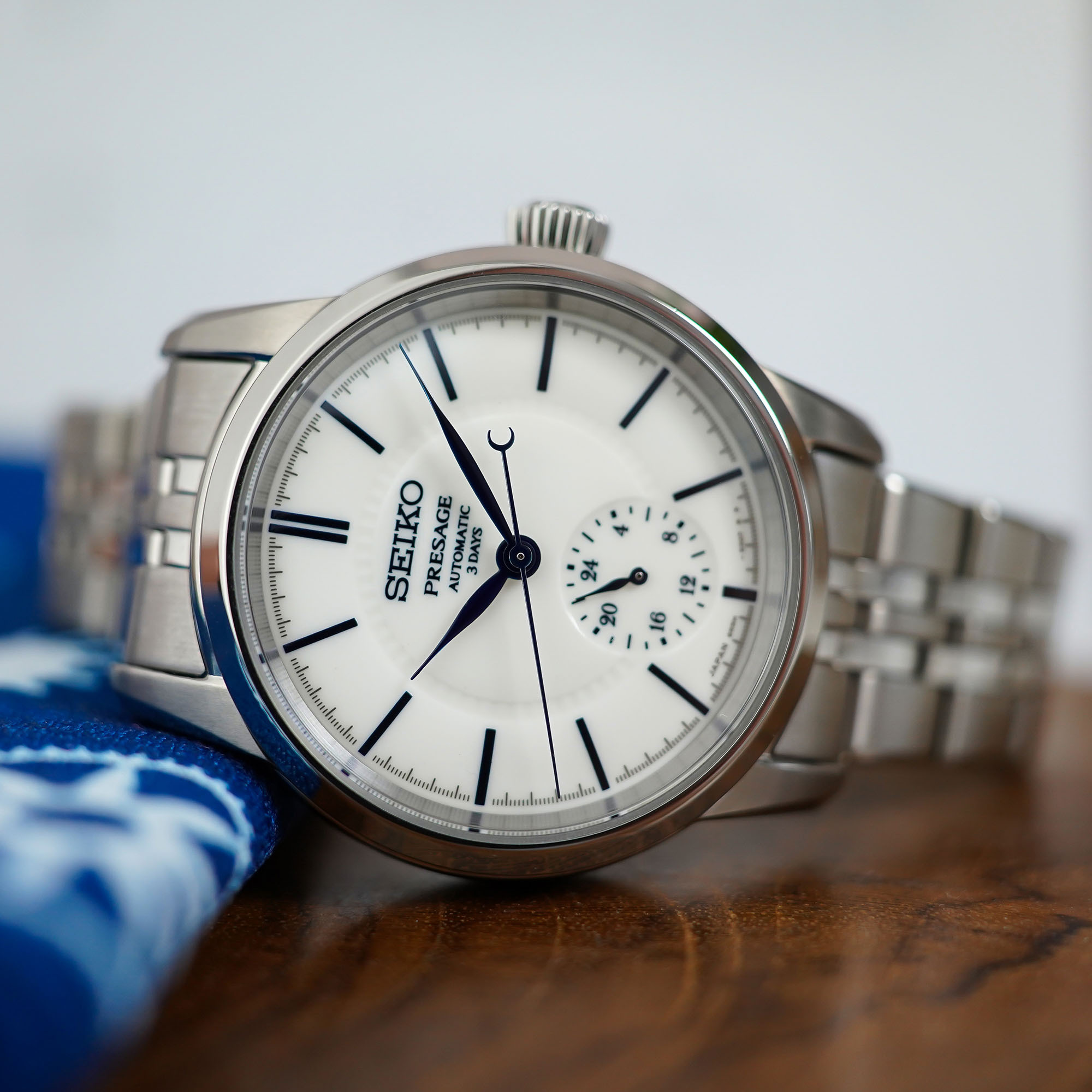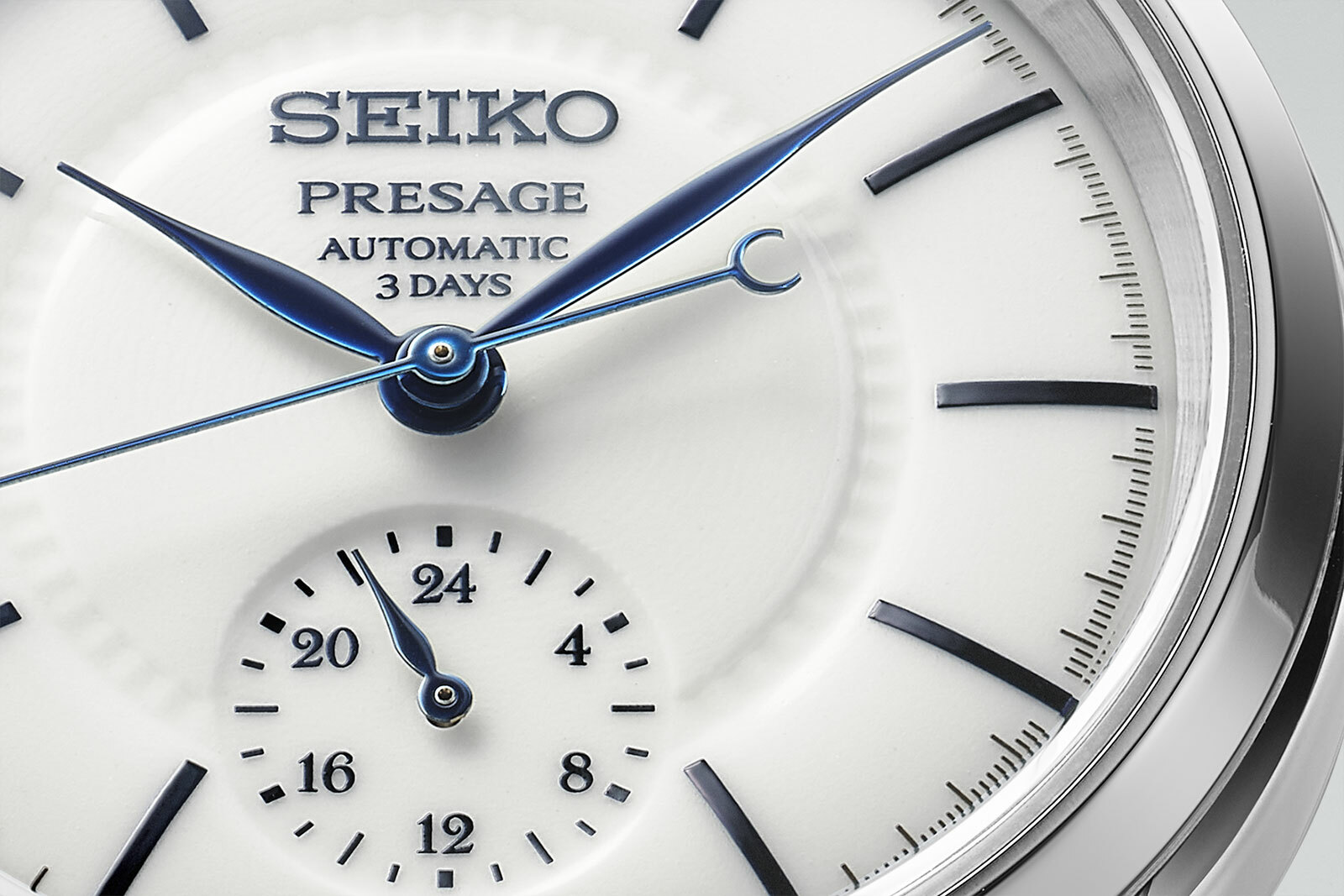 分針和秒針的前端面向時間刻度彎曲,提升時間視讀,而採用雙弧藍寶石鏡面則有效降低了錶殼的厚度。