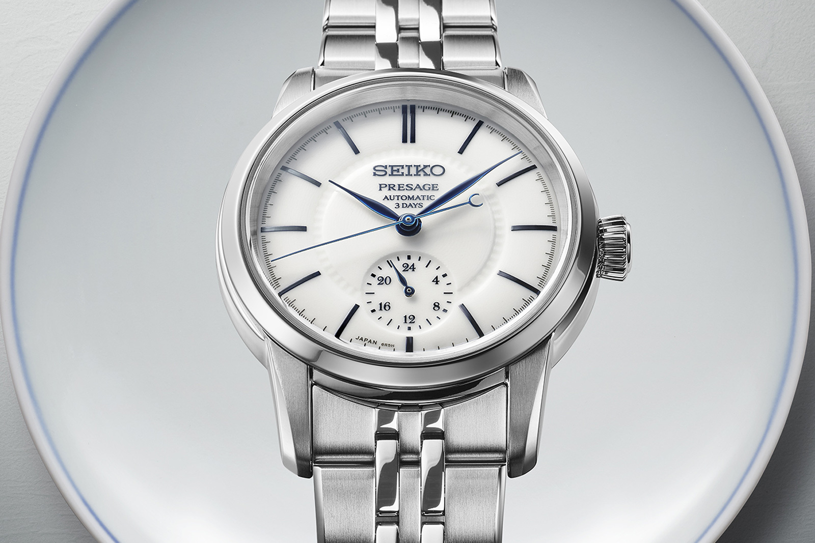 錶殼外型於優雅中融合了銳利的設計,配合多排鏈帶,不僅舒適貼合手腕,同時突顯有田燒面盤特有的光澤。