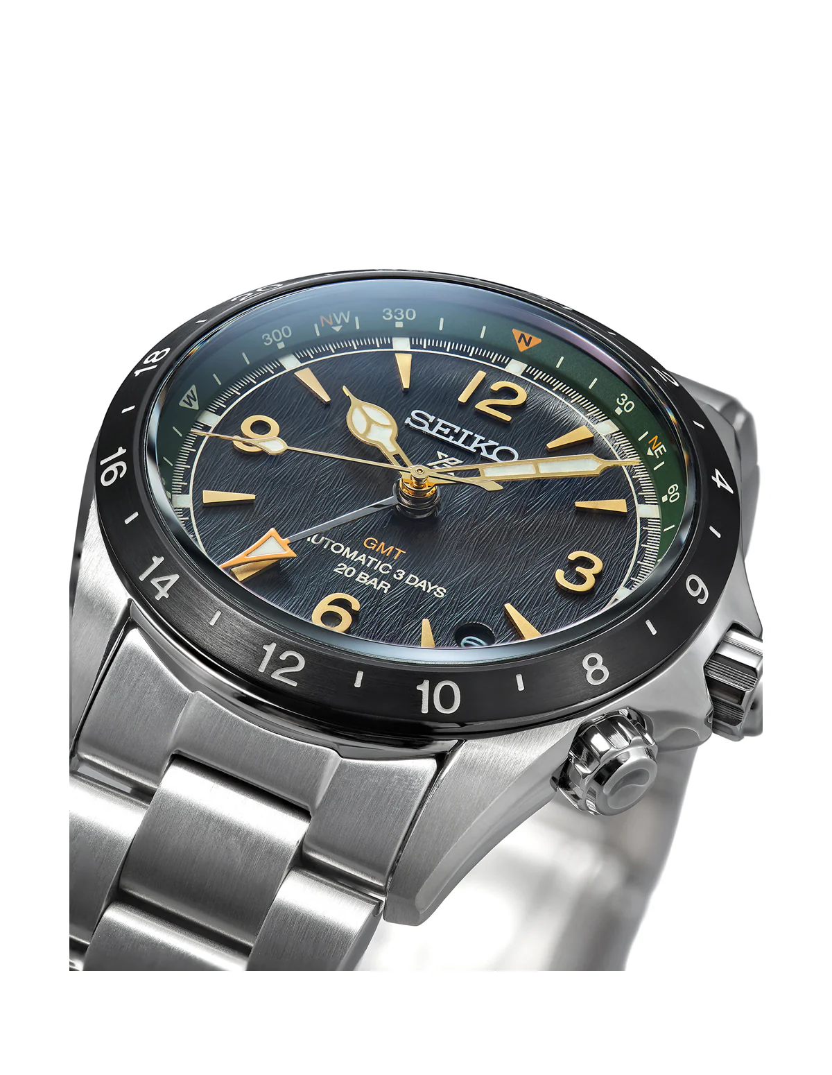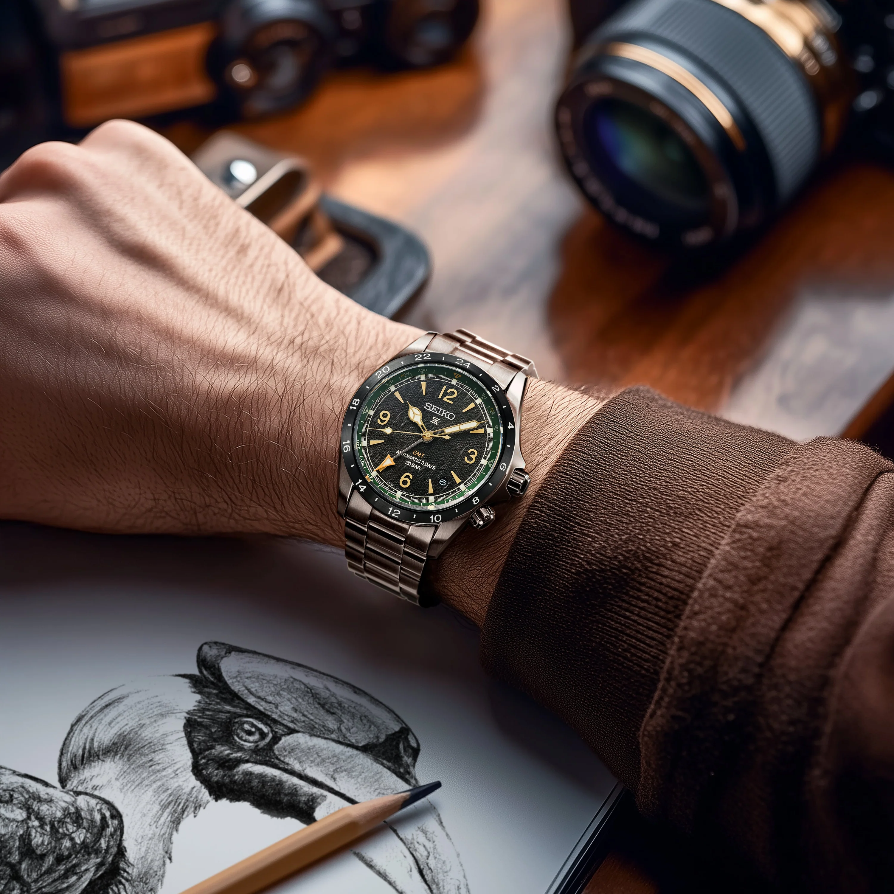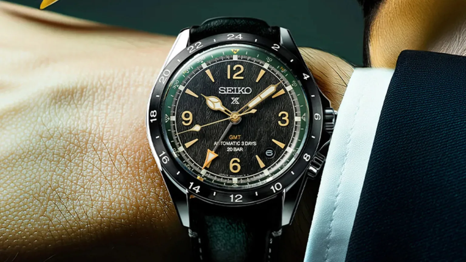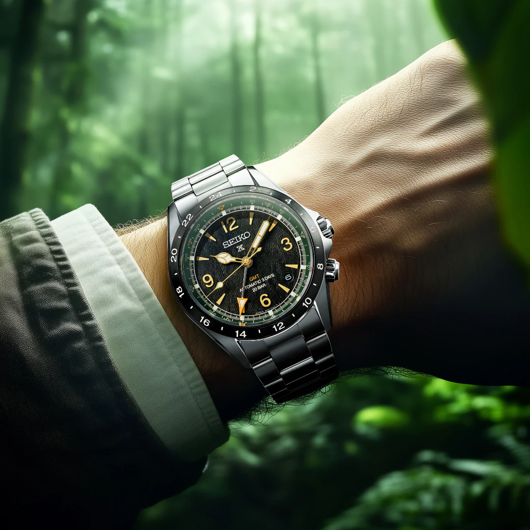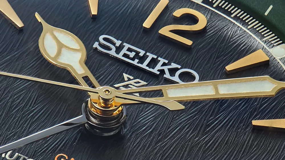 錶款以棕色面盤搭配深綠色內圈設計,黑色的錶圈與金色的指針、時標形成對比,附有牛皮錶帶的套裝組合。