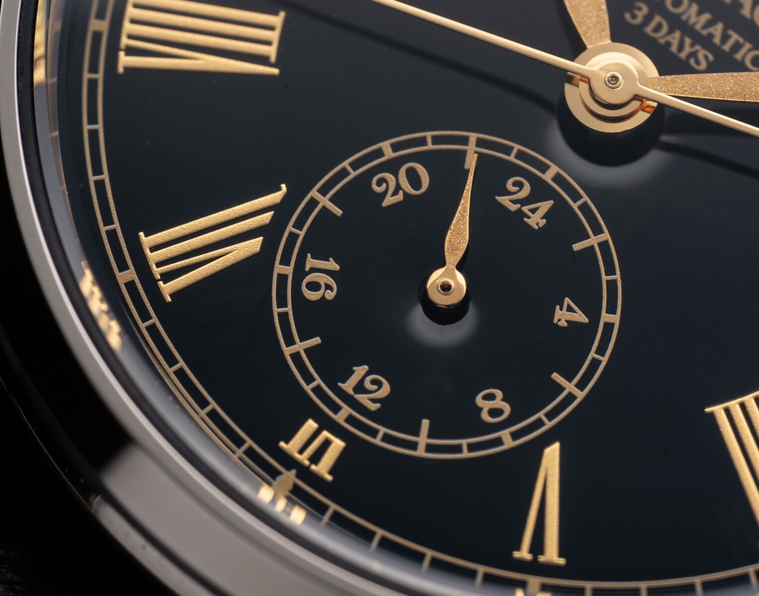 經過多次反覆塗漆與研磨而呈現光澤的漆黑色彩,與厚實的金色羅馬數字形成對比,展現豪華的色彩運用。