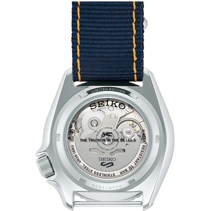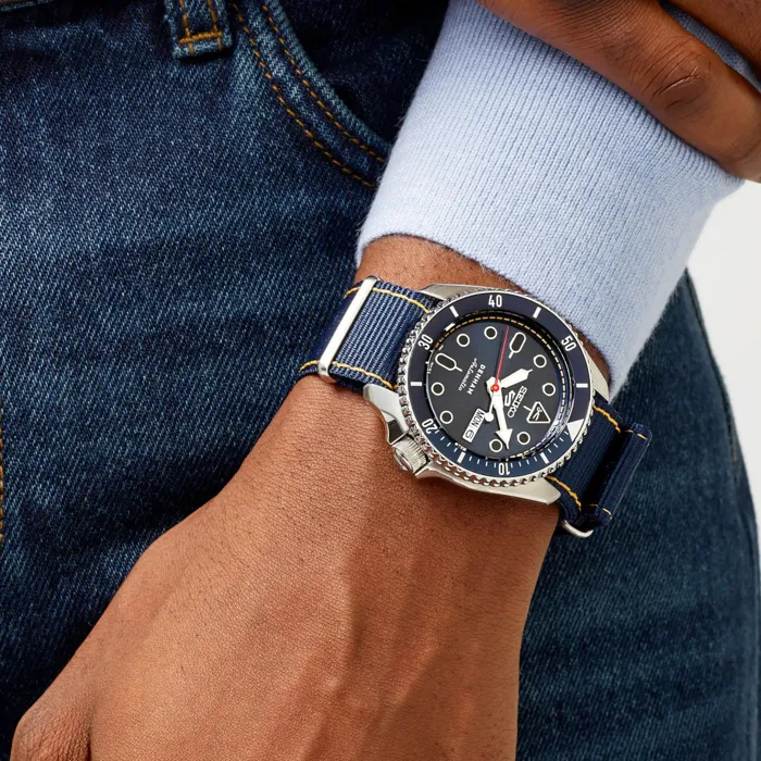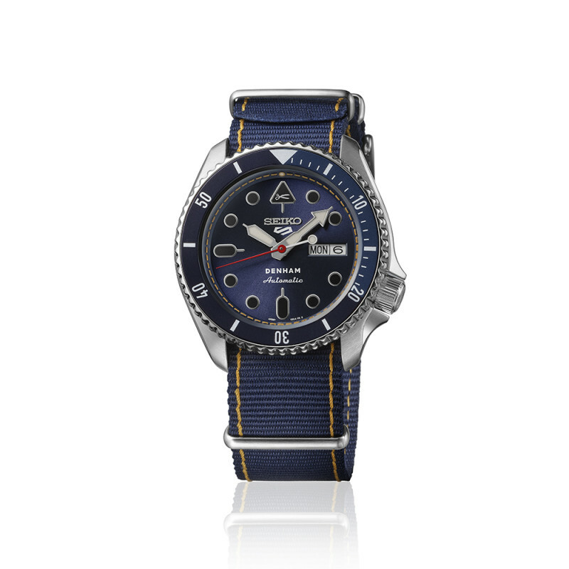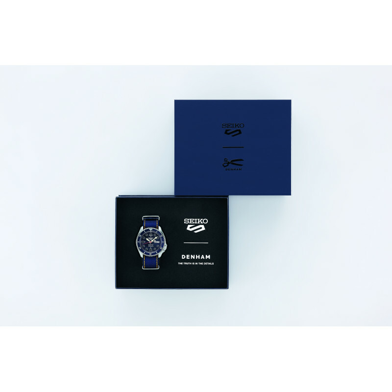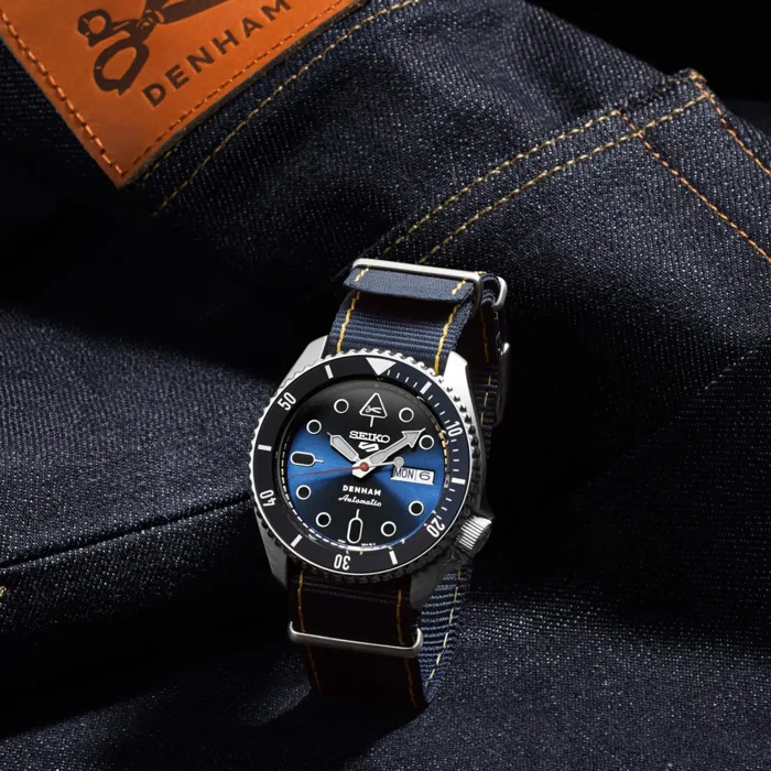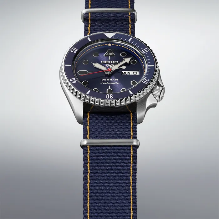 DENHAM 時尚品牌由英國牛仔褲製造商 Jason Denham 於 2008 年在阿姆斯特丹創立。秉持著「真理在於細節」的概念,腕錶配備了品牌特有的細節。根據DENHAM的想法定制的SKX錶殼作為整體設計基礎。深牛仔藍錶盤飾有對比鮮明的縫線,讓人想起 Denham 的精湛工藝。耐用的藍色尼龍錶帶強調運動休閒美感,不僅舒適,而且極其耐用。此款式是日常穿著的完美伴侶,可為任何服裝增添休閒氣息。