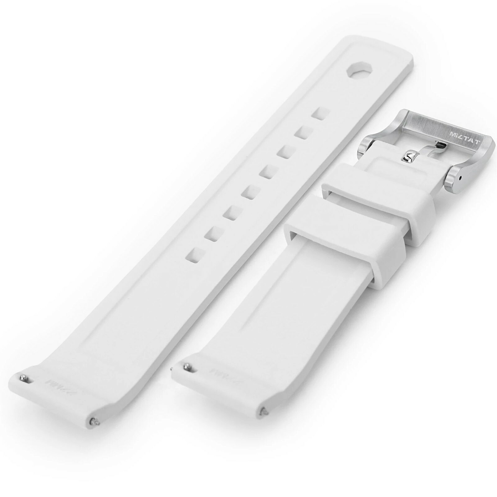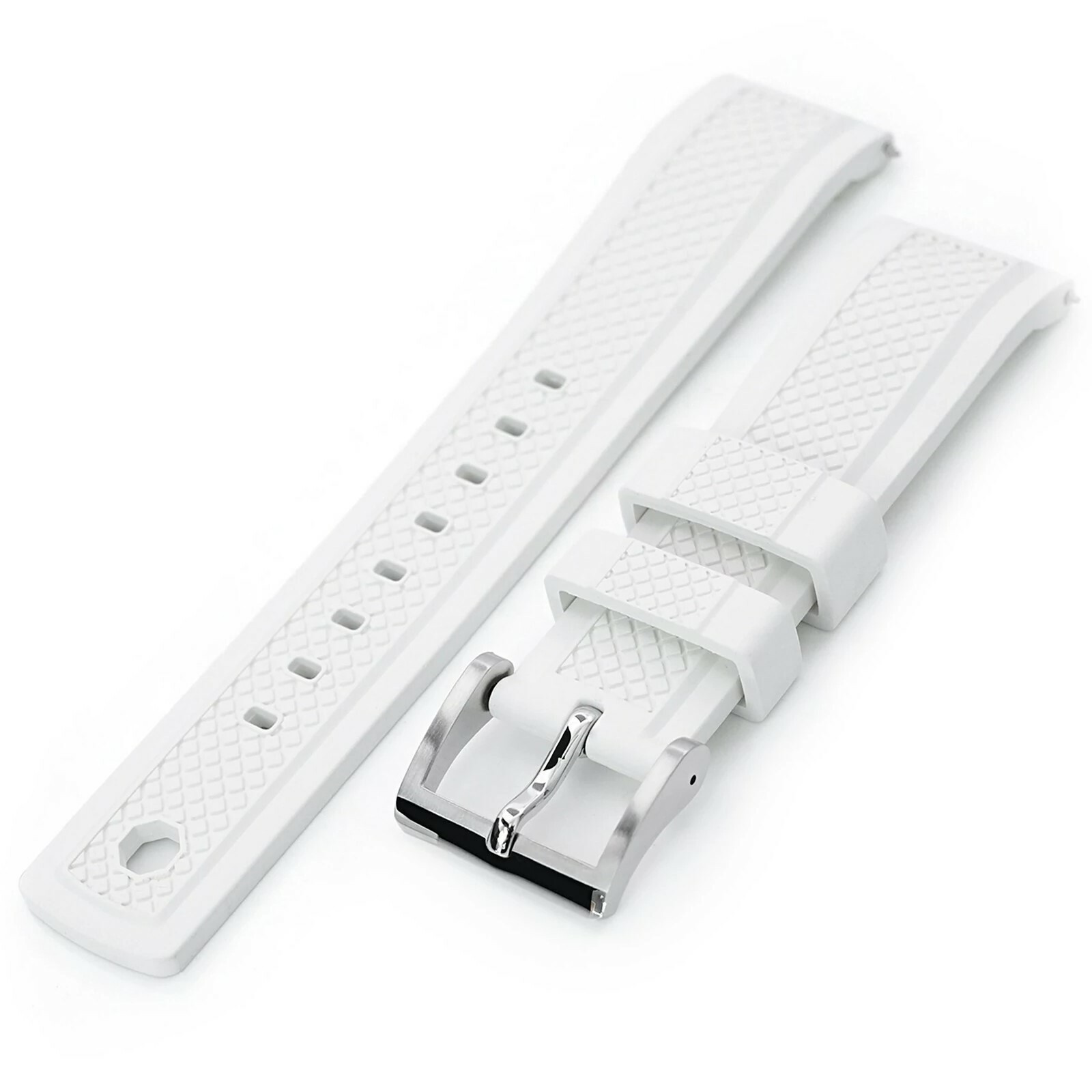 FKM 系列的 'Crisscross十字形' 橡膠錶帶的特點是突出的中心部分具有 '交叉網格' 輪廓,和新的聰明"尾鎖"細節。錶帶環採用創新設計 -內藏突出的六邊形立方體,可鎖定錶帶於帶終端的尾孔。'Crisscross十字形' 是一種快速釋放的 FKM 橡膠錶帶,只需用指尖拉動小旋鈕即可縮回彈簧桿,接著將錶帶拔出或裝回錶耳孔,無需使用任何工具,即可輕鬆換錶帶。'Crisscross十字形'系列的橡膠錶帶有三種顏色可供選擇,絕對會讓您的手錶煥然一新。